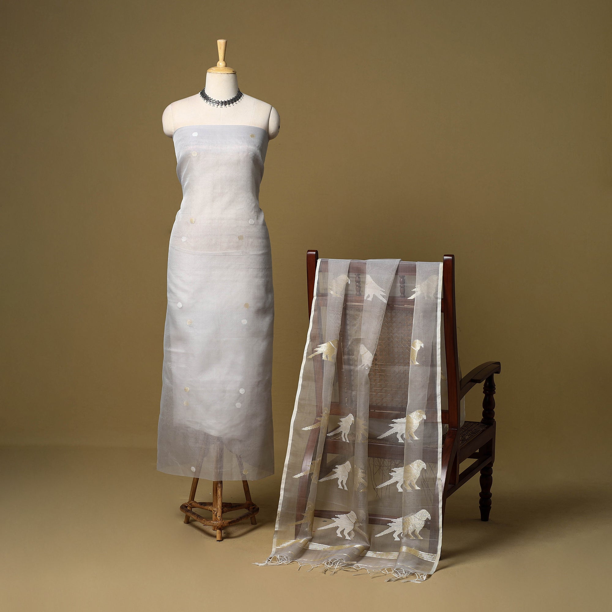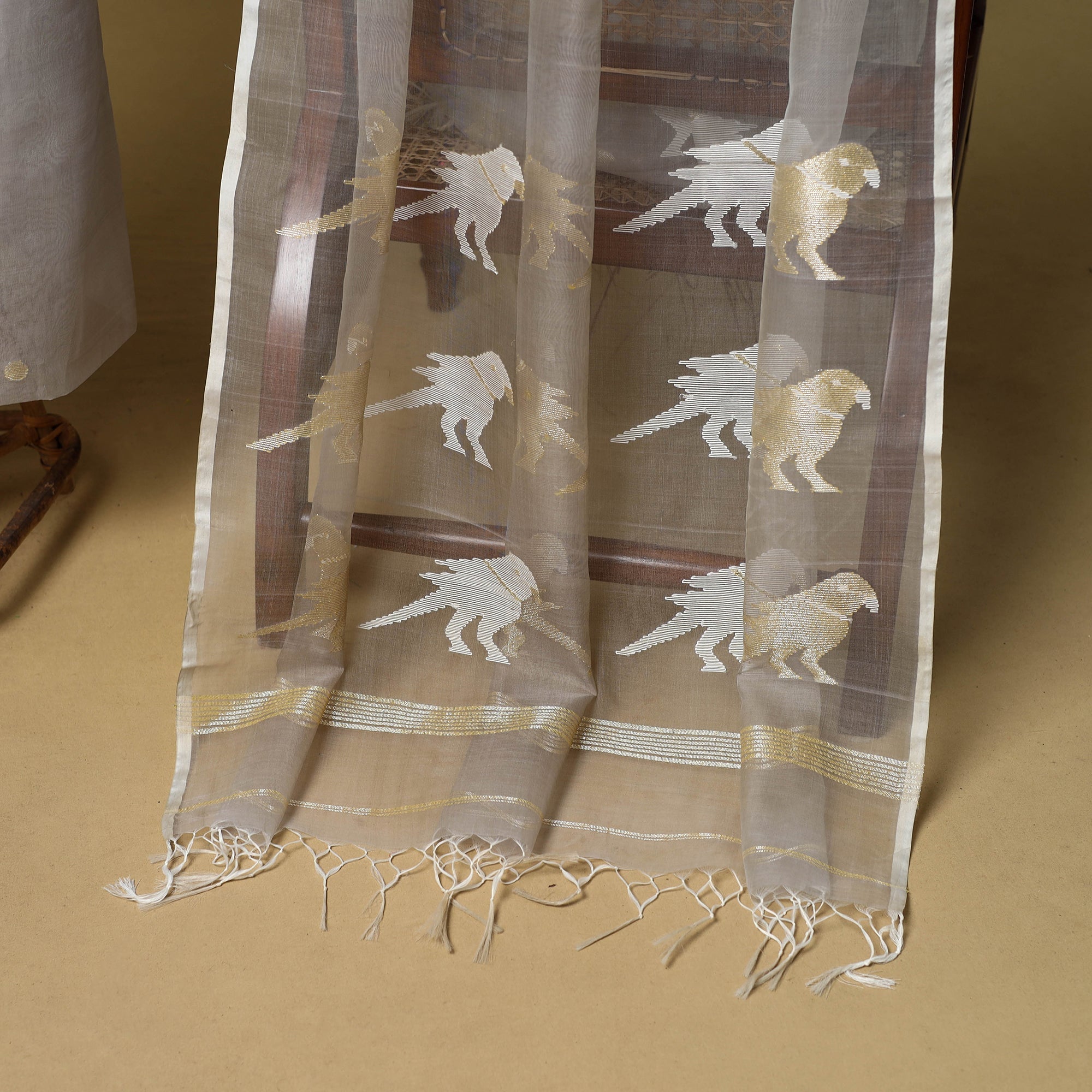 White 2pc phulia jamdani weaving mulberry silk dress material from Bengal. It is made using the extra-weft method, where each motif is added by hand, giving it an embroidered look. The design is created with small shuttles that carry coloured or metallic threads through the base weave. Jamdani is known for its fine, detailed patterns. The set includes kurta fabric and a tassel detailed dupatta, suitable for daily or festive wear.