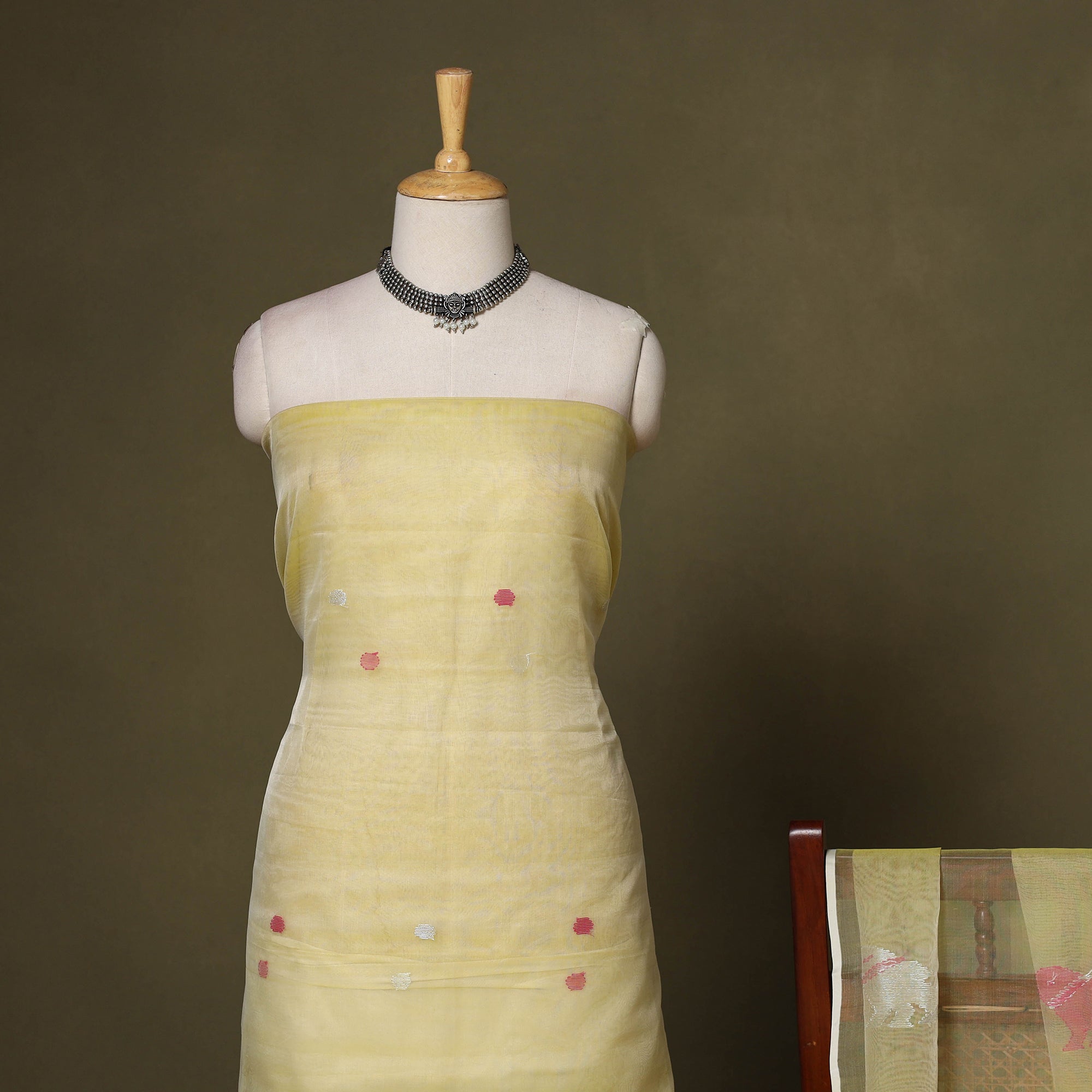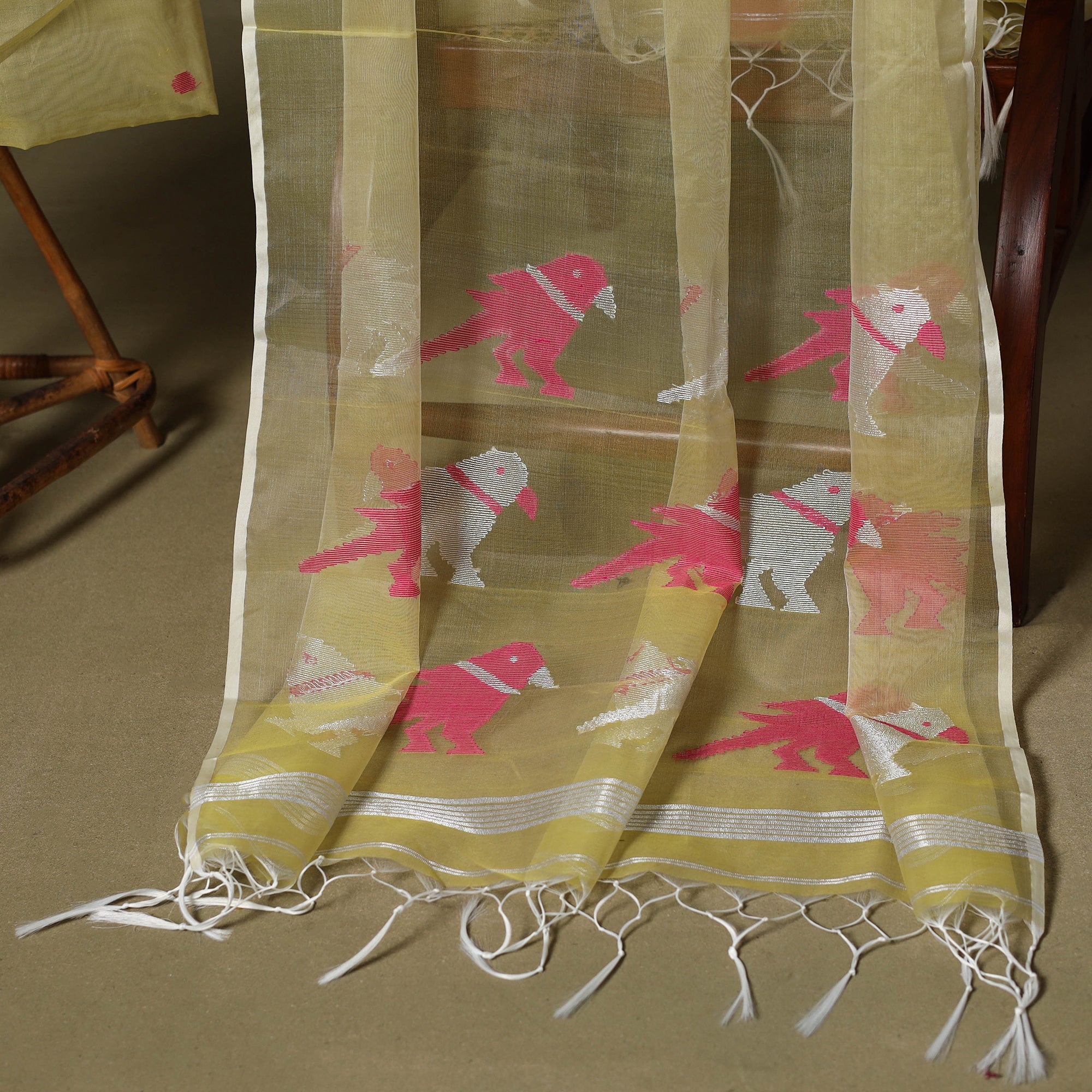 Celebrate Bengal’s weaving heritage with this yellow 2pc phulia jamdani handloom mulberry silk dress material. Woven using the extra-weft technique, the butis resemble embroidery. The method mirrors tapestry work, with small shuttles of coloured, gold, or silver threads passed through the warp. Known for its intricate patterns, Jamdani is time-intensive. Includes kurta fabric and a tassel-detailed dupatta, perfect for daily wear or festive looks.