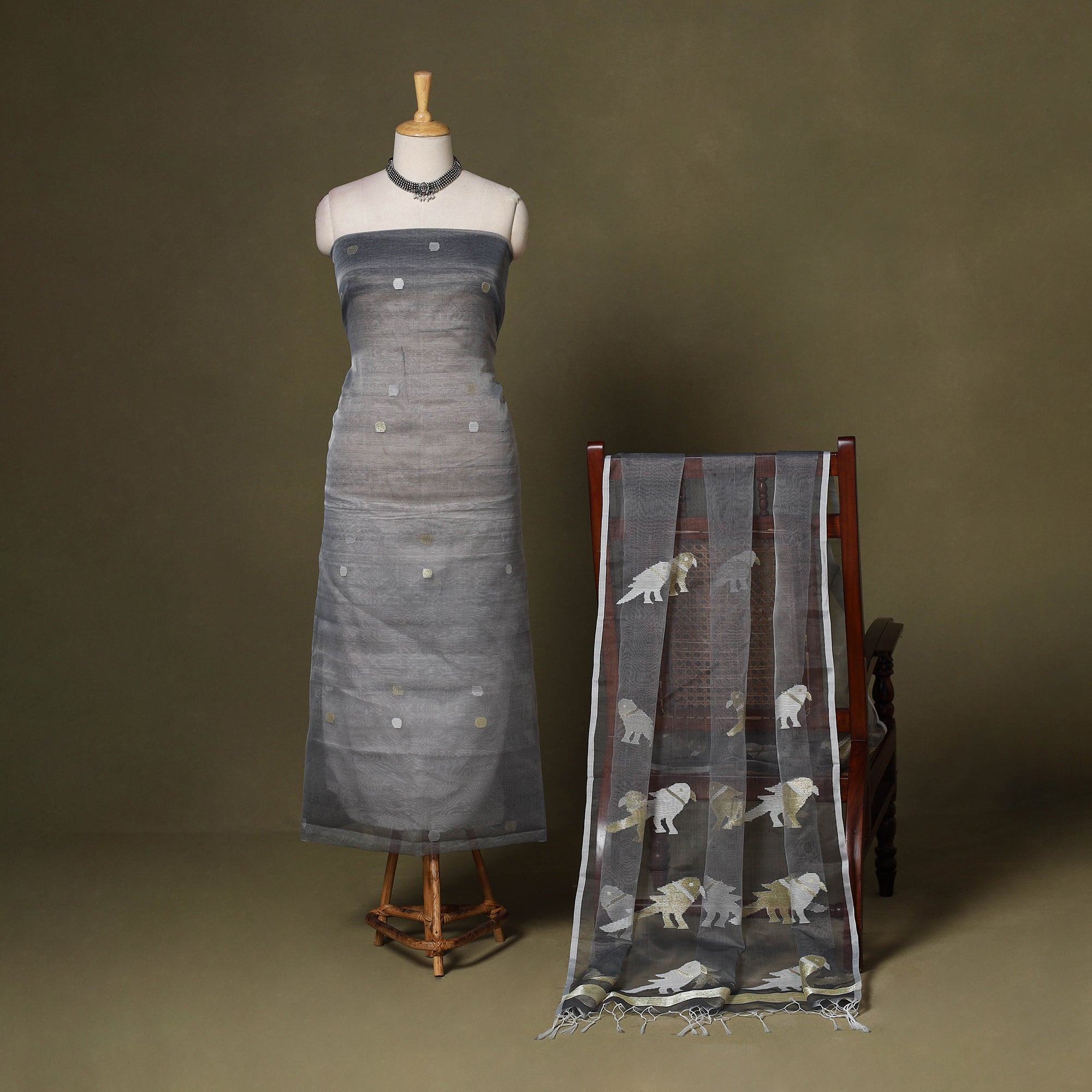 Celebrate Bengal’s weaving heritage with this grey 2pc phulia jamdani handloom mulberry silk dress material. Woven using the extra-weft technique, the butis resemble embroidery. The method mirrors tapestry work, with small shuttles of coloured, gold, or silver threads passed through the warp. Known for its intricate patterns, Jamdani is time-intensive. Includes kurta fabric and a tassel-detailed dupatta, perfect for daily wear or festive looks.