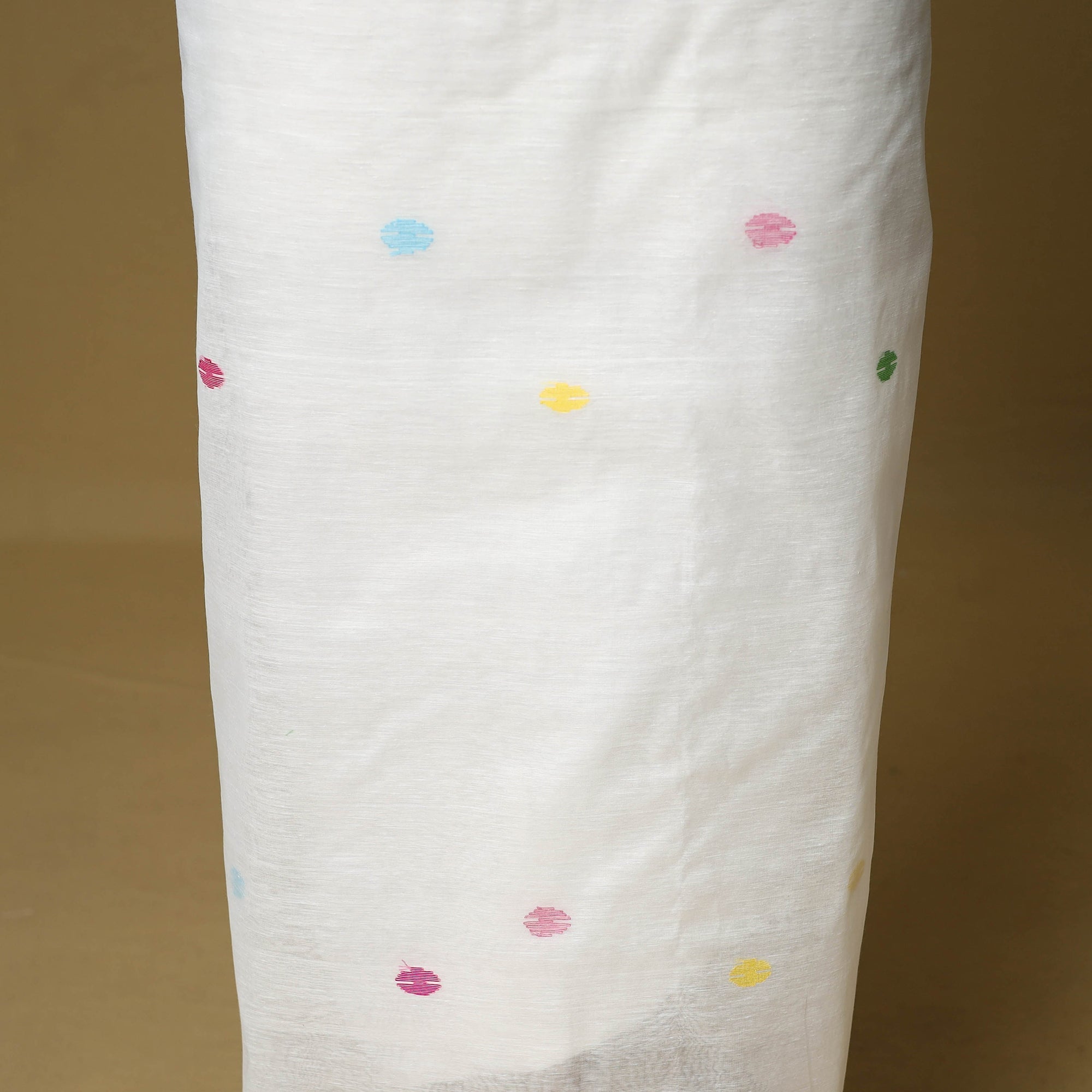 White 2pc phulia jamdani weaving silk-cotton dress material from Bengal. It is made using the extra-weft method, where each motif is added by hand, giving it an embroidered look. The design is created with small shuttles that carry coloured or metallic threads through the base weave. Jamdani is known for its fine, detailed patterns. The set includes kurta fabric and a tassel-detailed dupatta, suitable for daily or festive wear.