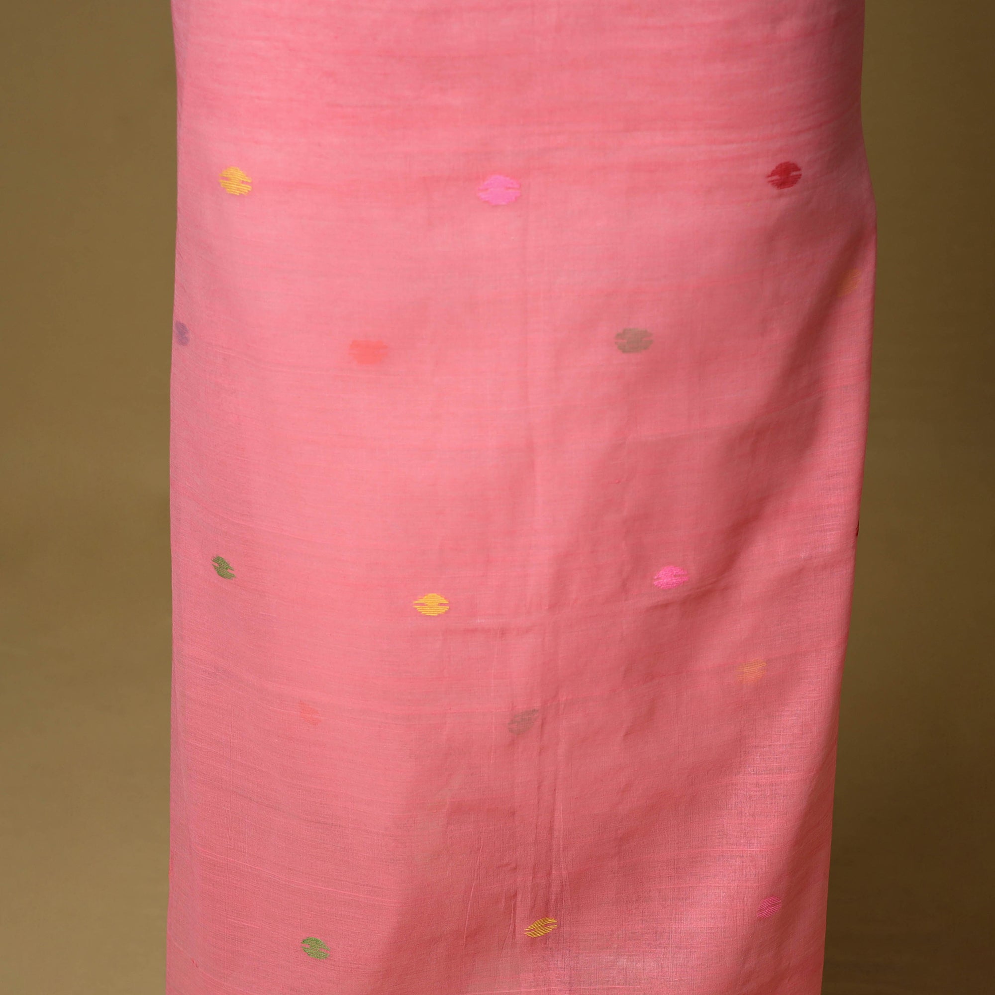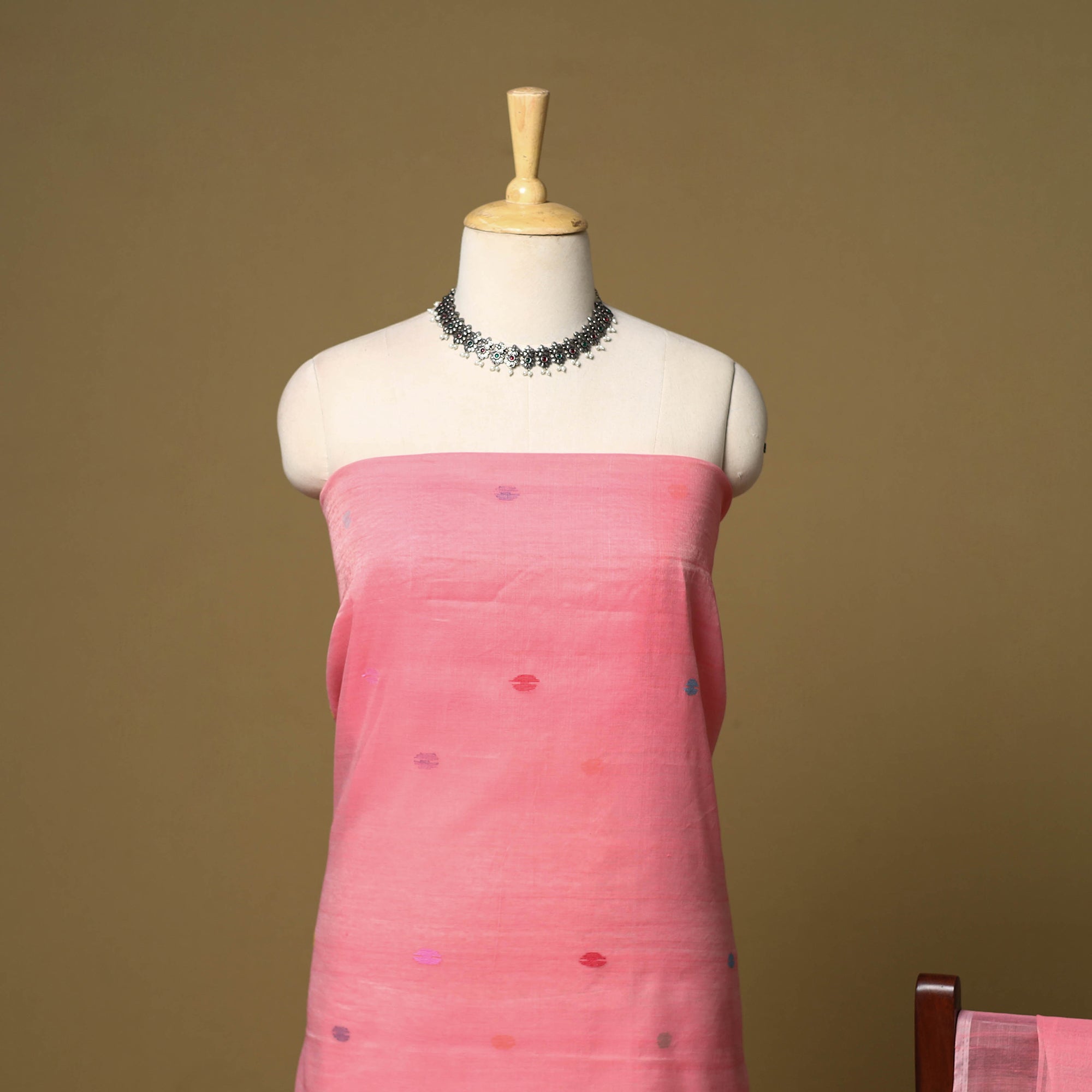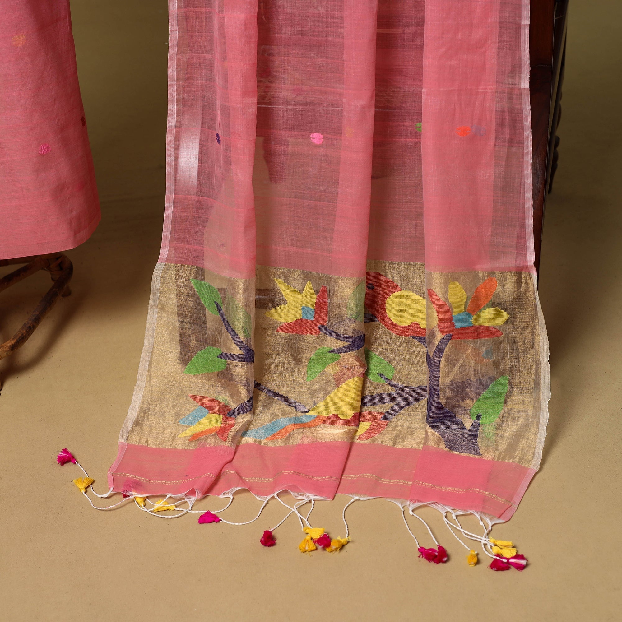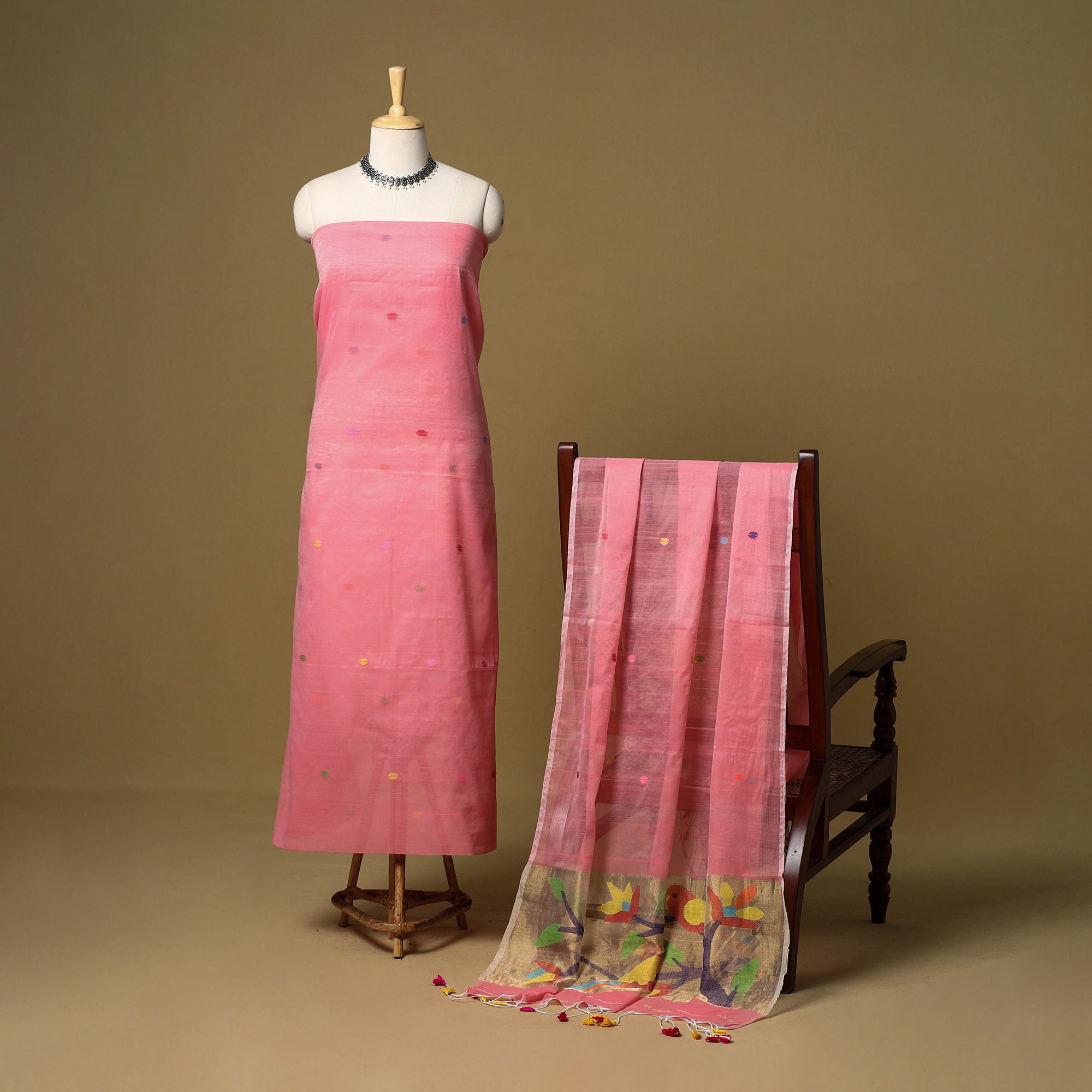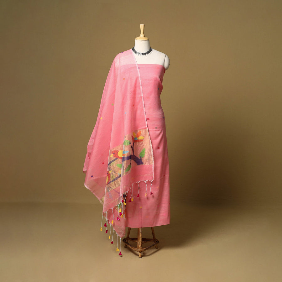 Pink 2pc phulia jamdani weaving silk-cotton dress material from Bengal. It is made using the extra-weft method, where each motif is added by hand, giving it an embroidered look. The design is created with small shuttles that carry coloured or metallic threads through the base weave. Jamdani is known for its fine, detailed patterns. The set includes kurta fabric and a tassel-detailed dupatta, suitable for daily or festive wear.