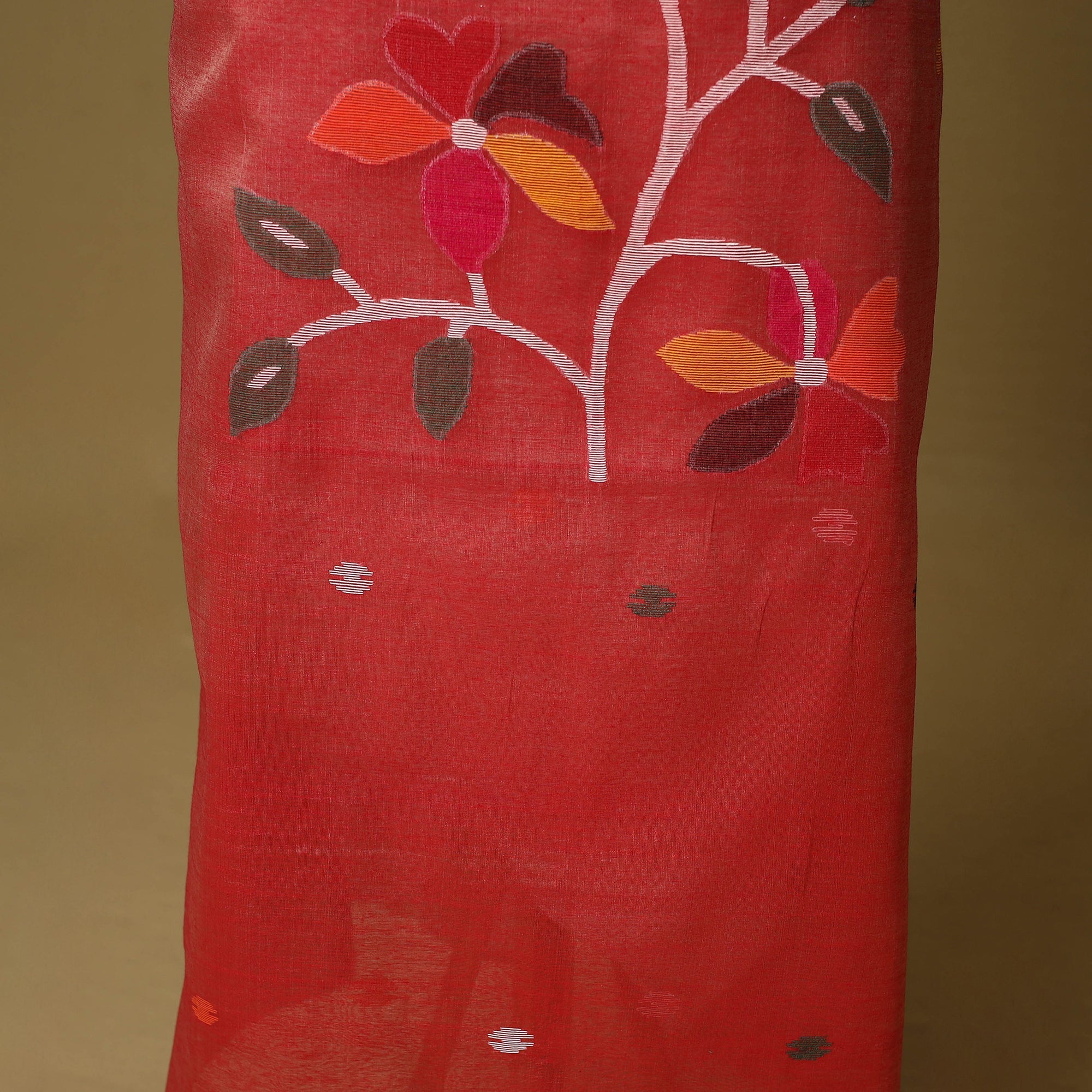 Red 2pc phulia jamdani weaving silk-cotton dress material from Bengal. It is made using the extra-weft method, where each motif is added by hand, giving it an embroidered look. The design is created with small shuttles that carry coloured or metallic threads through the base weave. Jamdani is known for its fine, detailed patterns. The set includes kurta fabric and a tassel-detailed dupatta, suitable for daily or festive wear.