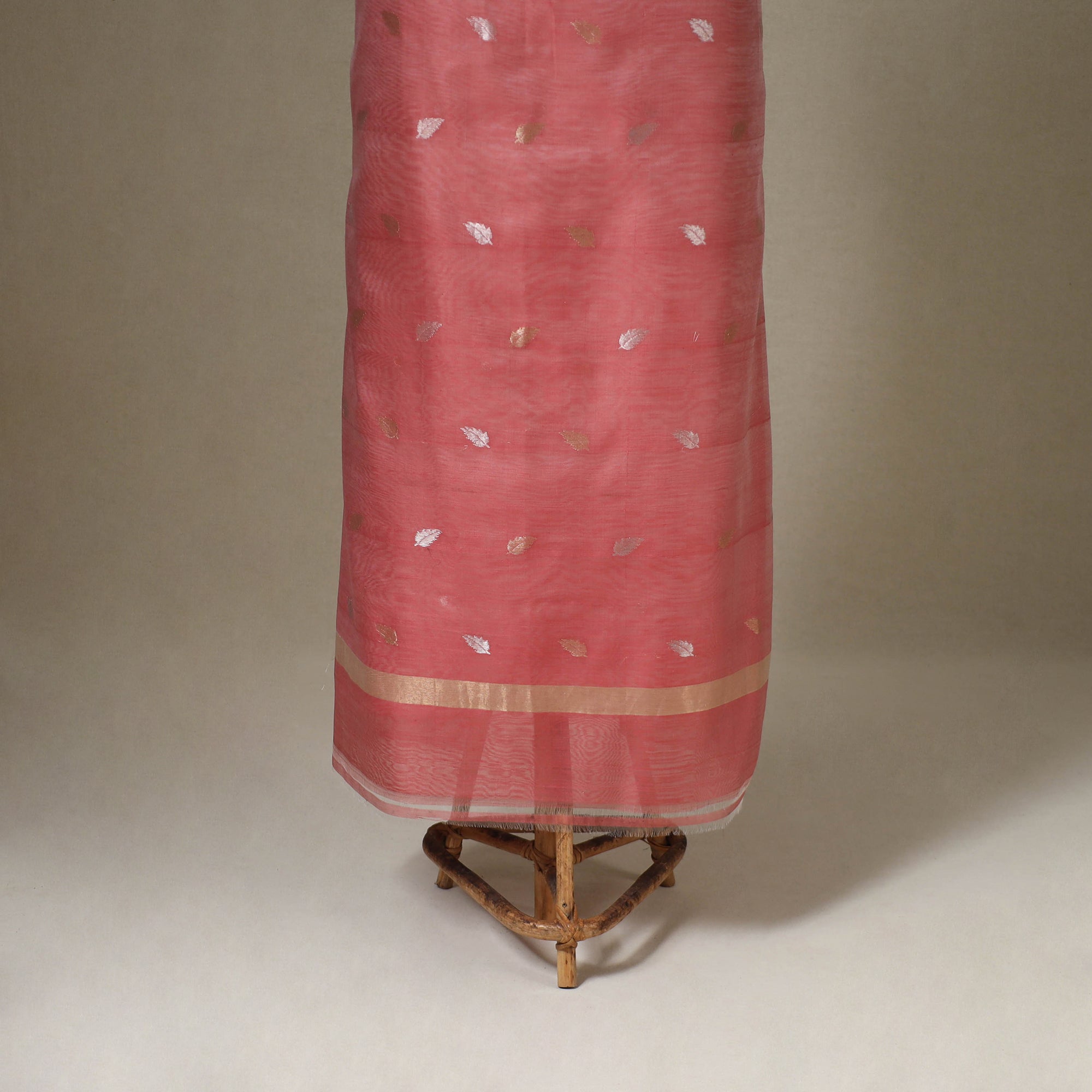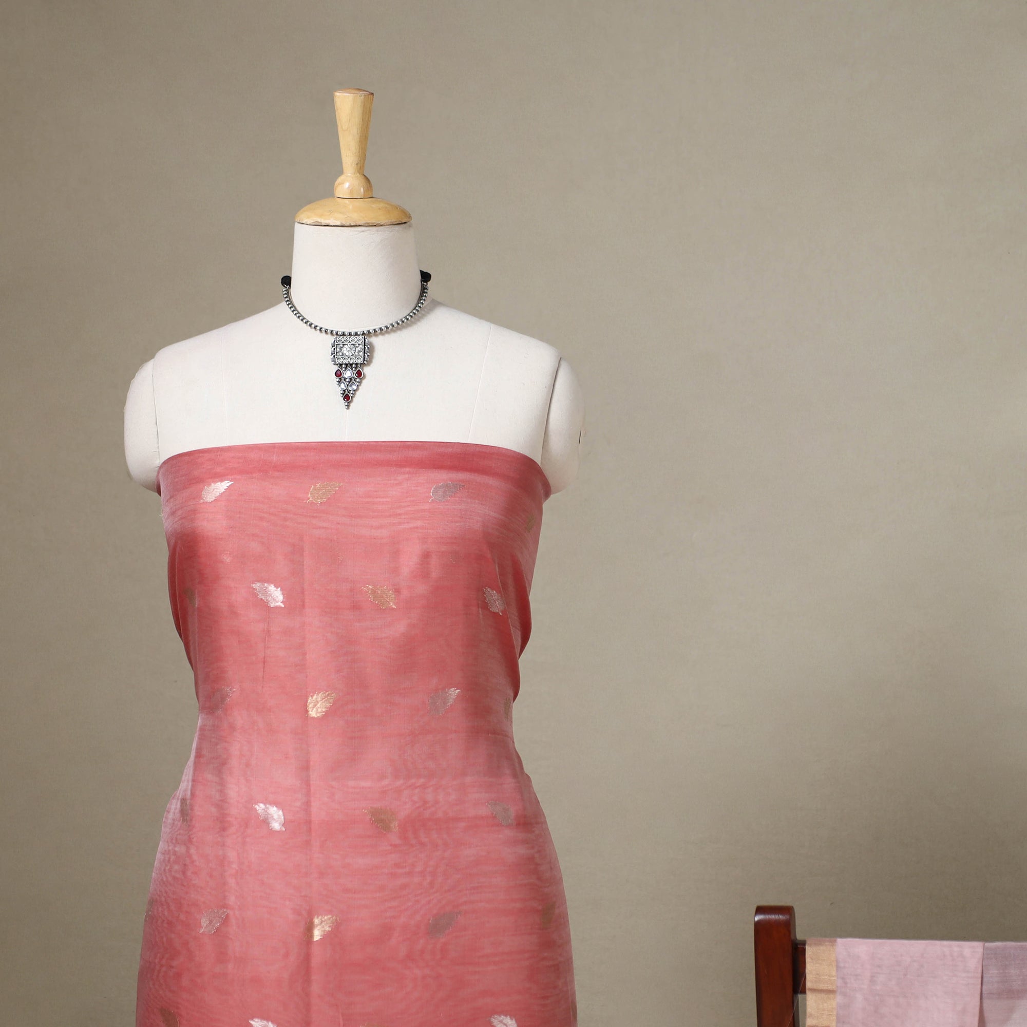 This elegant zari buta red chanderi silk 2pc dress material set is handwoven by master artisan Rauph Khan in the town of Chanderi, Madhya Pradesh. Crafted from a chanderi silk x mercerised cotton blend, the set offers a lightweight, sheer drape with a soft, elegant feel.
