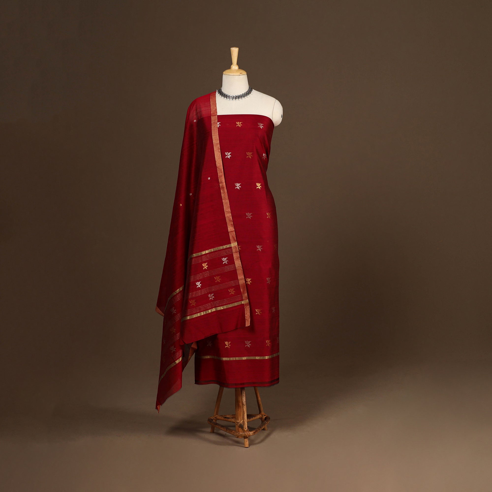 This elegant zari work red chanderi silk 2pc dress material set is handwoven by master artisan Rauph Khan in the town of Chanderi, Madhya Pradesh. Crafted from a chanderi silk and mercerised cotton blend, the set offers a lightweight, sheer drape with a refined touch, making it perfect for festive occasions as well as everyday wear. The set includes a kurta and a dupatta.