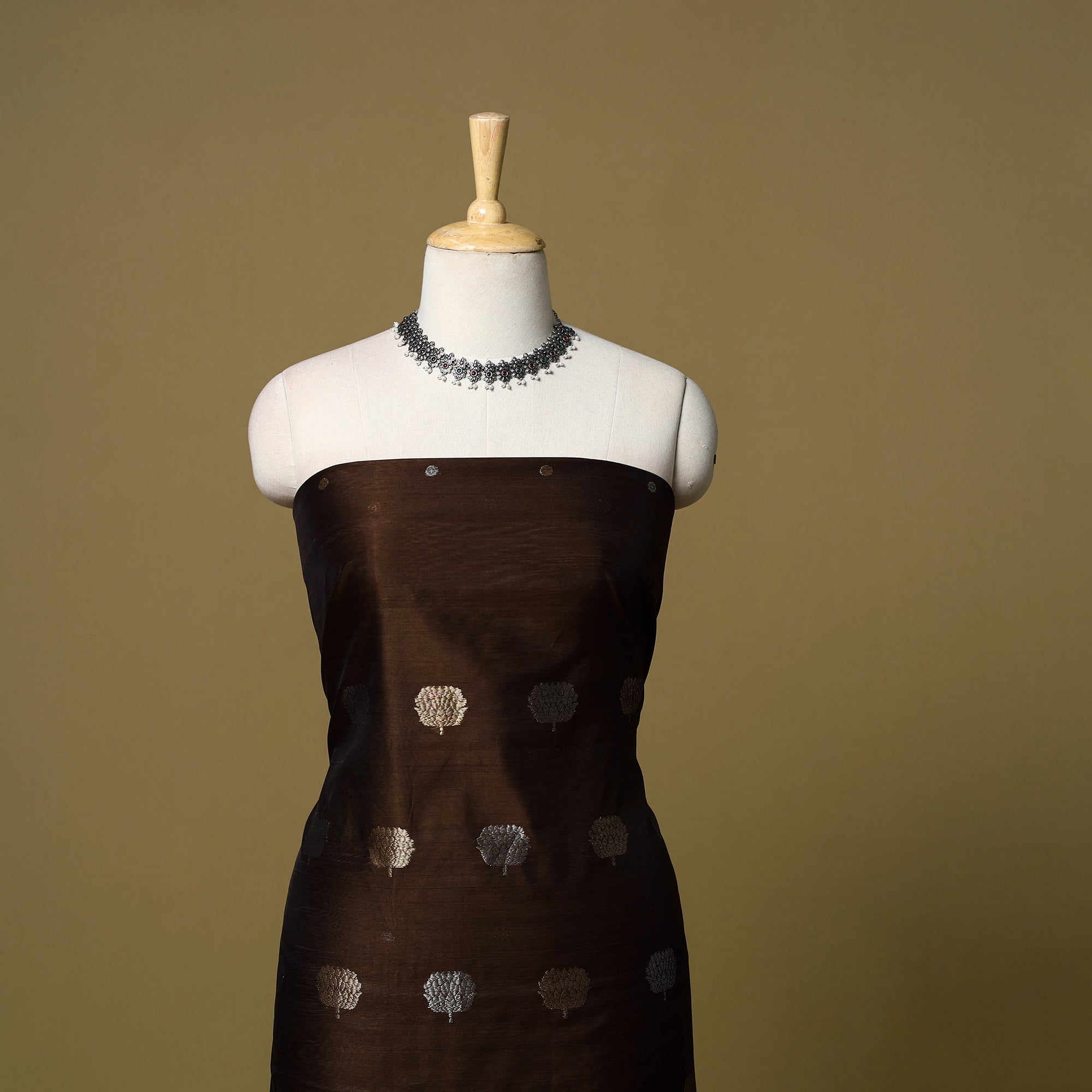 Brown chanderi silk 2pc unstitched dress material set with zari buta and border is handwoven by master artisan Rauph Khan in the town of Chanderi, Madhya Pradesh. Crafted from a chanderi silk and mercerised cotton blend, the set offers a lightweight, sheer drape with a refined touch, making. The set includes a kurta and a dupatta.