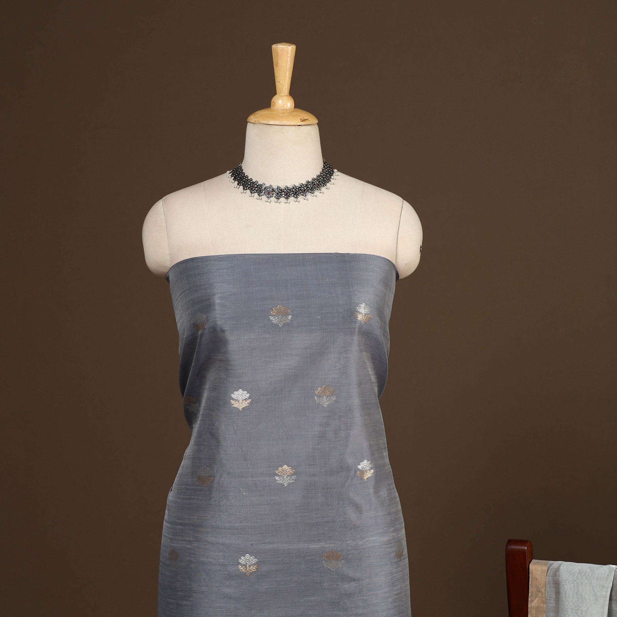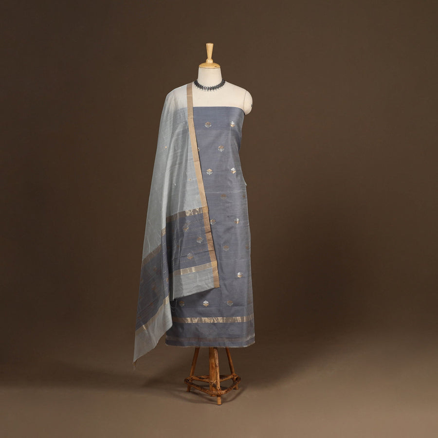 This elegant zari work grey chanderi silk 2pc dress material set is handwoven by master artisan Rauph Khan in the town of Chanderi, Madhya Pradesh. Crafted from a chanderi silk and mercerised cotton blend, the set offers a lightweight, sheer drape with a refined touch, making it perfect for festive occasions as well as everyday wear. The set includes a kurta and a dupatta.