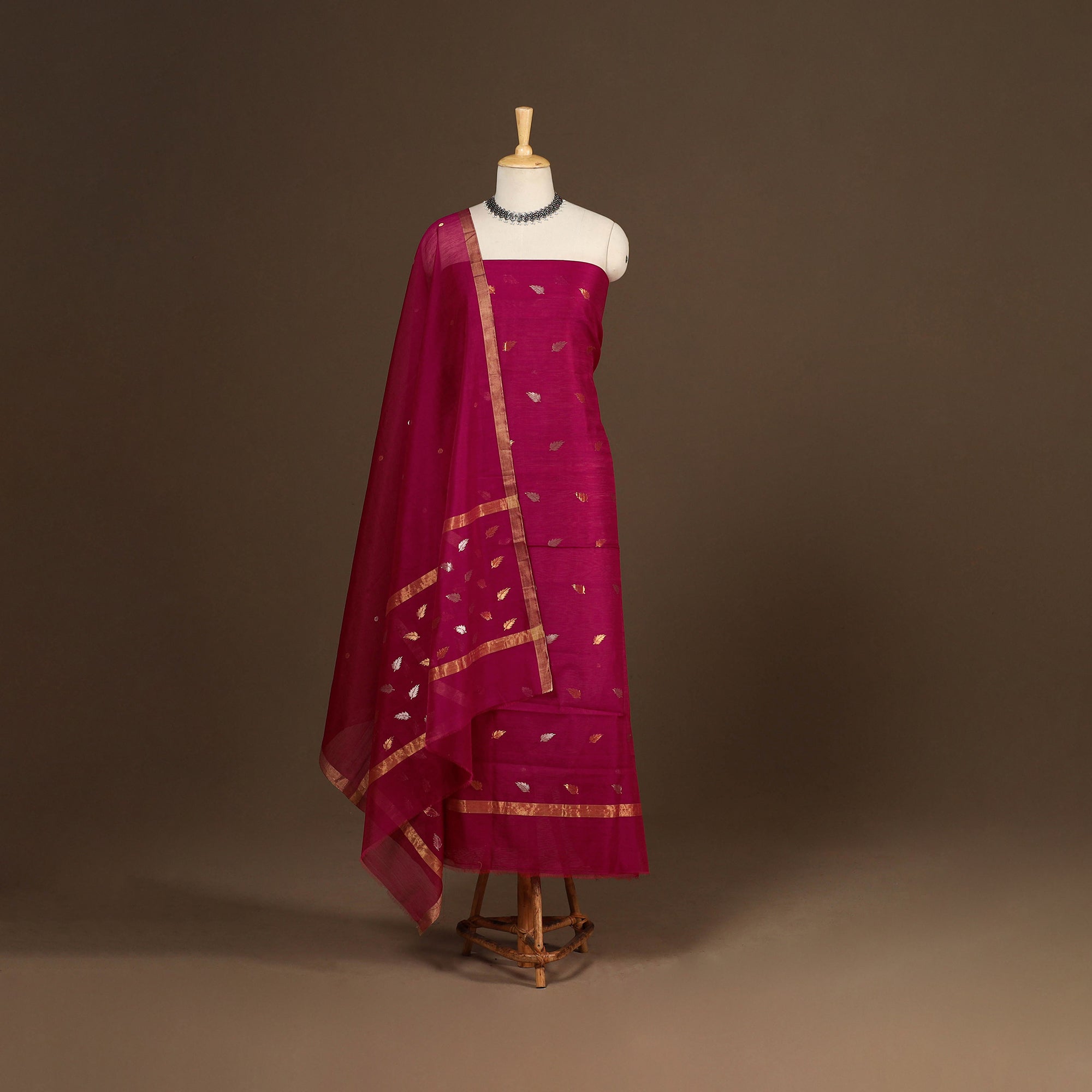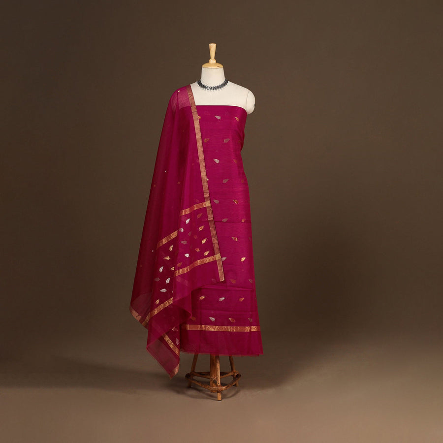 This elegant zari work pink chanderi silk 2pc dress material set is handwoven by master artisan Rauph Khan in the town of Chanderi, Madhya Pradesh. Crafted from a chanderi silk and mercerised cotton blend, the set offers a lightweight, sheer drape with a refined touch, making it perfect for festive occasions as well as everyday wear. The set includes a kurta and a dupatta.