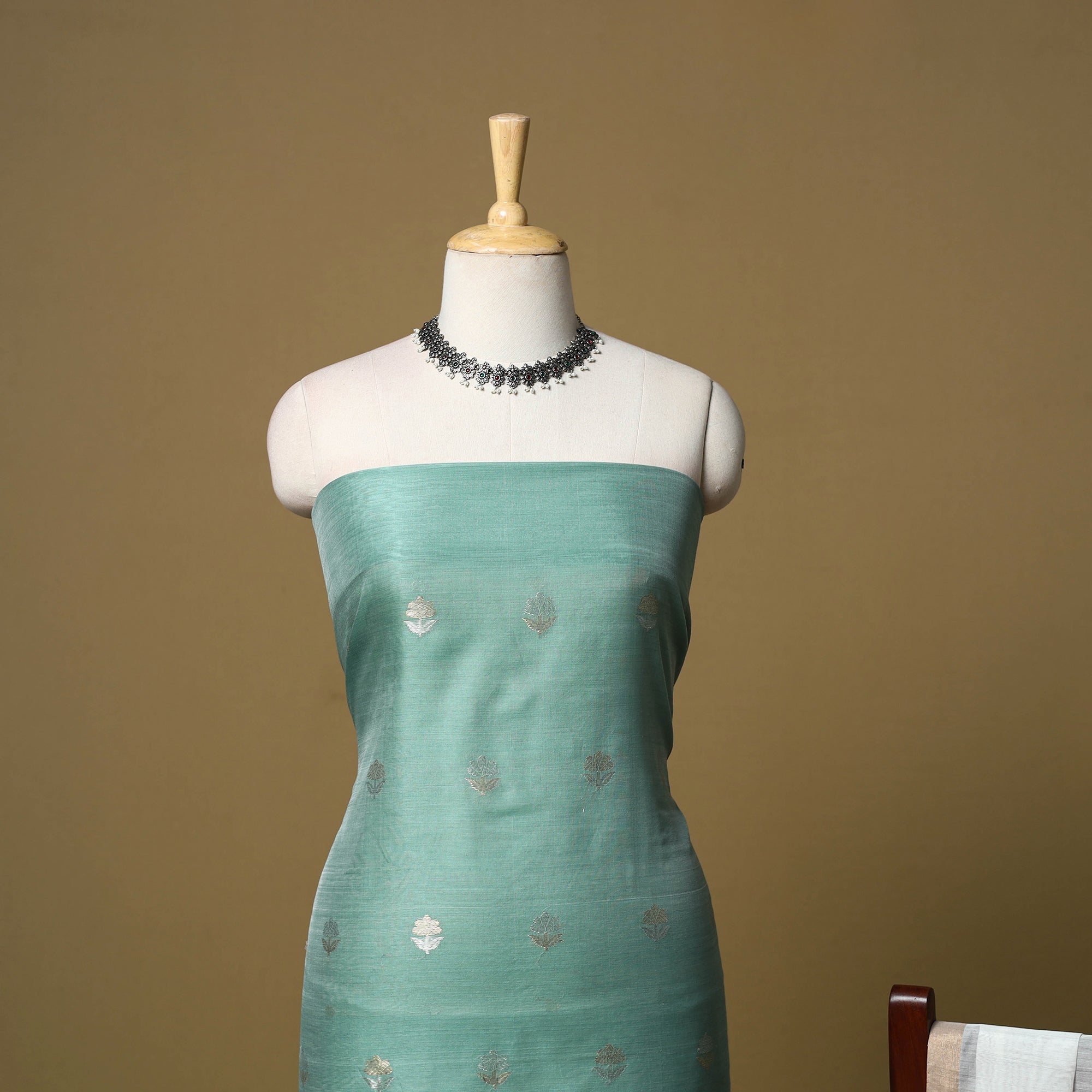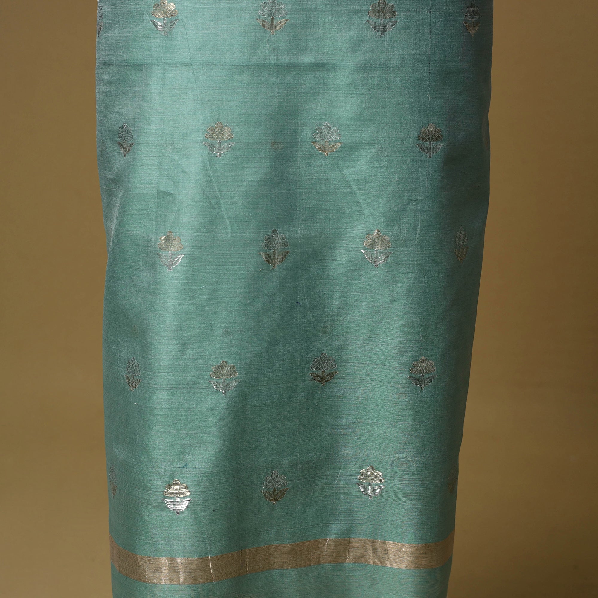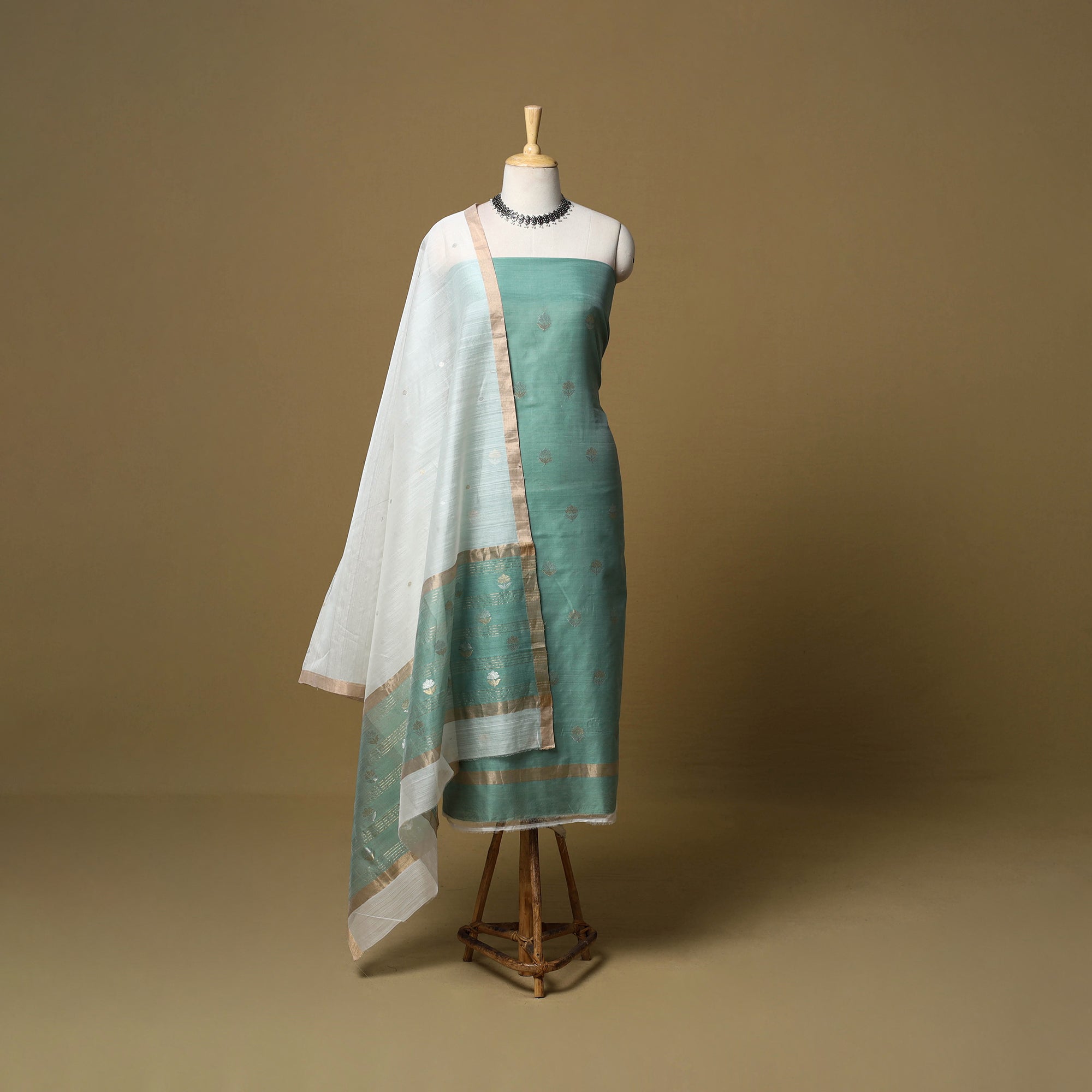 Green chanderi silk 2pc unstitched dress material set with zari buta and border is handwoven by master artisan Rauph Khan in the town of Chanderi, Madhya Pradesh. Crafted from a chanderi silk and mercerised cotton blend, the set offers a lightweight, sheer drape with a refined touch, making. The set includes a kurta and a dupatta.