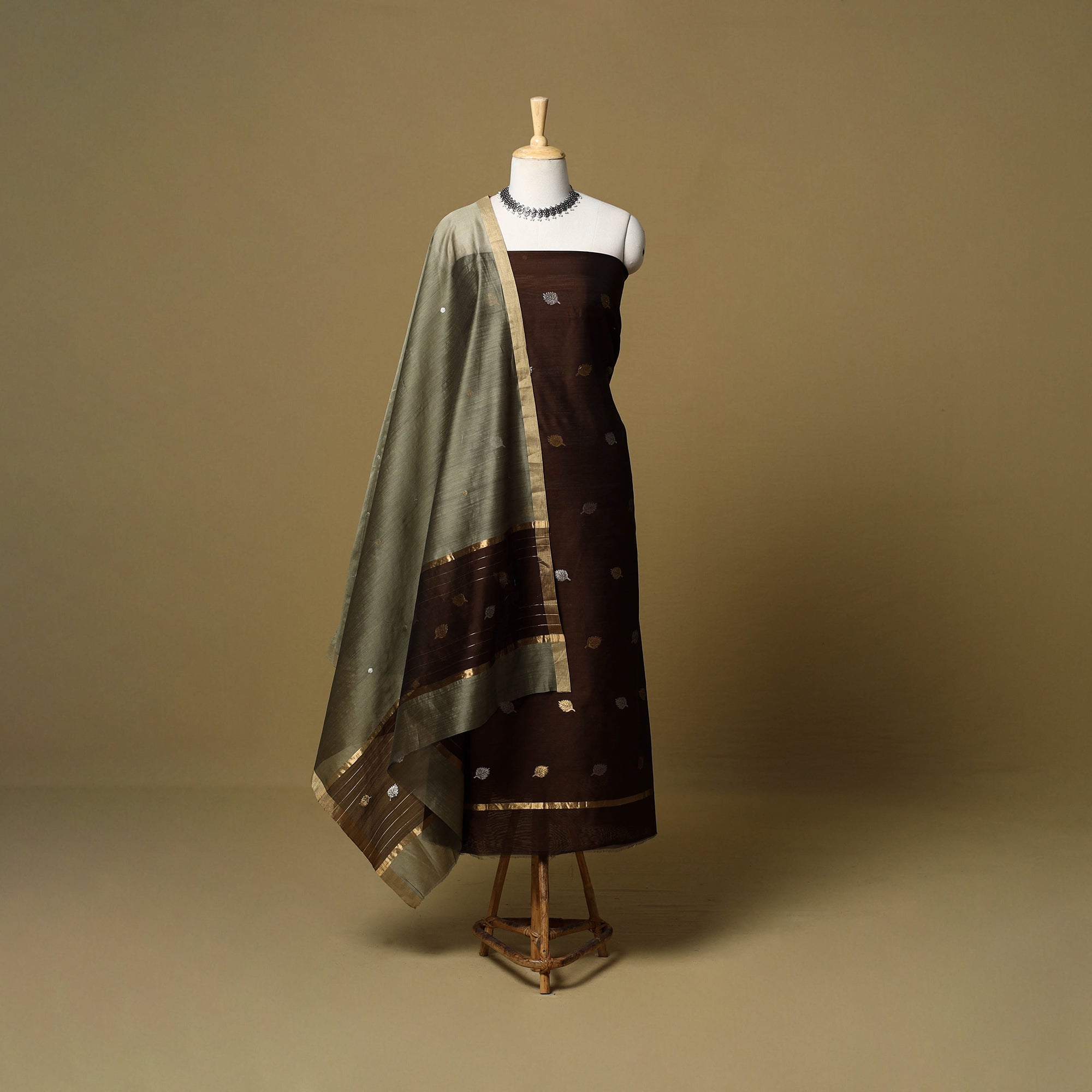 Brown chanderi silk 2pc unstitched dress material set with zari buta and border is handwoven by master artisan Rauph Khan in the town of Chanderi, Madhya Pradesh. Crafted from a chanderi silk and mercerised cotton blend, the set offers a lightweight, sheer drape with a refined touch, making. The set includes a kurta and a dupatta.