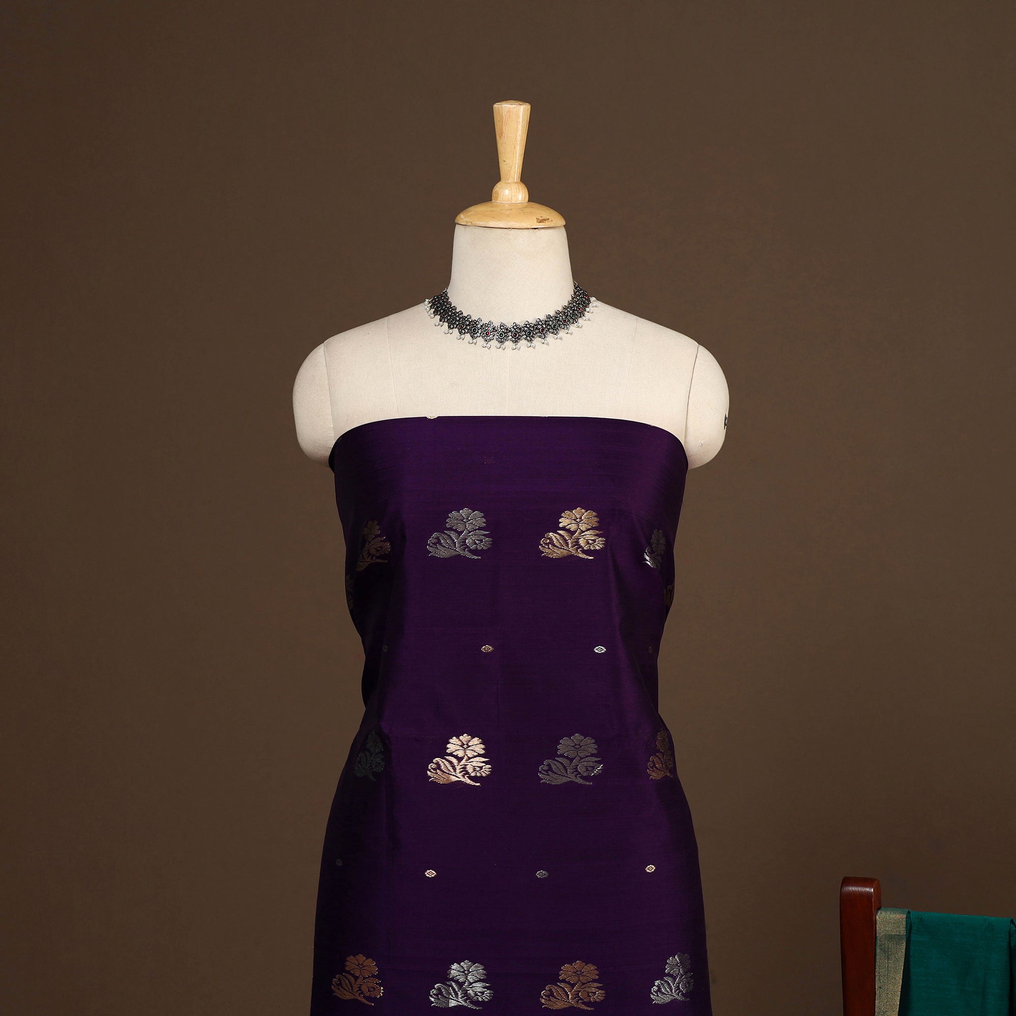 This elegant zari work purple chanderi silk 2pc dress material set is handwoven by master artisan Rauph Khan in the town of Chanderi, Madhya Pradesh. Crafted from a chanderi silk and mercerised cotton blend, the set offers a lightweight, sheer drape with a refined touch, making it perfect for festive occasions as well as everyday wear. The set includes a kurta and a dupatta.