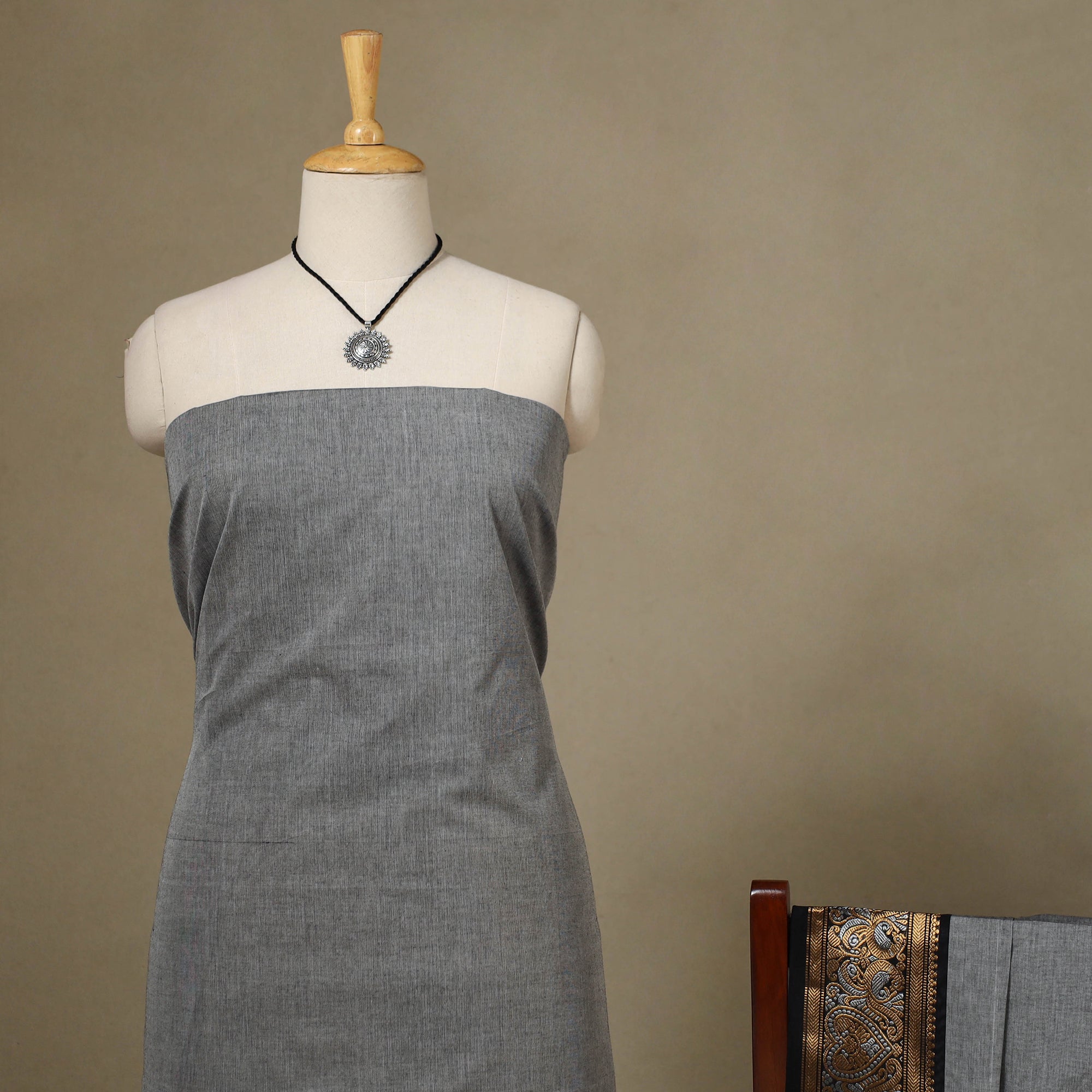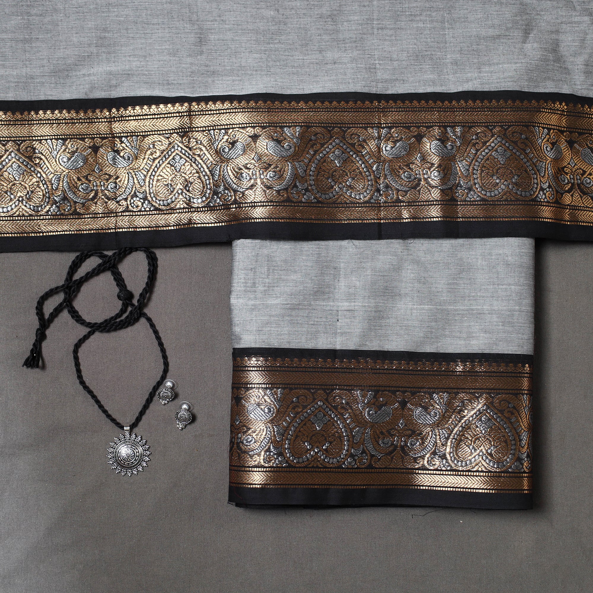 This grey 2pc kandangi chettinad cotton dress material set honours the rich weaving legacy of Tamil Nadu. It features a vibrant kurta fabric adorned with a traditional border, paired with a matching dupatta. Crafted using age-old weaving techniques, the breathable cotton ensures all-day comfort and effortless elegance. Thoughtfully paired with a coordinated jewellery set, it’s perfect for festive gatherings or graceful everyday styling.
