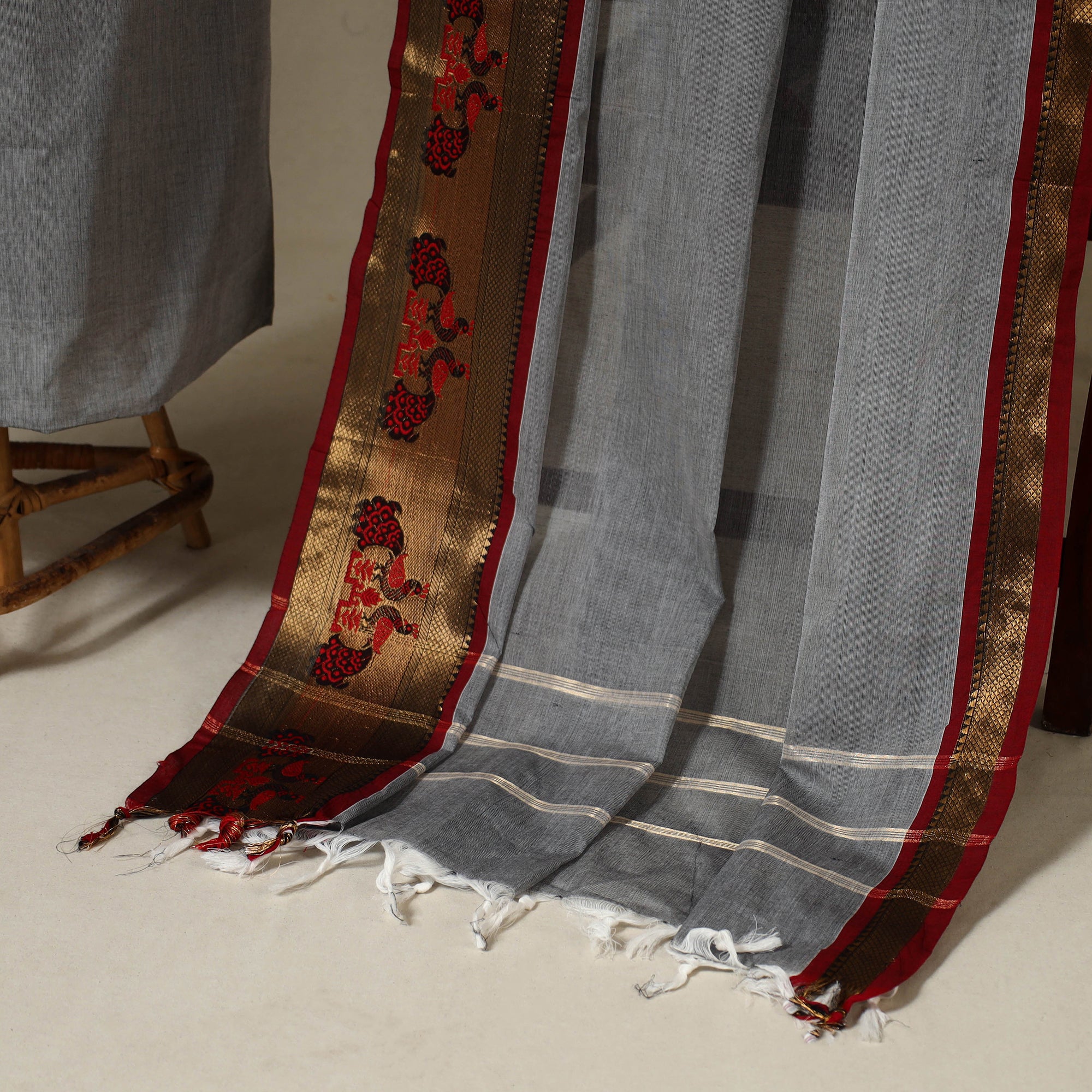 This grey 2pc kandangi chettinad cotton dress material set honours the rich weaving legacy of Tamil Nadu. It features a vibrant kurta fabric adorned with a traditional border, paired with a matching dupatta. Crafted using age-old weaving techniques, the breathable cotton ensures all-day comfort and effortless elegance. Thoughtfully paired with a coordinated jewellery set, it’s perfect for festive gatherings or graceful everyday styling.