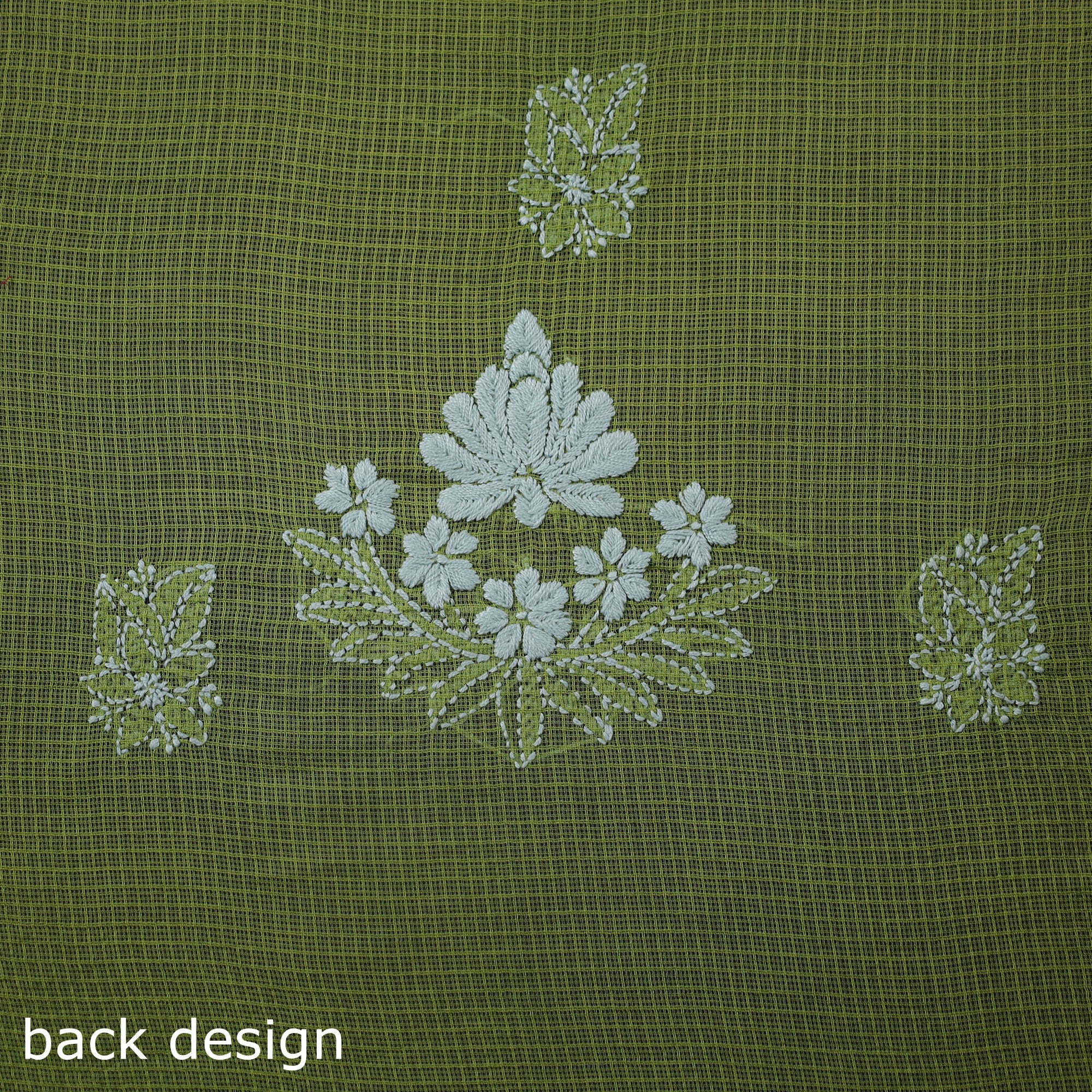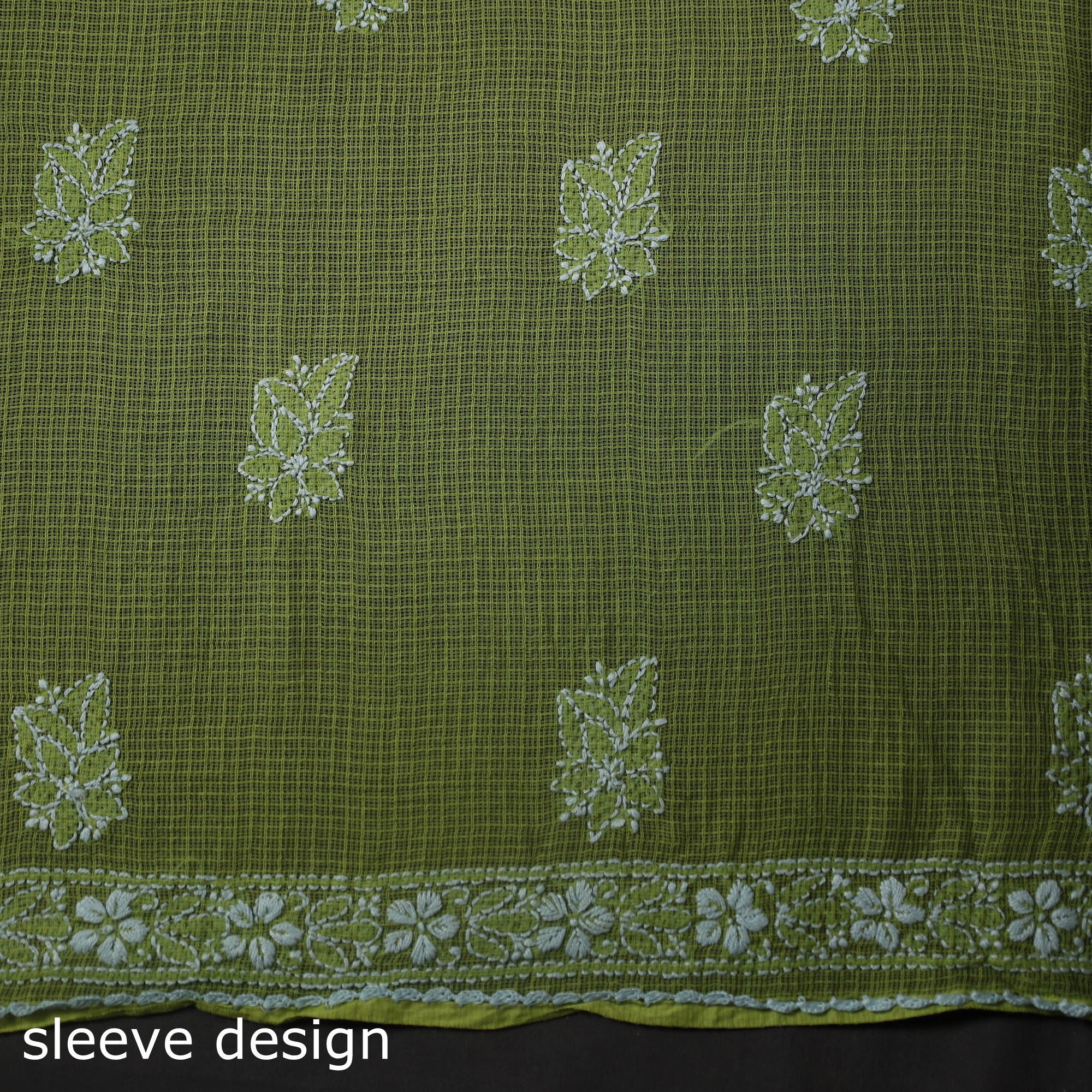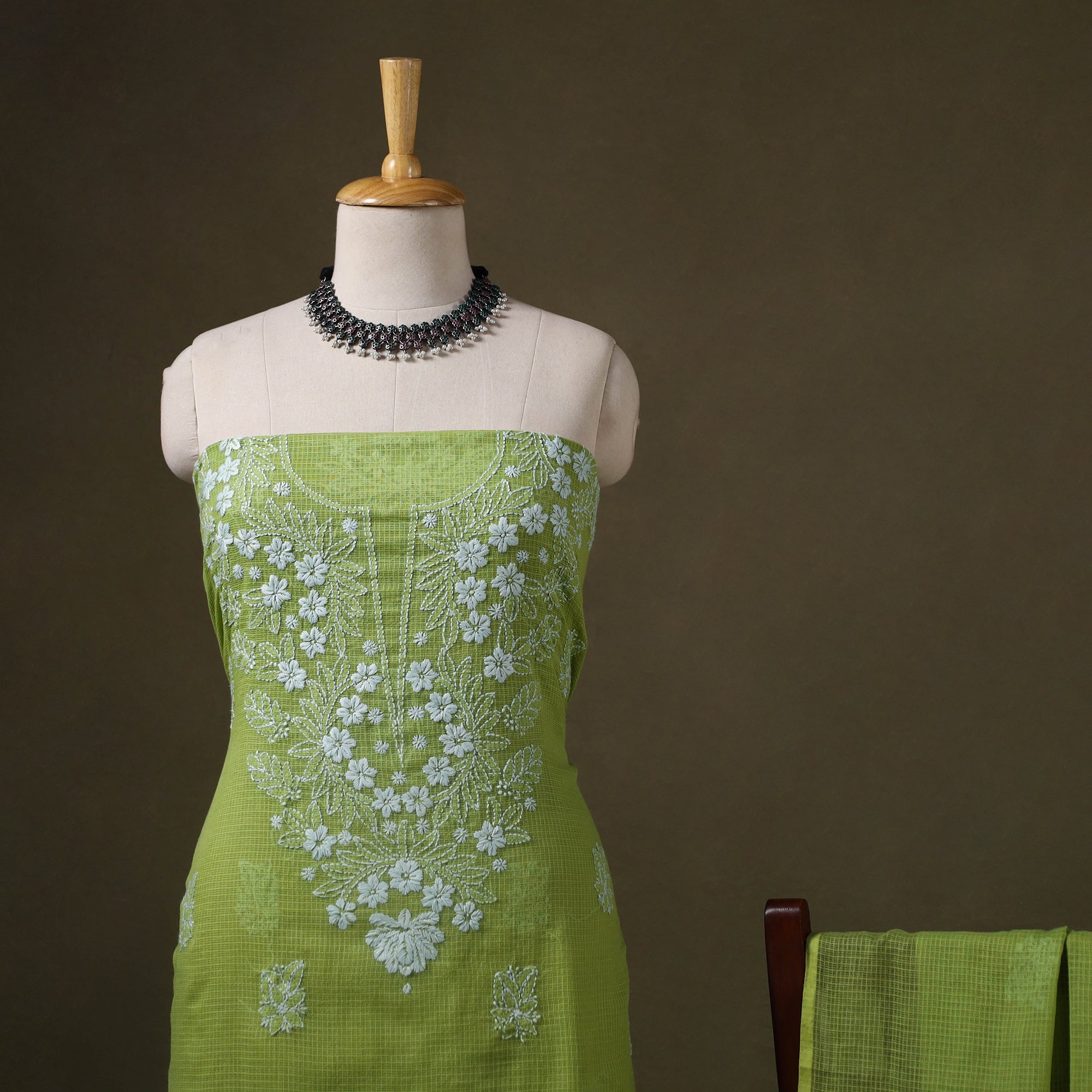This green 2pc lucknow chikankari dress material is crafted from soft kota doria cotton and adorned with delicate hand embroidery. The set features a beautifully embroidered kurta paired with a matching dupatta. Chikankari is a traditional embroidery art from Lucknow, reflects timeless finesse and rich cultural heritage. Lightweight and breathable, this ensemble is ideal for festive occasions or casual styling.