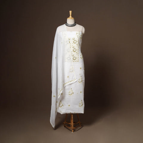 This white 2pc lucknow chikankari dress material is crafted from soft kota doria cotton and adorned with delicate hand embroidery. The set includes a beautifully embroidered kurta paired with a matching dupatta. chikankari, a traditional embroidery art from Lucknow, reflects finesse and cultural richness. Lightweight and breathable, this ensemble is perfect for festive gatherings as well as casual wear.