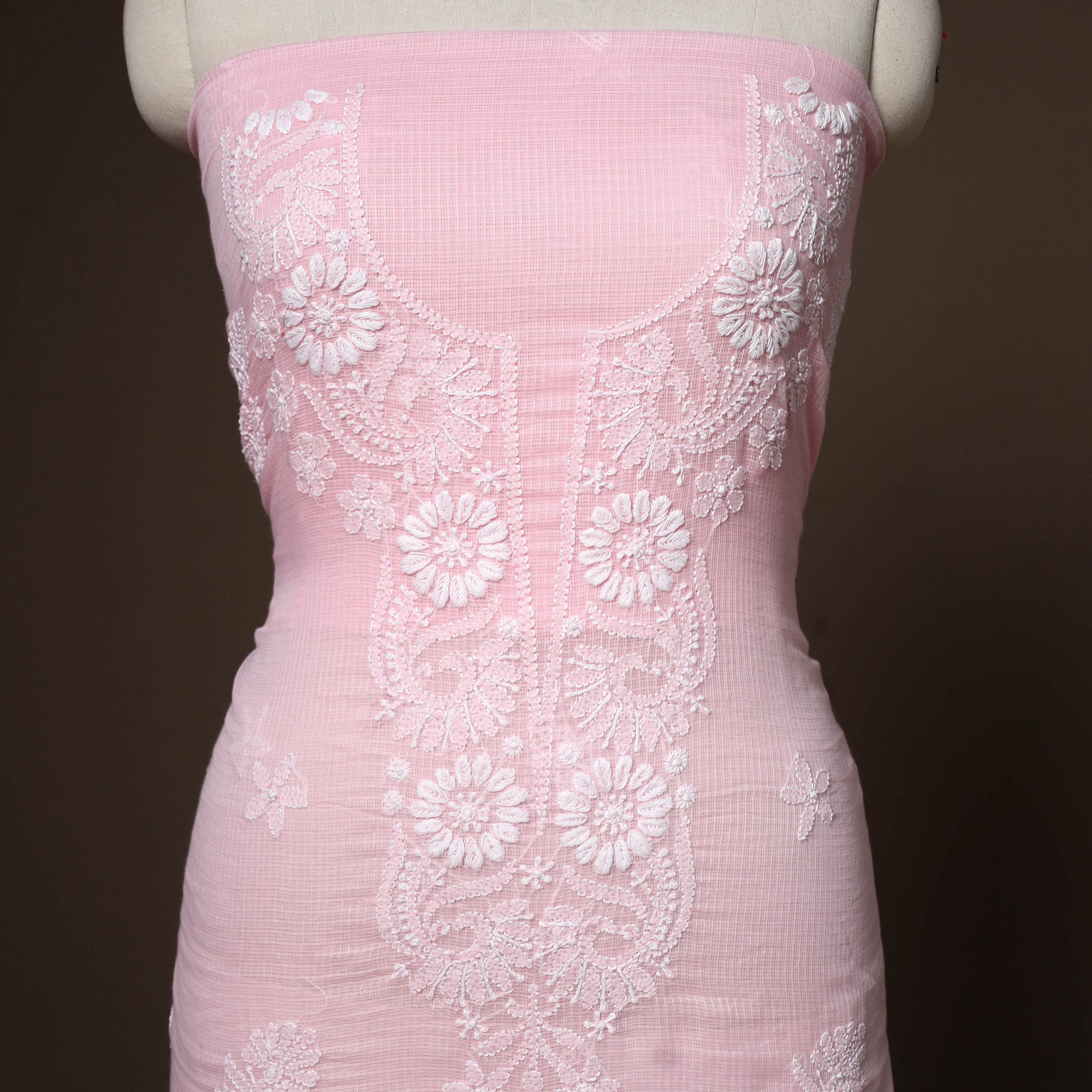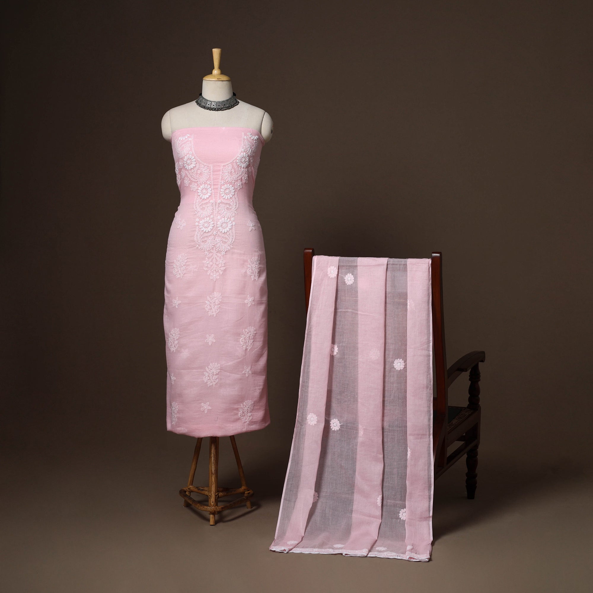 This pink 2pc lucknow chikankari dress material is crafted from soft kota doria cotton and adorned with delicate hand embroidery. The set includes a beautifully embroidered kurta paired with a matching dupatta. chikankari, a traditional embroidery art from Lucknow, reflects finesse and cultural richness. Lightweight and breathable, this ensemble is perfect for festive gatherings as well as casual wear.
