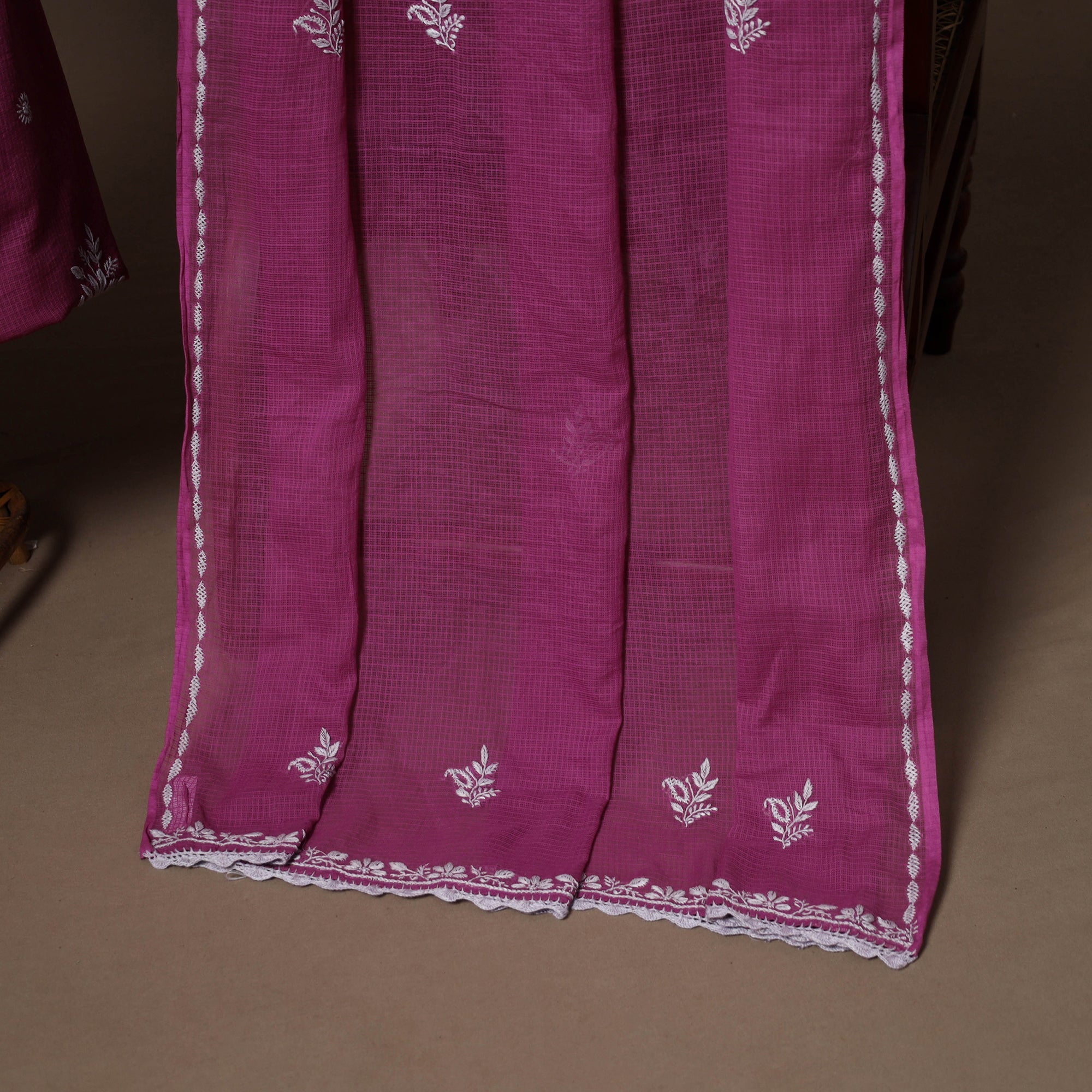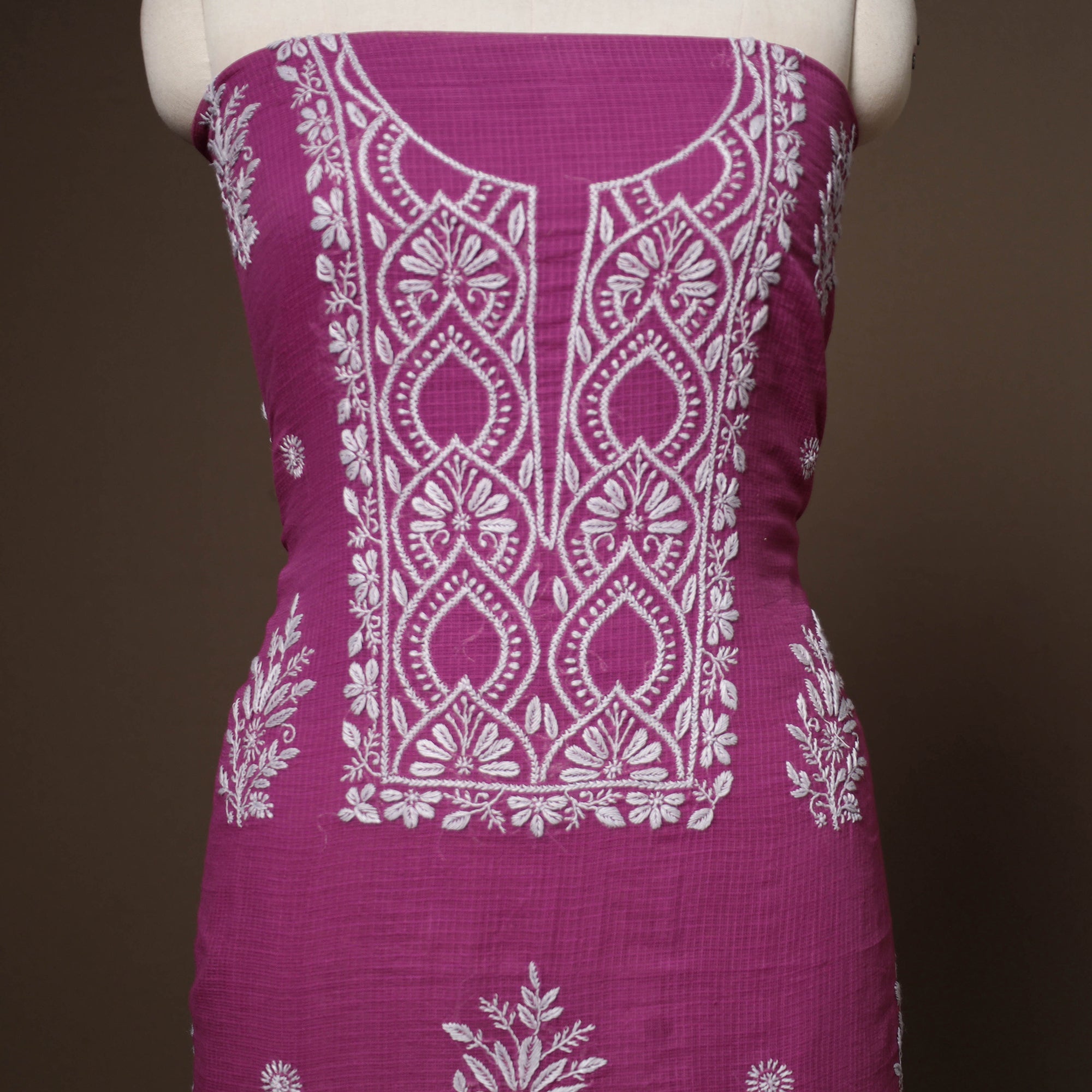 This purple 2pc lucknow chikankari dress material is crafted from soft kota doria cotton and adorned with delicate hand embroidery. The set includes a beautifully embroidered kurta paired with a matching dupatta. chikankari, a traditional embroidery art from Lucknow, reflects finesse and cultural richness. Lightweight and breathable, this ensemble is perfect for festive gatherings as well as casual wear.