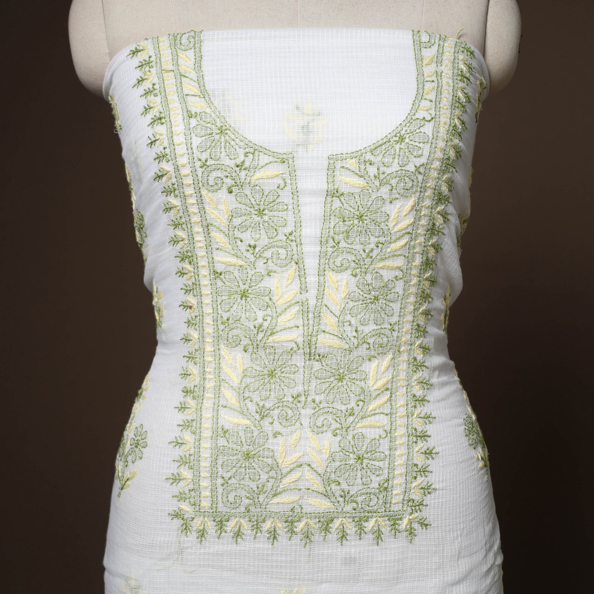 This white 2pc lucknow chikankari dress material is crafted from soft kota doria cotton and adorned with delicate hand embroidery. The set includes a beautifully embroidered kurta paired with a matching dupatta. chikankari, a traditional embroidery art from Lucknow, reflects finesse and cultural richness. Lightweight and breathable, this ensemble is perfect for festive gatherings as well as casual wear.