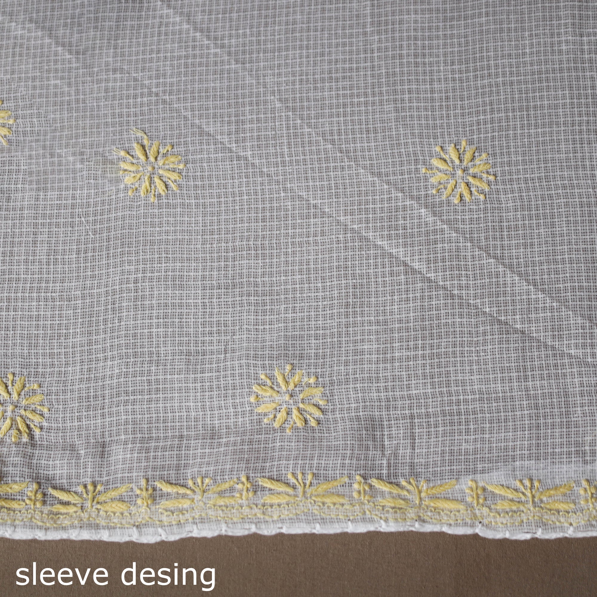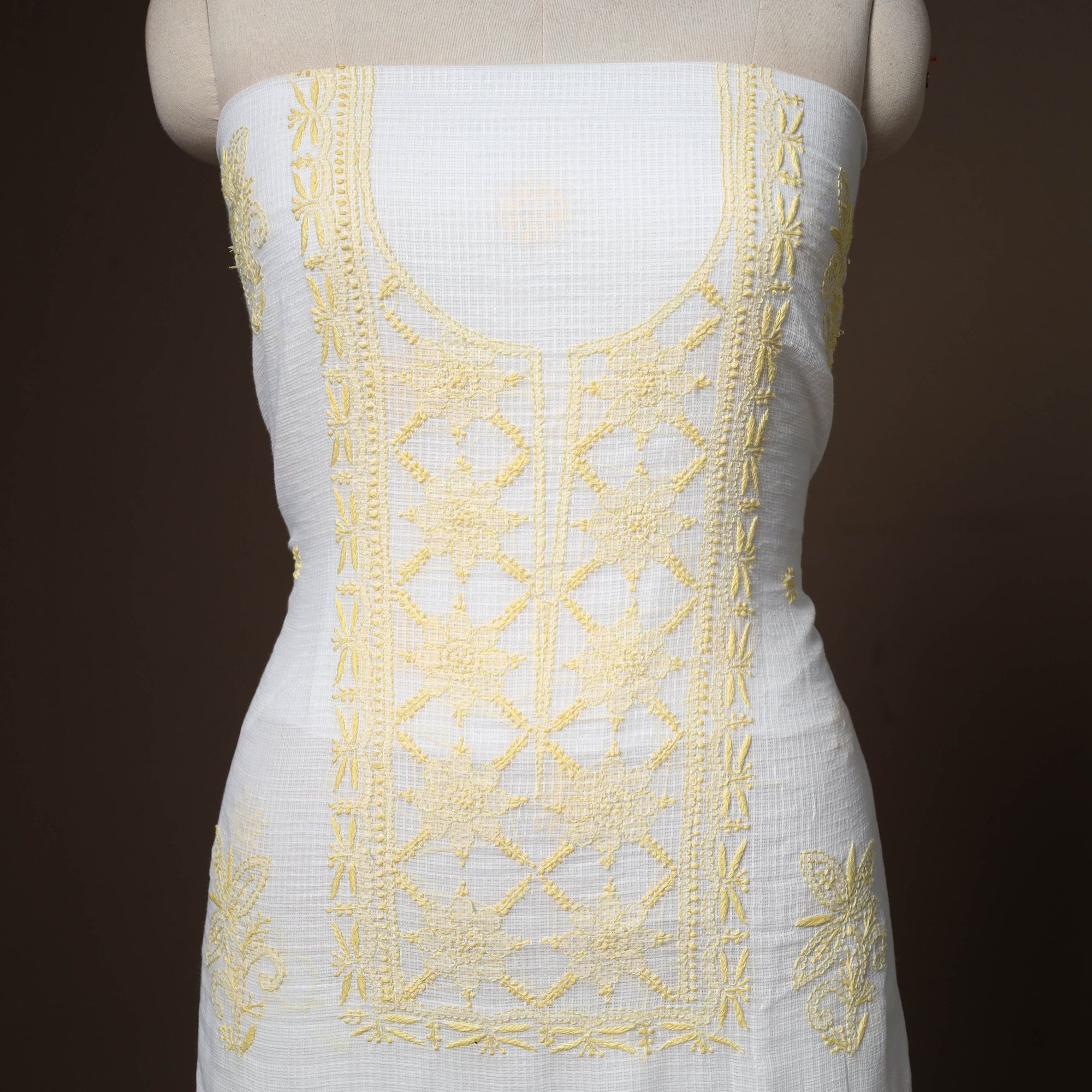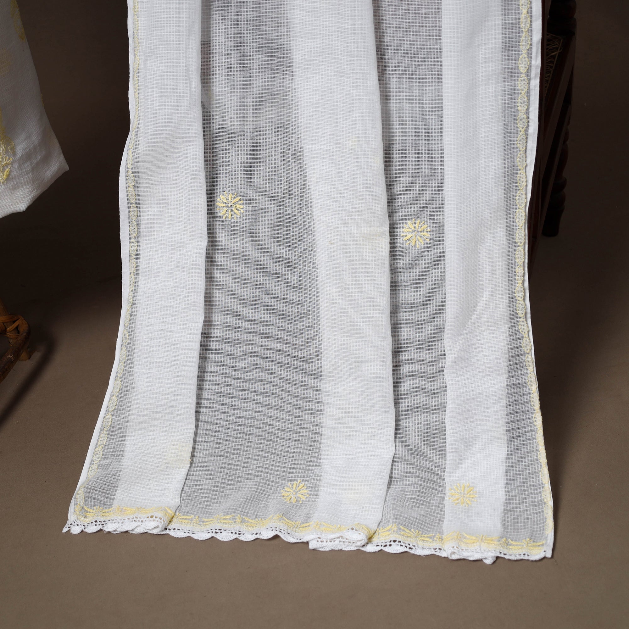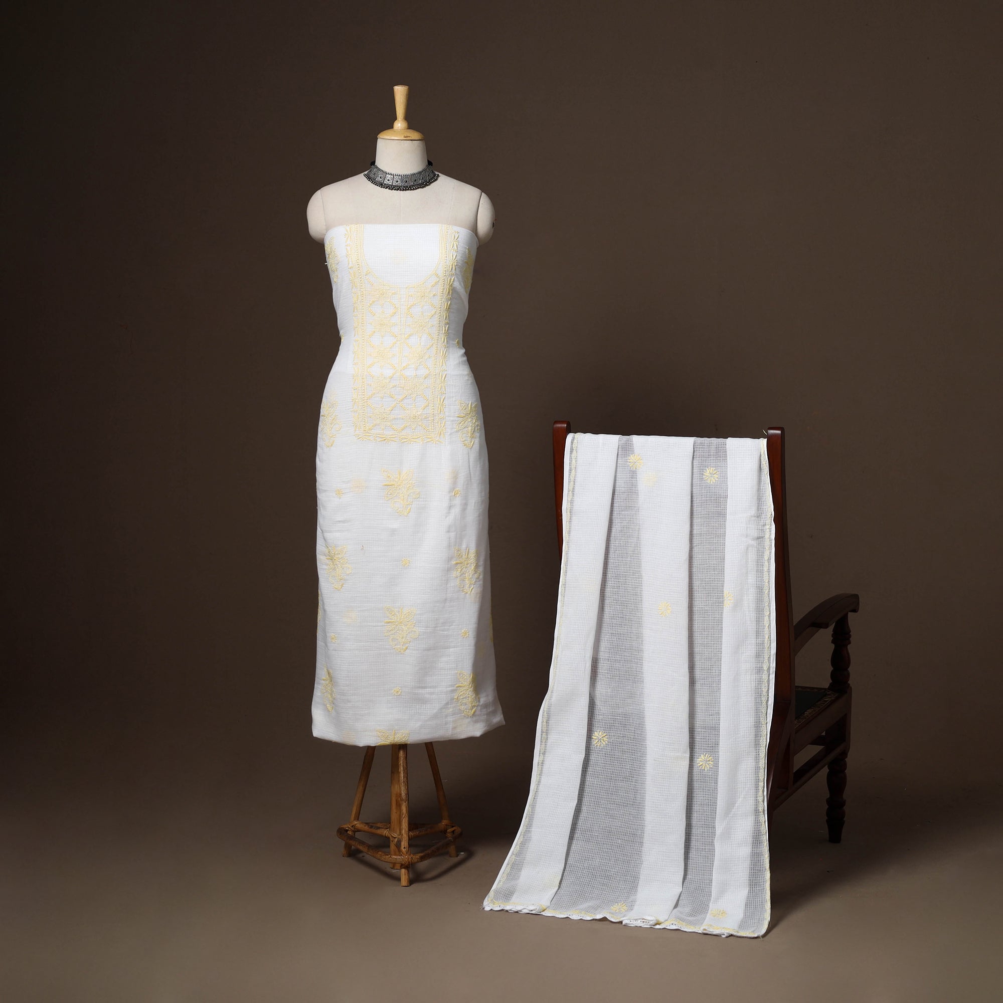This white 2pc lucknow chikankari dress material is crafted from soft kota doria cotton and adorned with delicate hand embroidery. The set includes a beautifully embroidered kurta paired with a matching dupatta. chikankari, a traditional embroidery art from Lucknow, reflects finesse and cultural richness. Lightweight and breathable, this ensemble is perfect for festive gatherings as well as casual wear.