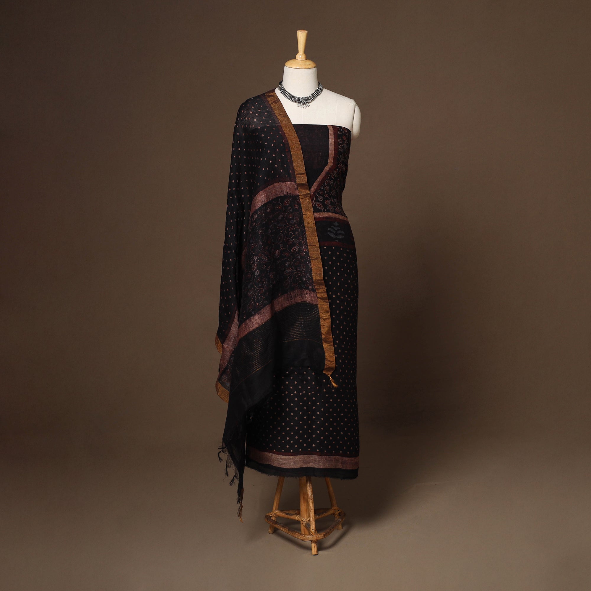 This brown linen silk ajrakh dress material set from Kutch includes fabric for the kurta and a zari-bordered dupatta. Crafted with traditional block printing and natural dyes, it beautifully blends heritage with modern elegance. Suitable for festive occasions or everyday wear, this set adds timeless grace and comfort to your wardrobe.