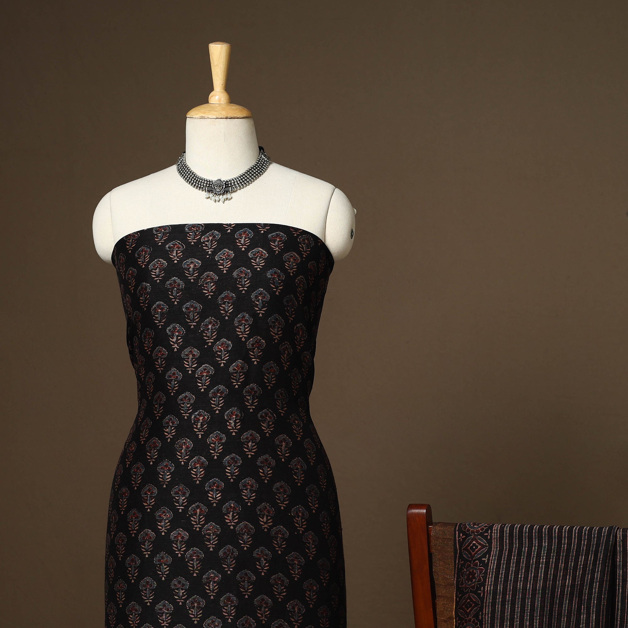 This black linen silk ajrakh dress material set from Kutch includes fabric for the kurta and a zari-bordered dupatta. Designed with traditional block printing and natural dyes, it blends heritage with modern elegance. Perfect for festive occasions as well as everyday wear, this set brings timeless grace and comfort to your wardrobe.