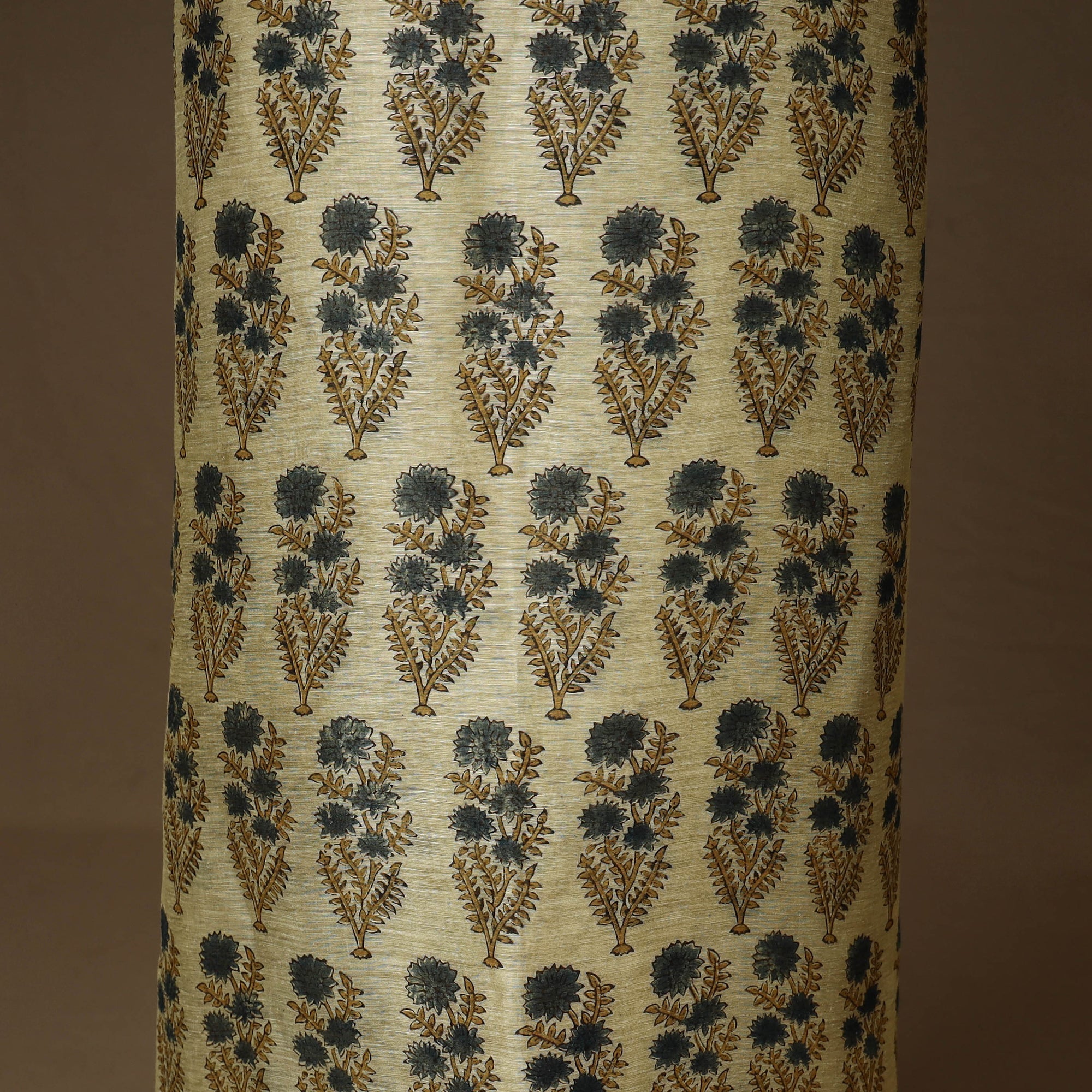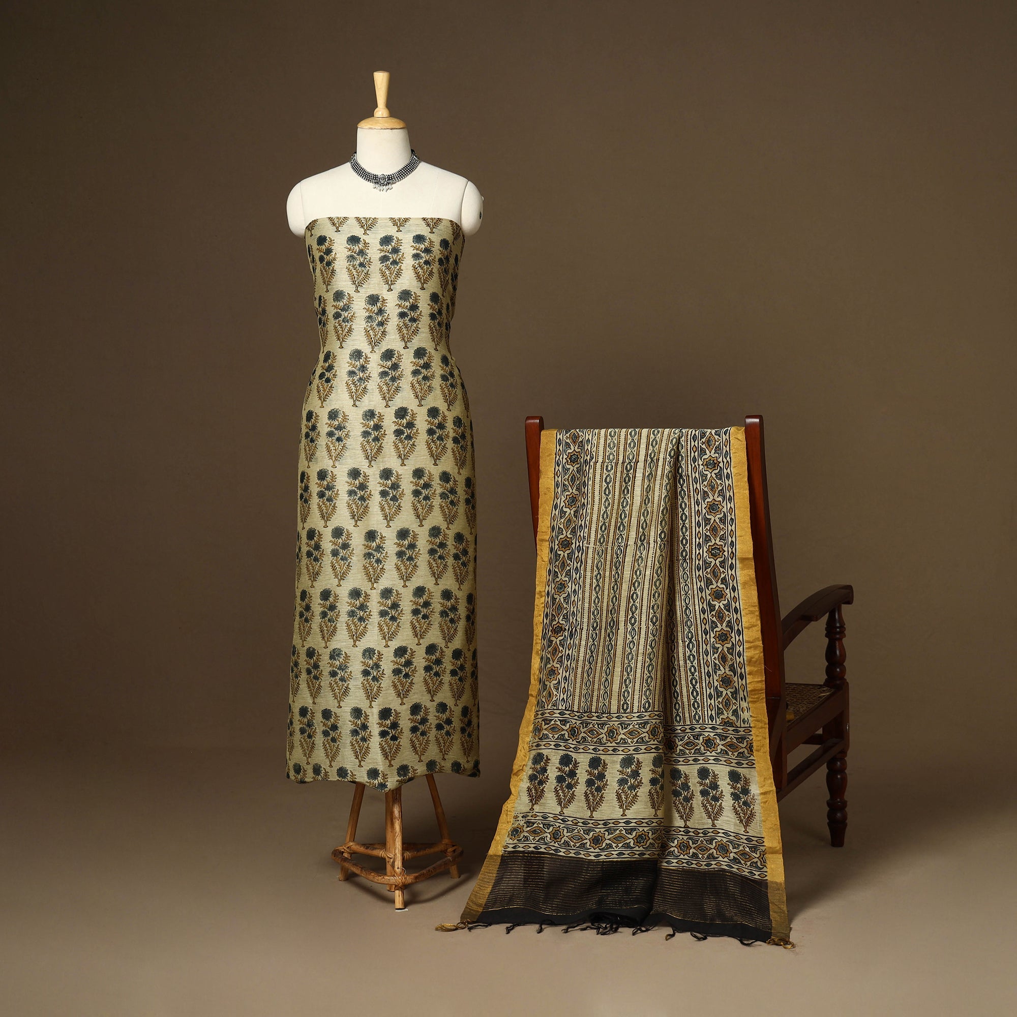 This beige linen silk ajrakh dress material set from Kutch includes fabric for the kurta and a zari-bordered dupatta. Designed with traditional block printing and natural dyes, it blends heritage with modern elegance. Perfect for festive occasions as well as everyday wear, this set brings timeless grace and comfort to your wardrobe.