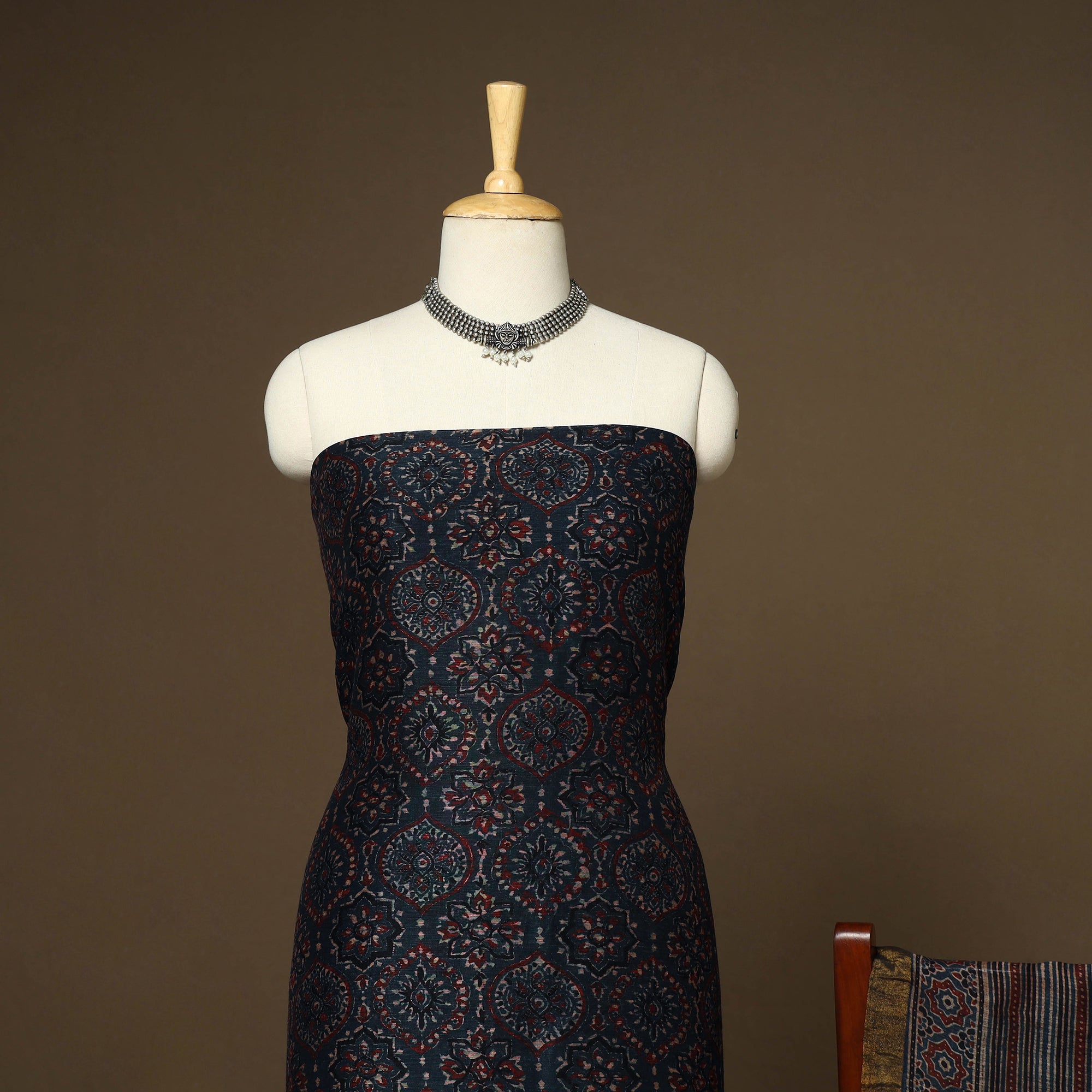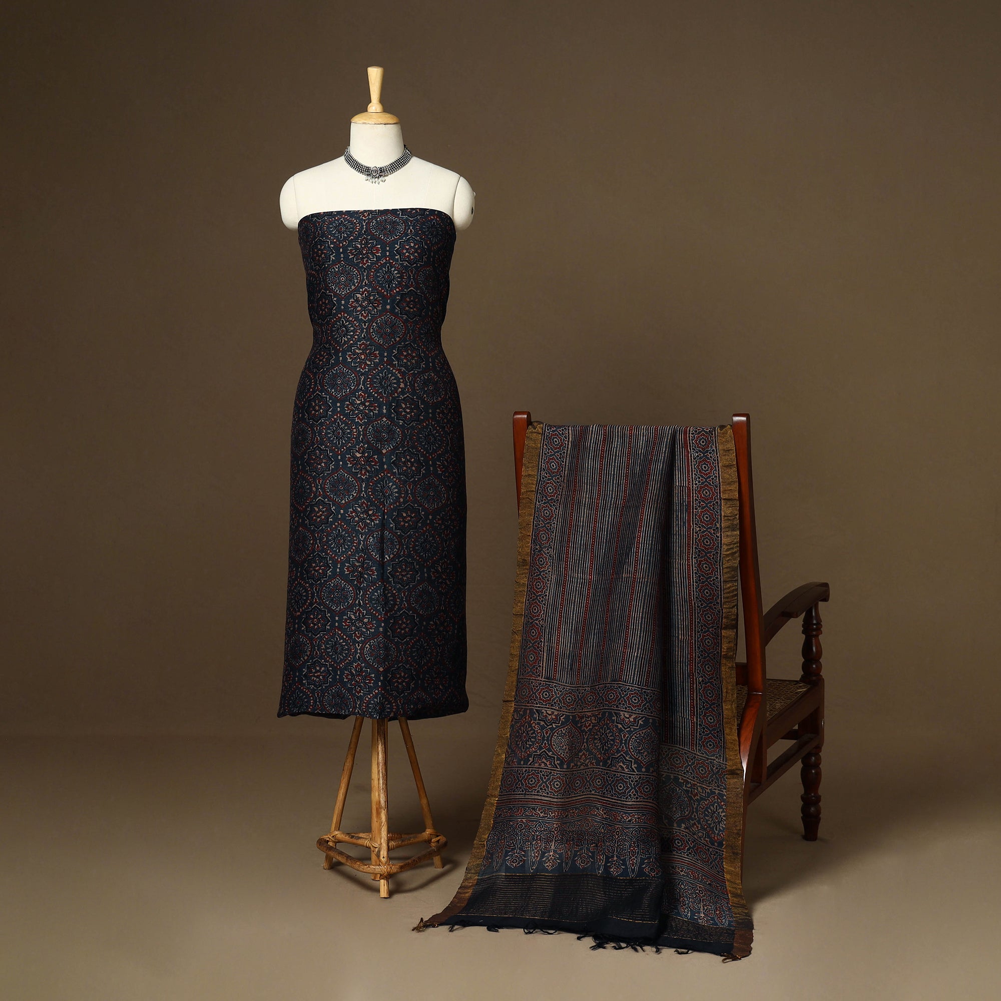 This blue linen silk ajrakh dress material set from Kutch includes fabric for the kurta and a zari-bordered dupatta. Designed with traditional block printing and natural dyes, it blends heritage with modern elegance. Perfect for festive occasions as well as everyday wear, this set brings timeless grace and comfort to your wardrobe.