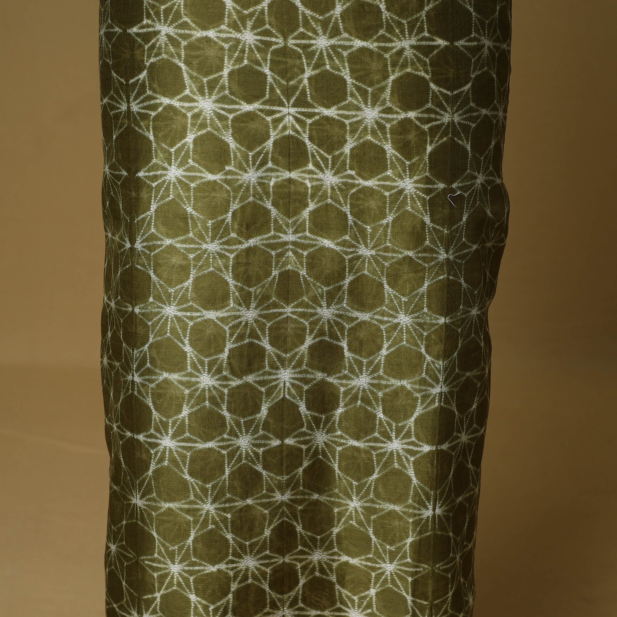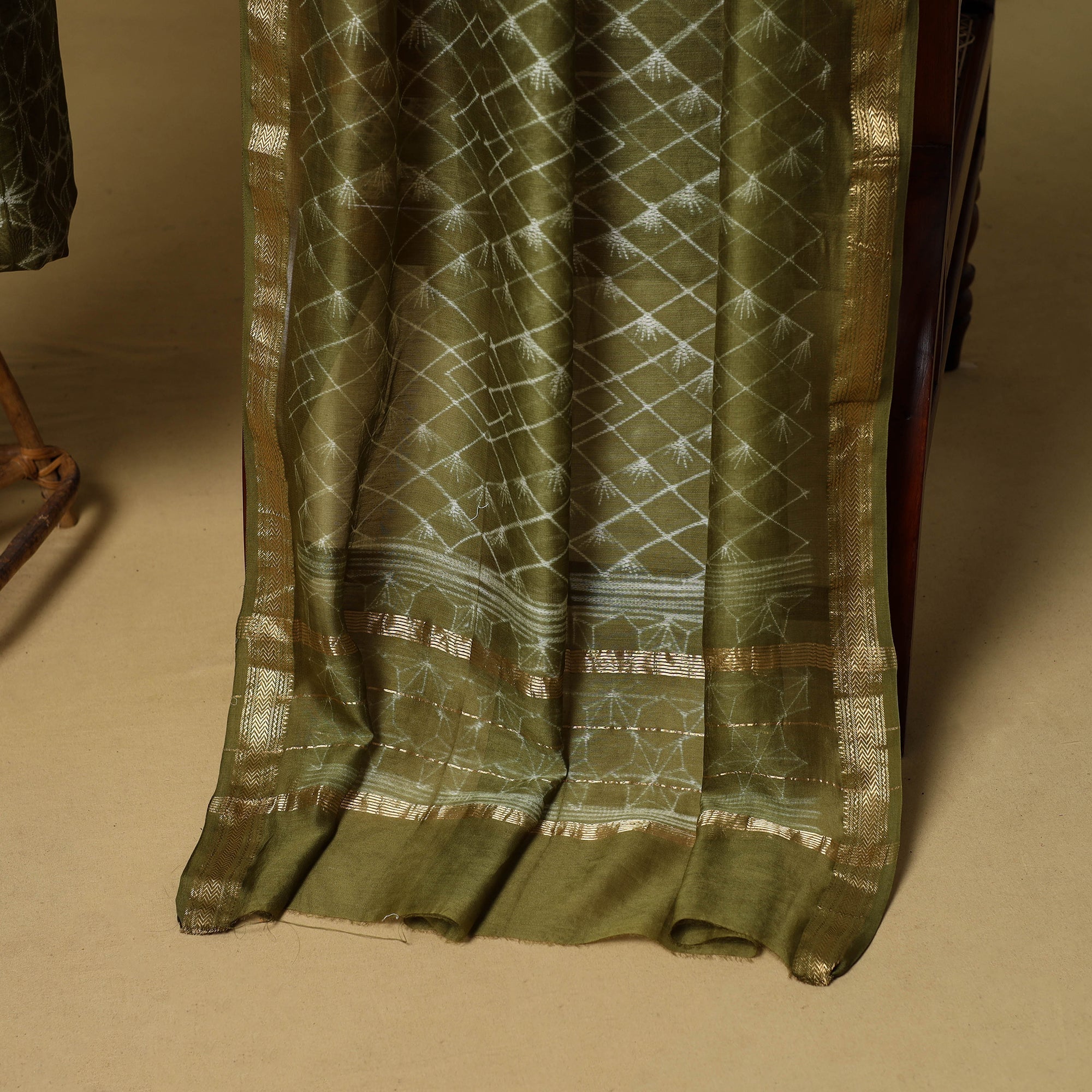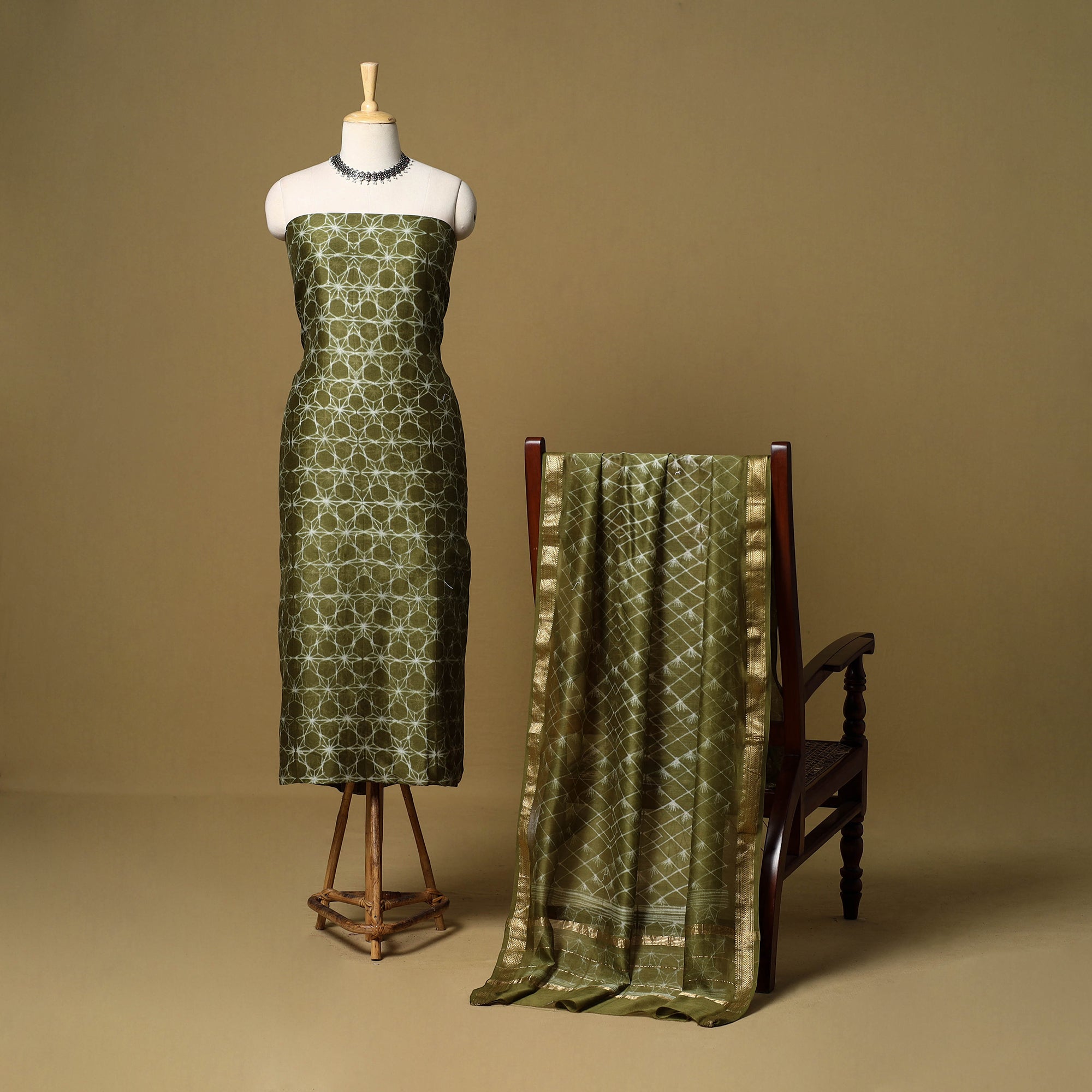 Green 2pc nui shibori dress material with a zari border is crafted from Maheshwari silk-cotton fabric. Shibori is a traditional tie-dye technique where the fabric is carefully tied and dyed to create unique patterns and textures. Each piece reflects Rajasthani artistry. Perfect for both festive occasions and everyday wear, the set includes a kurta and a matching dupatta.