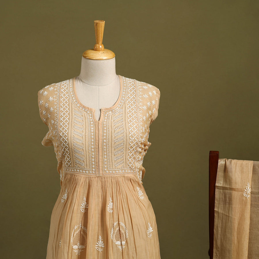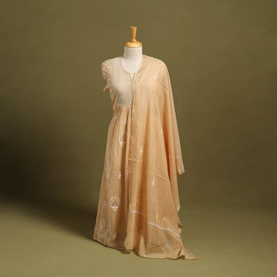 This beige chanderi silk x mul cotton semi-stitched orange Anarkali kurta with dupatta showcases exquisite lucknowi heavy chikankari hand embroidery. The lightweight and breathable mul chanderi fabric ensures comfort, while the semi-stitched design allows for a tailored fit. Adorned with intricate threadwork, this ensemble embodies the timeless elegance of traditional artistry, making it an ideal choice for festive and cultural celebrations.