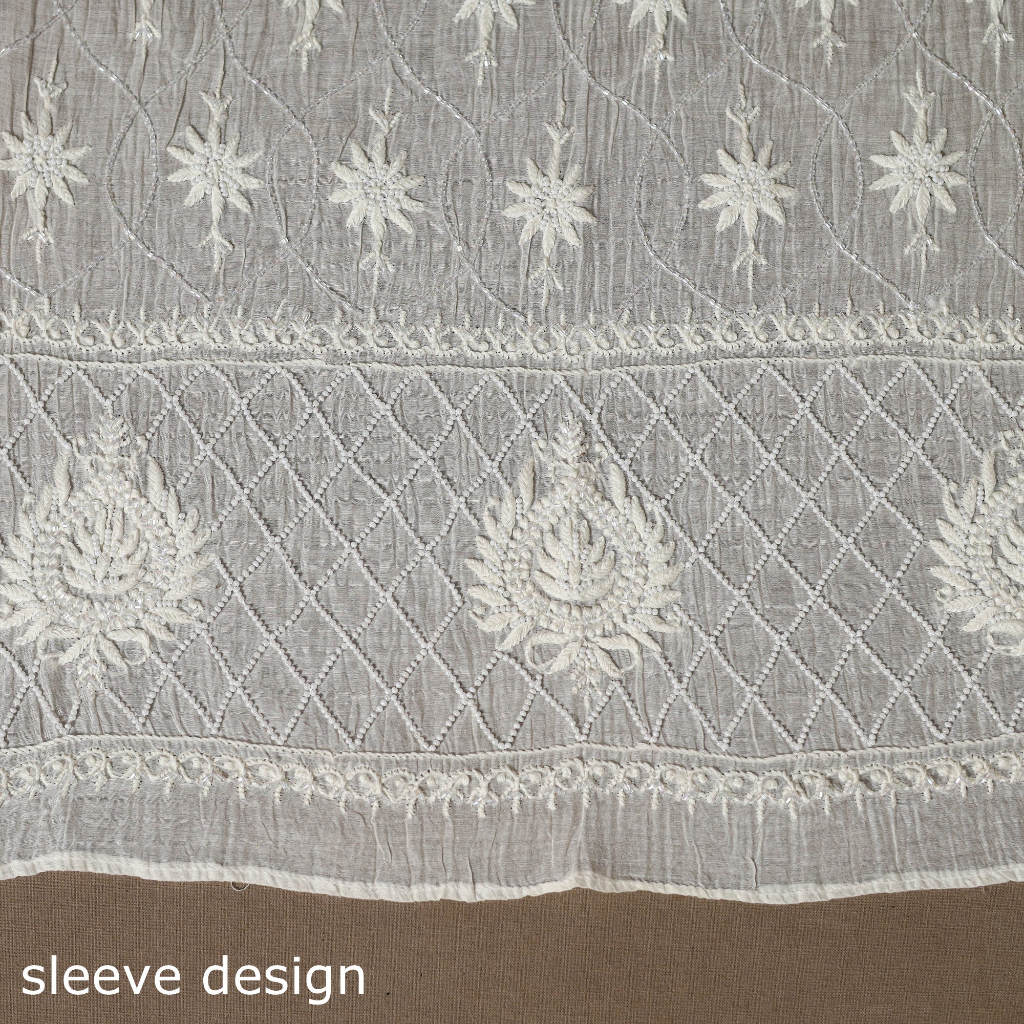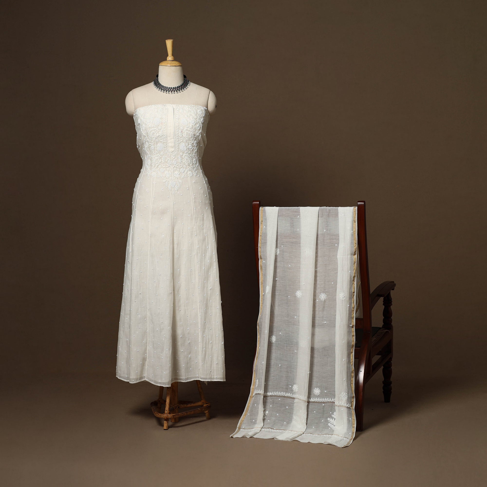 White - Lucknowi Chikankari Hand Work Pochampally Ikat Unstitched Kurta Material (2.45M) 45