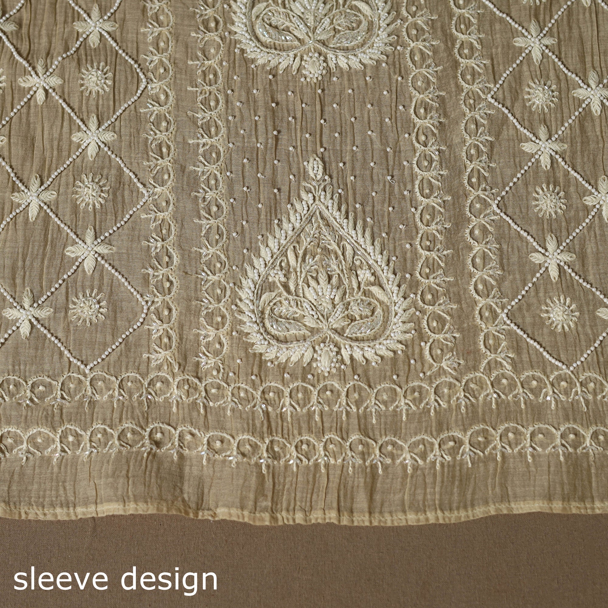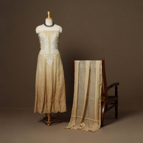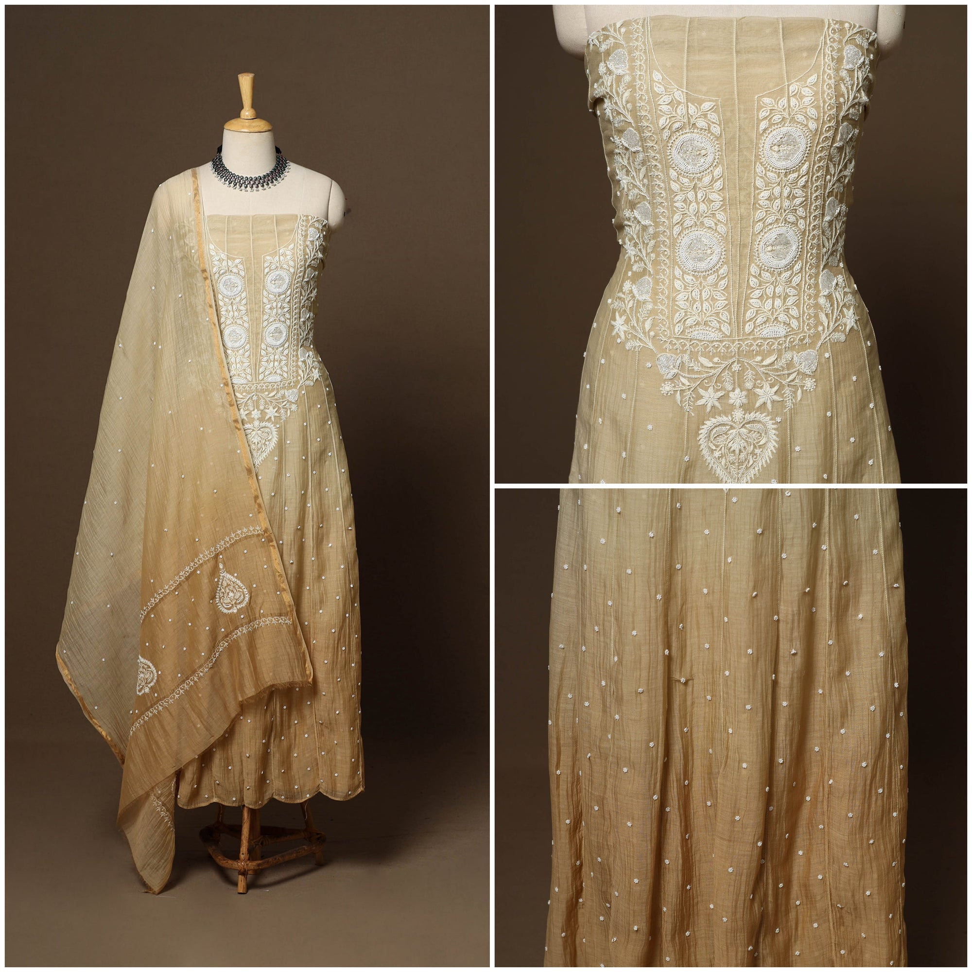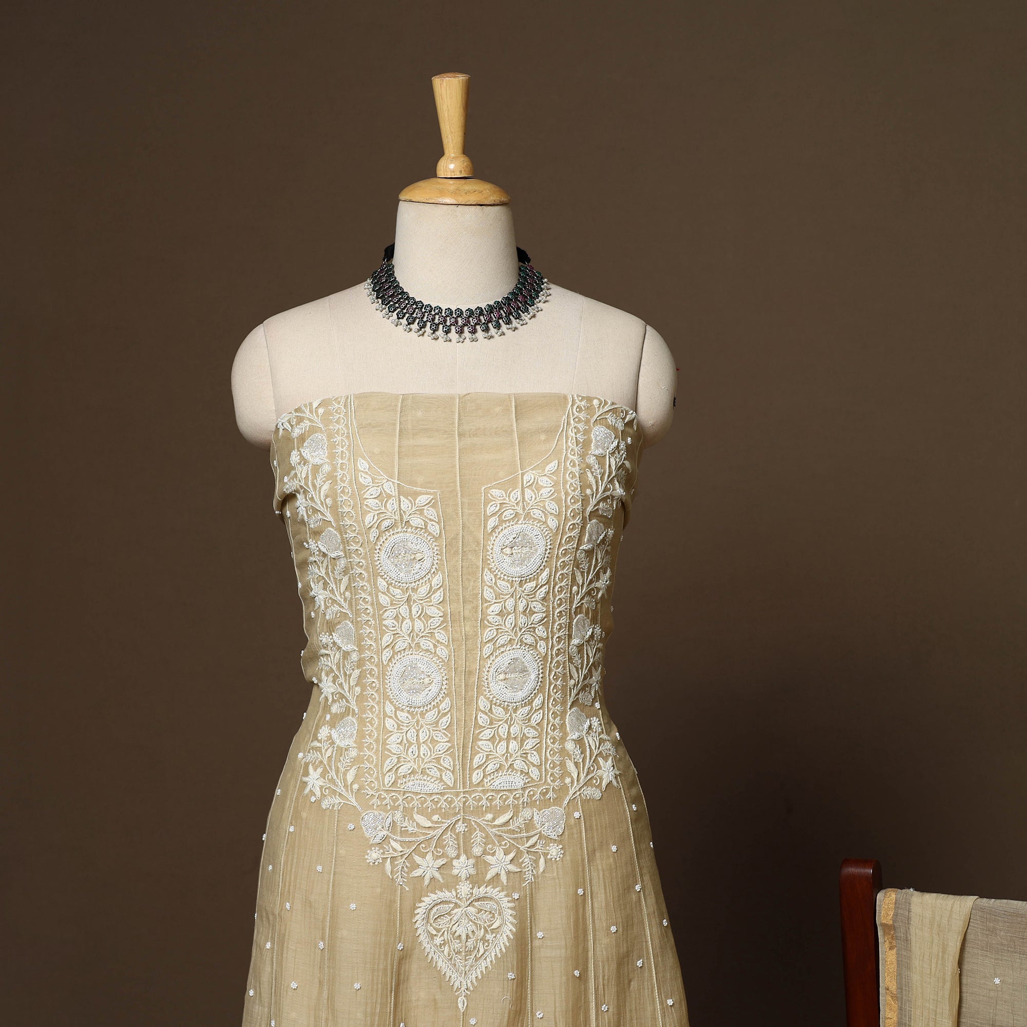 Intricately and artfully crafted, this beige 2pc heavy chikankari handloom chanderi silk x mul cotton semi-stitched anarkali kurta with dupatta celebrates the heritage handwork of Lucknow, Uttar Pradesh. Known for its delicate thread motifs and subtle elegance, Chikankari features meticulously hand-embroidered designs made with soft pastel threads that form graceful floral and paisley patterns. Traditional stitches such as bakhiya, pechni, channapatti, murri, and ghaspatti and resham aari enhance its artistry. The beads and cutdana detailing add a refined touch, making it perfect for weddings, festive celebrations, cultural gatherings, and elegant evening occasions.