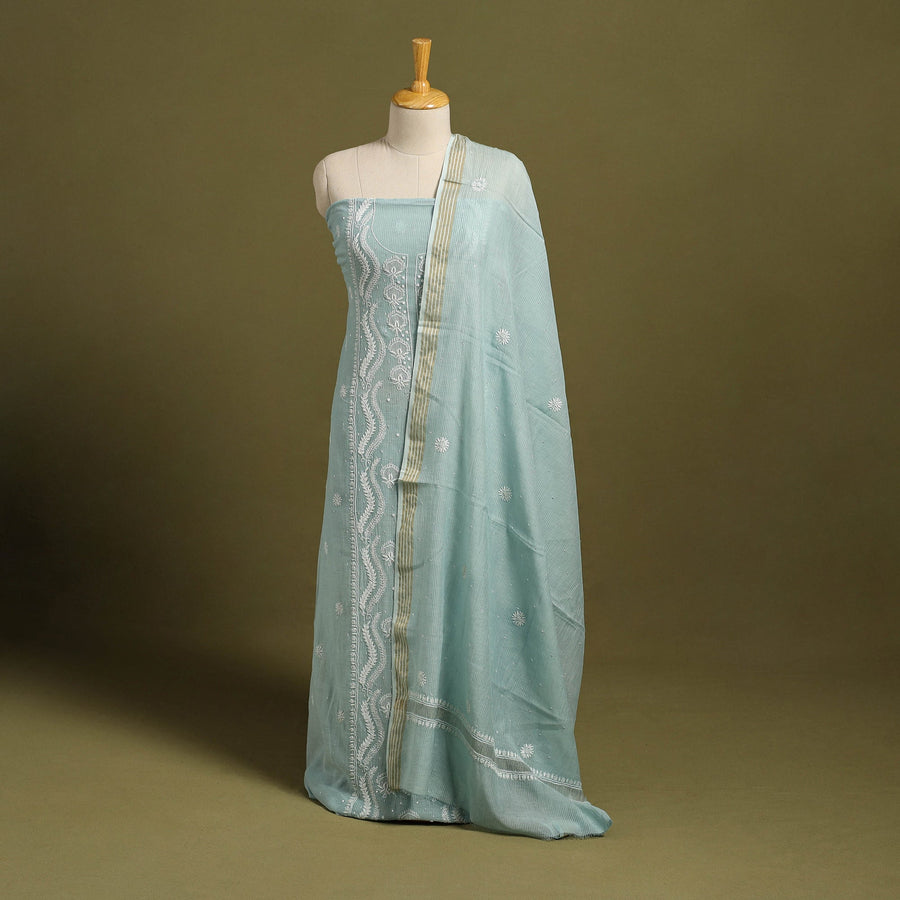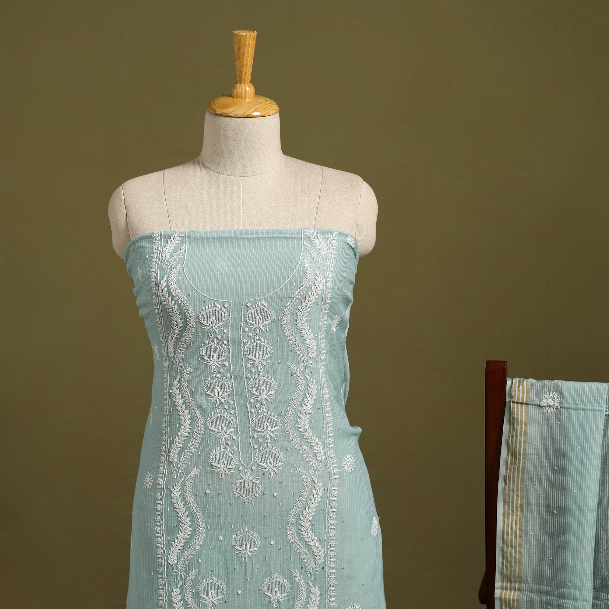 Lucknowi Chikankari Hand Work Pochampally Ikat Unstitched Kurta Material (2.45M) 43