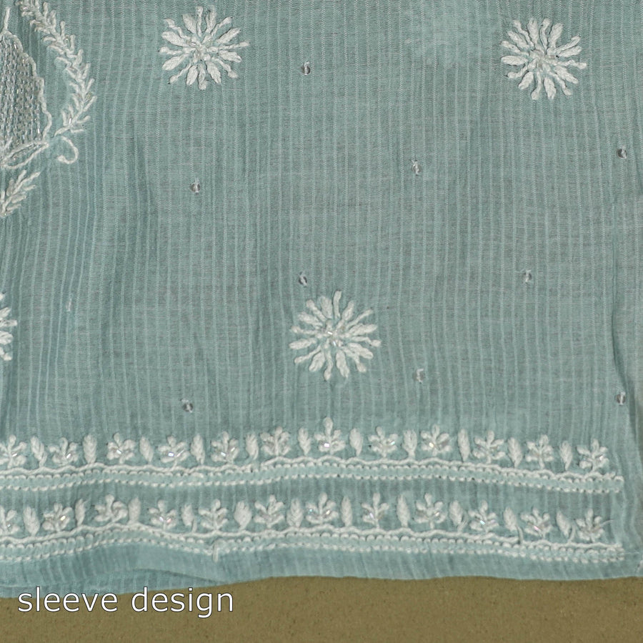 Delicate chikankari embroidery from Meharki Chikan—hand-embroidered kurtas and fabrics crafted by skilled women artisans in soft hues.
