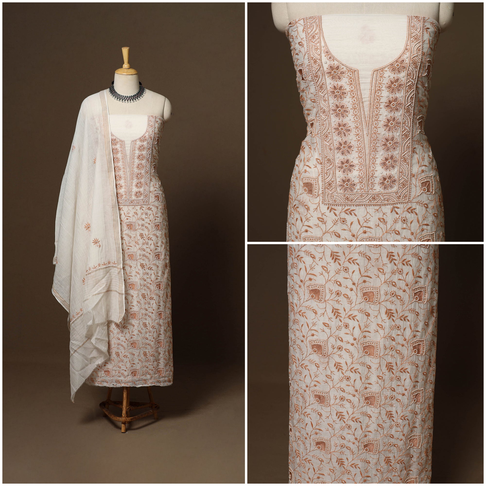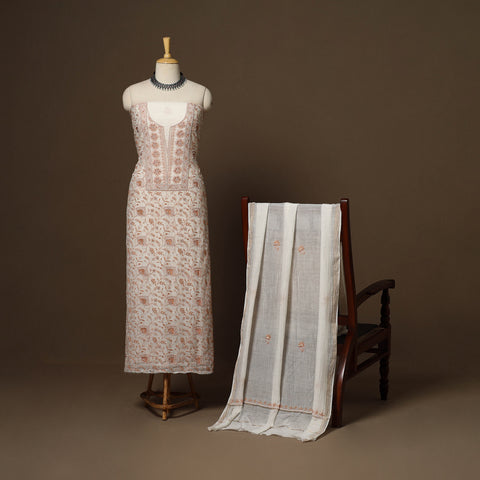Intricately and artfully crafted, this beige heavy chikankari handloom chanderi silk x mul cotton unstitched 2pc dress material celebrates the heritage handwork of Lucknow, Uttar Pradesh. Known for its delicate thread motifs and subtle elegance, Chikankari features meticulously hand-embroidered designs made with soft pastel threads that form graceful floral and paisley patterns. Traditional stitches such as bakhiya, pechni, keel, kangan, and ghaspatti enhance its artistry. The beads, sequins and cutdana detailing add a refined touch, making it perfect for weddings, festive celebrations, cultural gatherings, and elegant evening occasions.