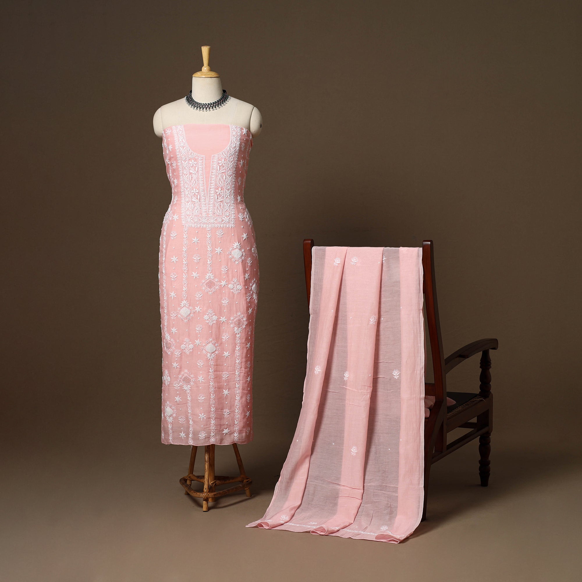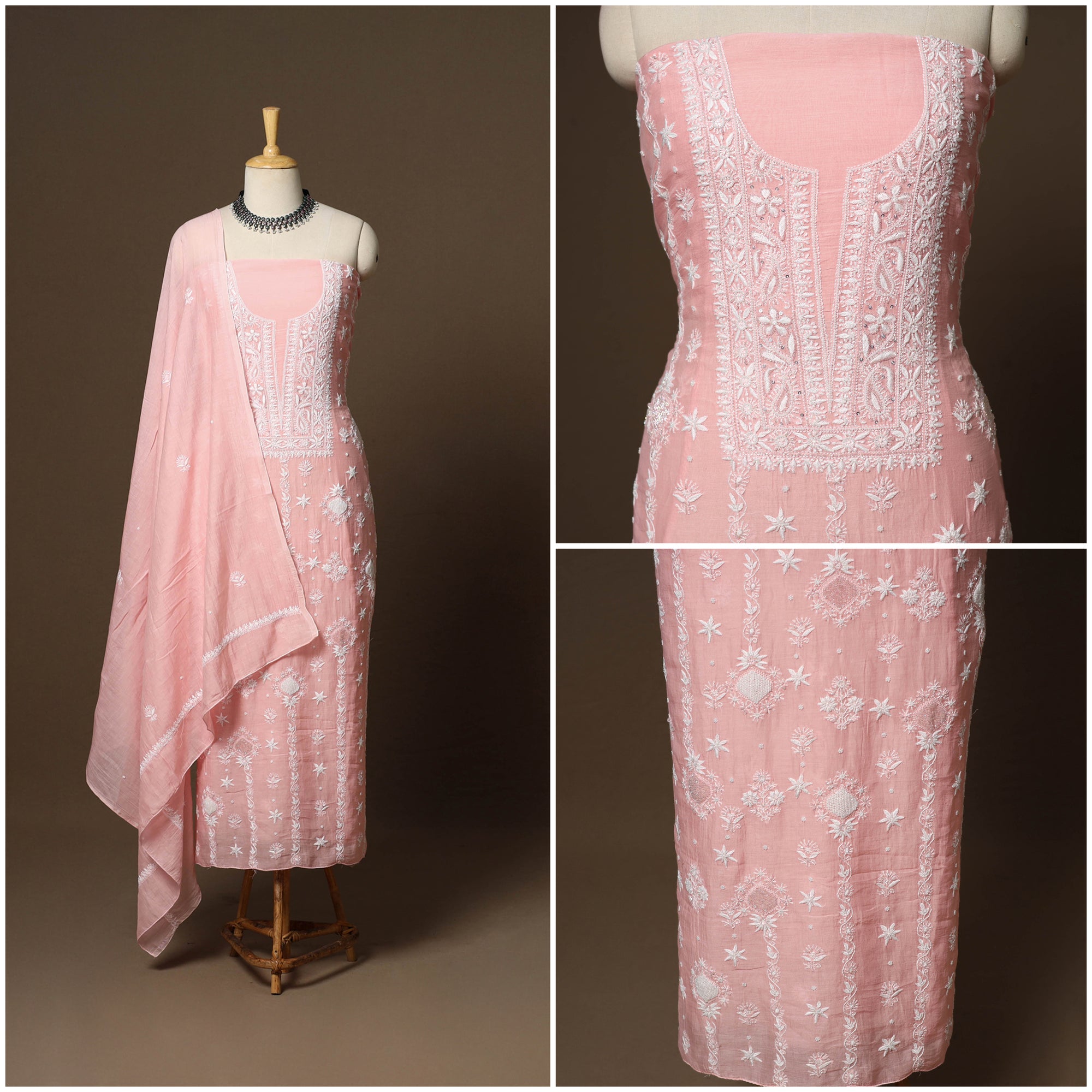 Intricately and artfully crafted, this pink heavy chikankari handloom chanderi silk x mul cotton unstitched 2pc dress material celebrates the heritage handwork of Lucknow, Uttar Pradesh. Known for its delicate thread motifs and subtle elegance, Chikankari features meticulously hand-embroidered designs made with soft pastel threads that form graceful floral and paisley patterns. Traditional stitches such as bakhiya, pechni, keel, kangan, and ghaspatti enhance its artistry. The beads, sequins and cutdana detailing add a refined touch, making it perfect for weddings, festive celebrations, cultural gatherings, and elegant evening occasions. The set includes fabric for kurta and dupatta.