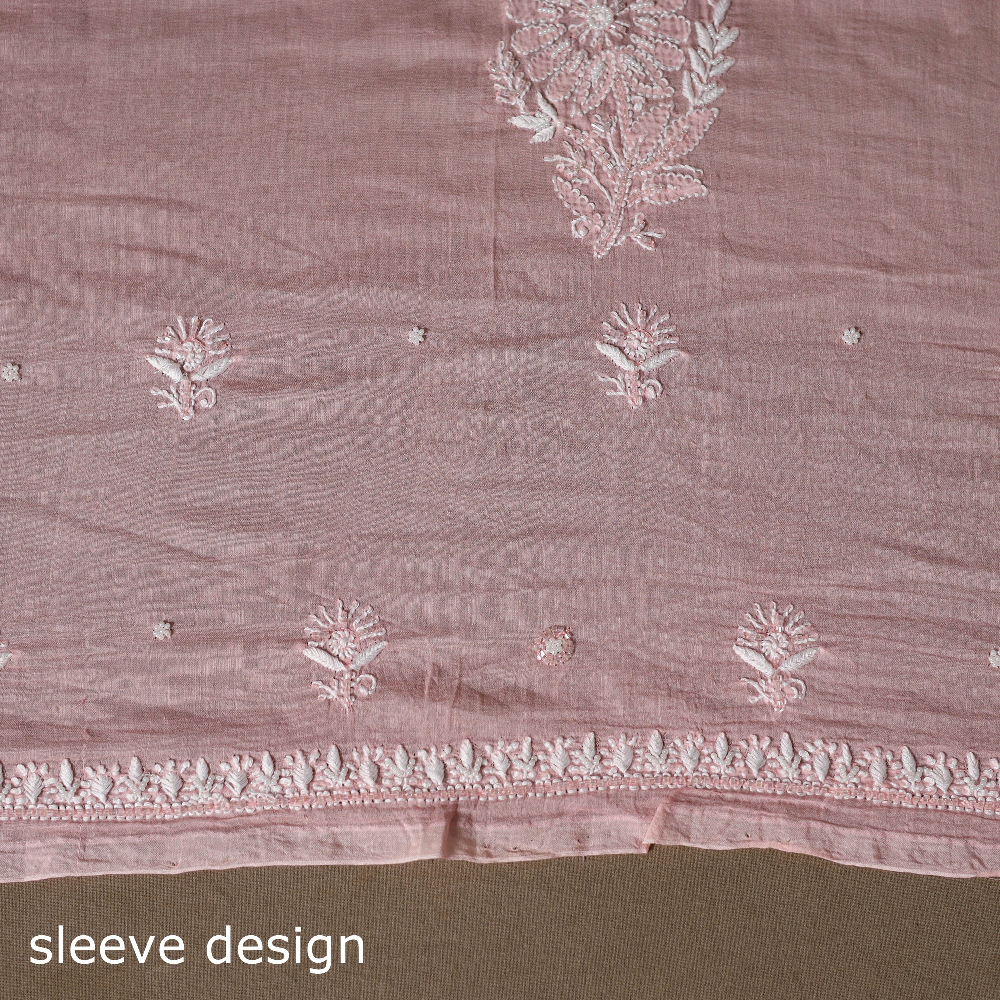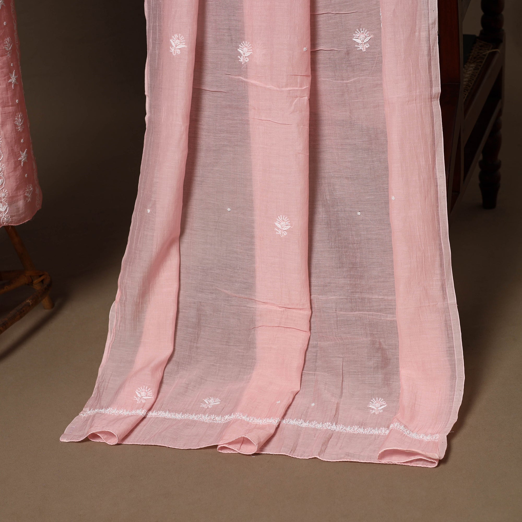 Delicate chikankari embroidery from Meharki Chikan—hand-embroidered kurtas and fabrics crafted by skilled women artisans in soft hues.