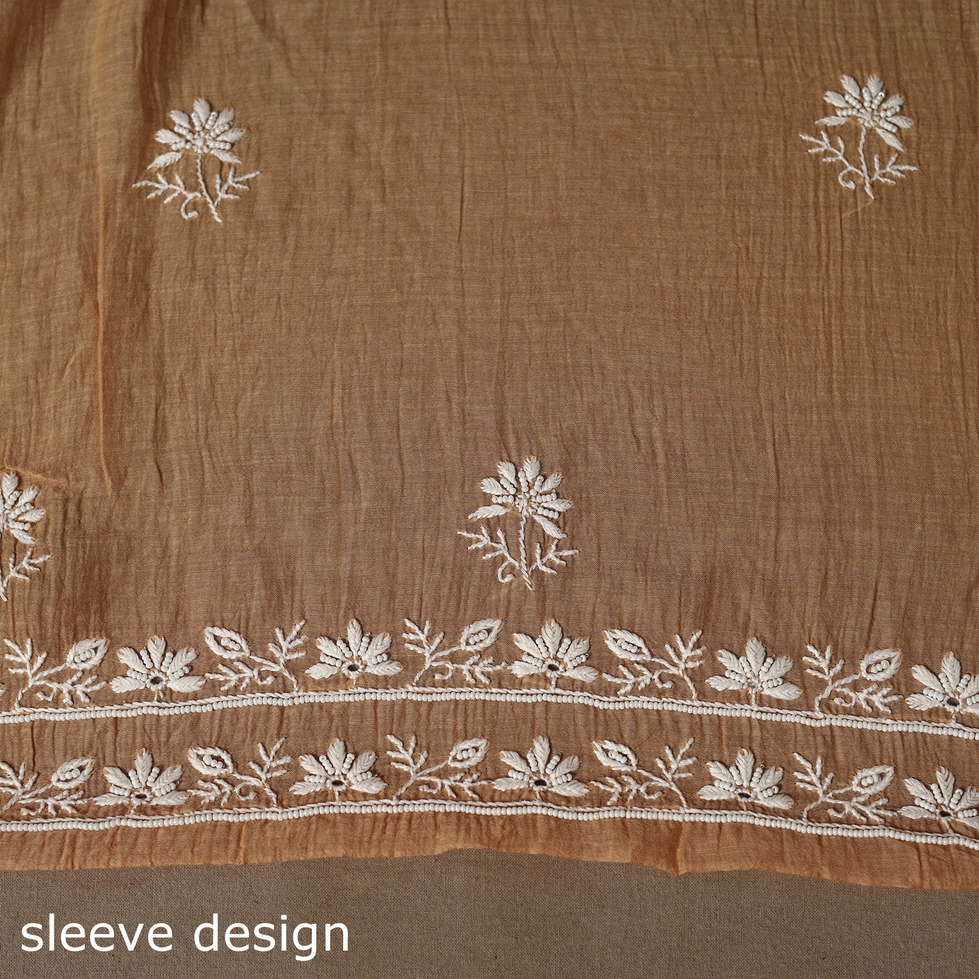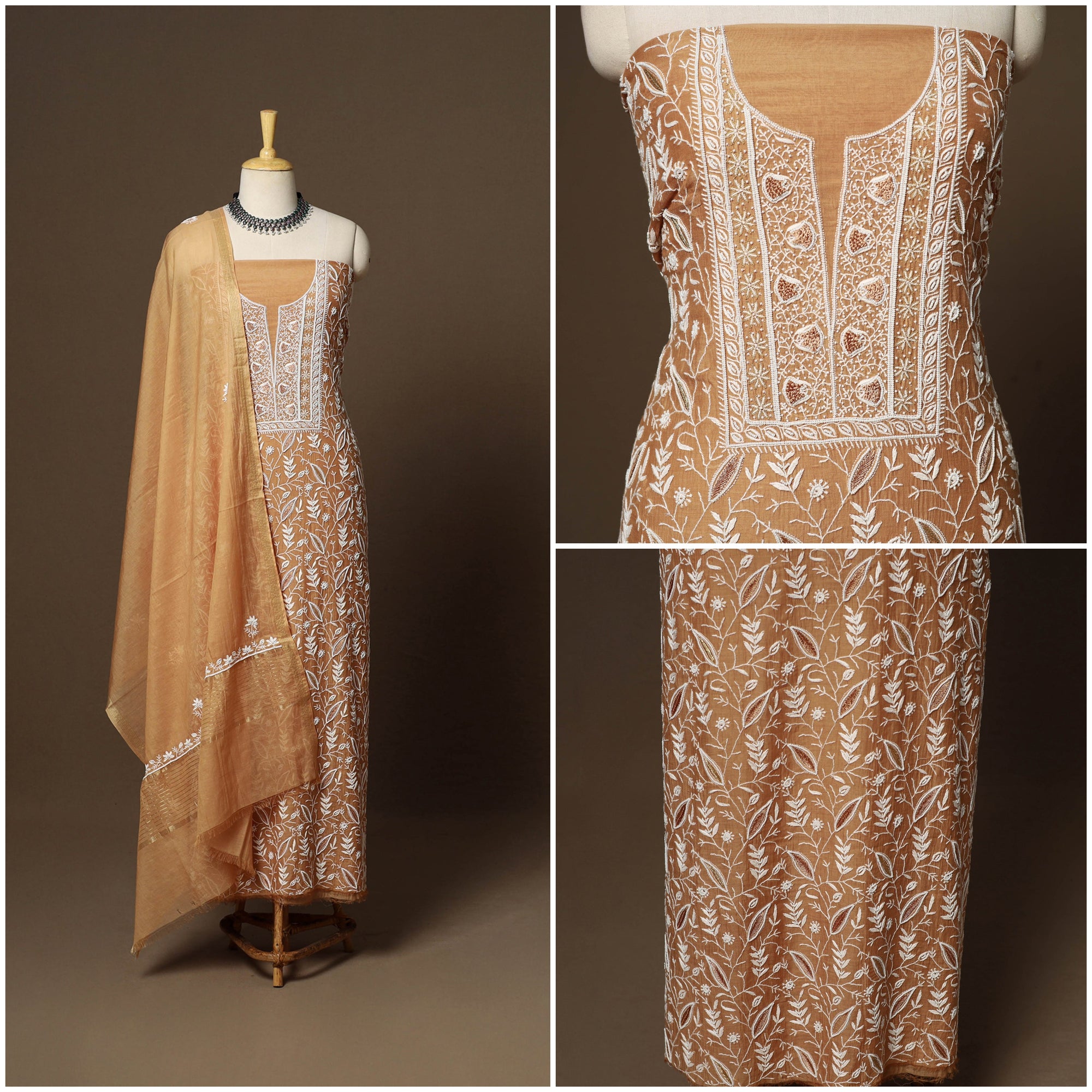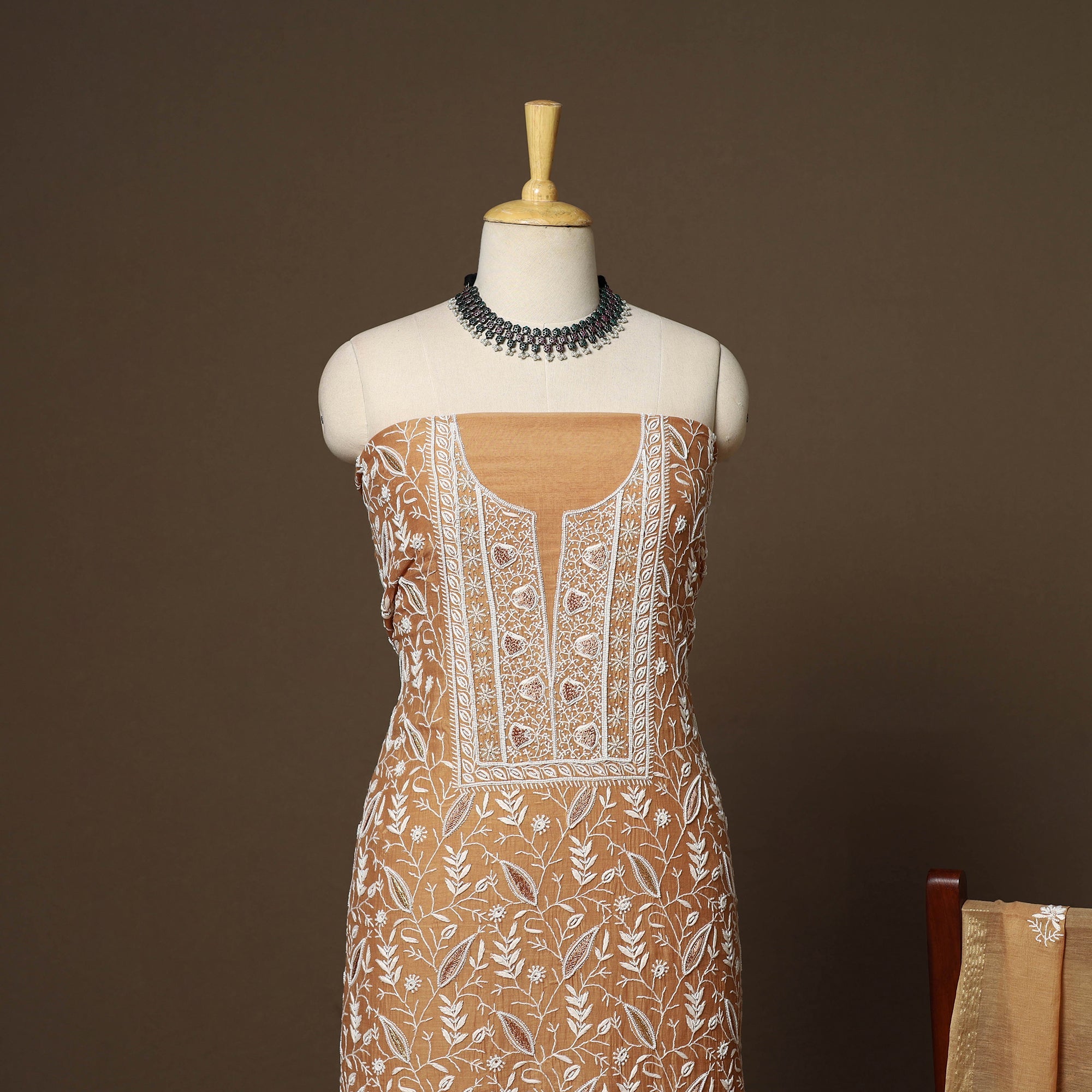 Intricately and artfully crafted, this brown heavy chikankari handloom chanderi silk x mul cotton unstitched 2pc dress material celebrates the heritage handwork of Lucknow, Uttar Pradesh. Known for its delicate thread motifs and subtle elegance, Chikankari features meticulously hand-embroidered designs made with soft pastel threads that form graceful floral and paisley patterns. Traditional stitches such as bakhiya, pechni, keel, kangan, and ghaspatti enhance its artistry. The beads, sequins and cutdana detailing add a refined touch, making it perfect for weddings, festive celebrations, cultural gatherings, and elegant evening occasions. The set includes fabric for kurta and dupatta.