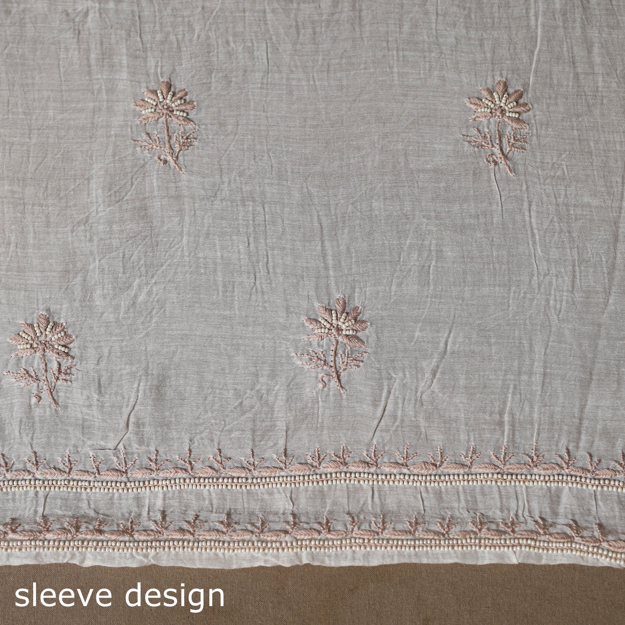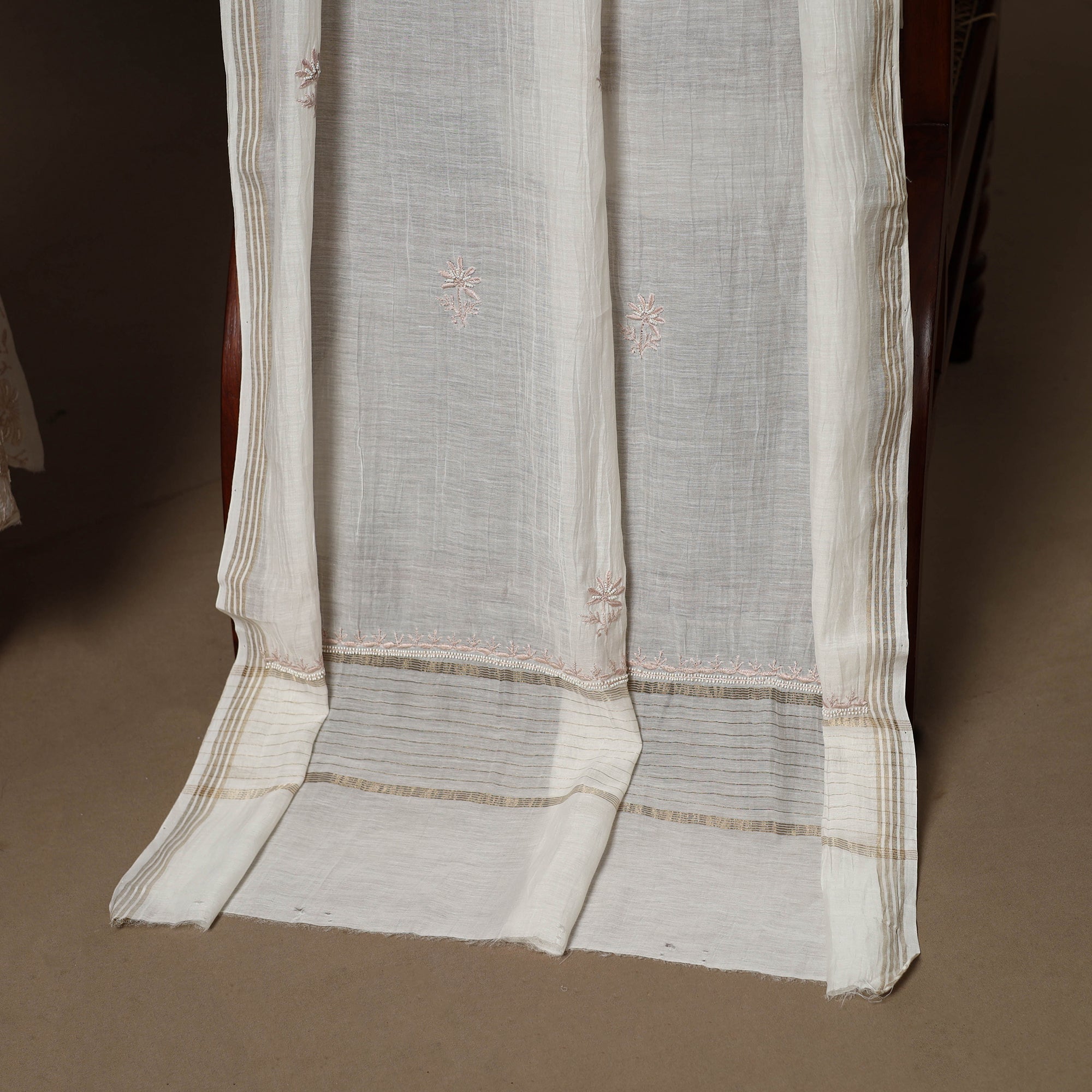 Delicate chikankari embroidery from Meharki Chikan—hand-embroidered kurtas and fabrics crafted by skilled women artisans in soft hues.