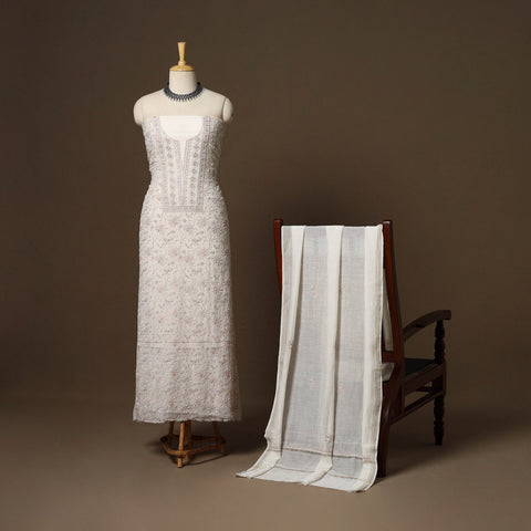 White - Lucknowi Chikankari Hand Work Pochampally Ikat Unstitched Kurta Material (2.45M) 45