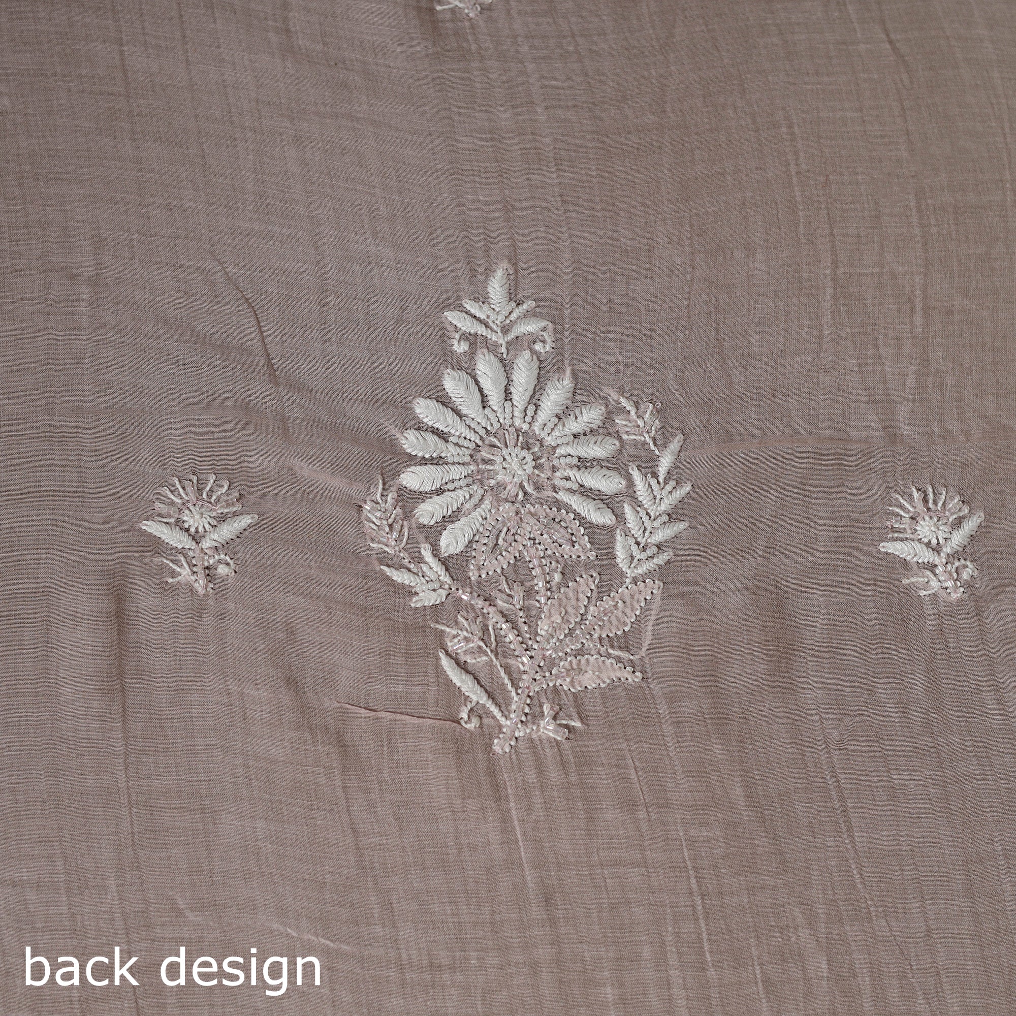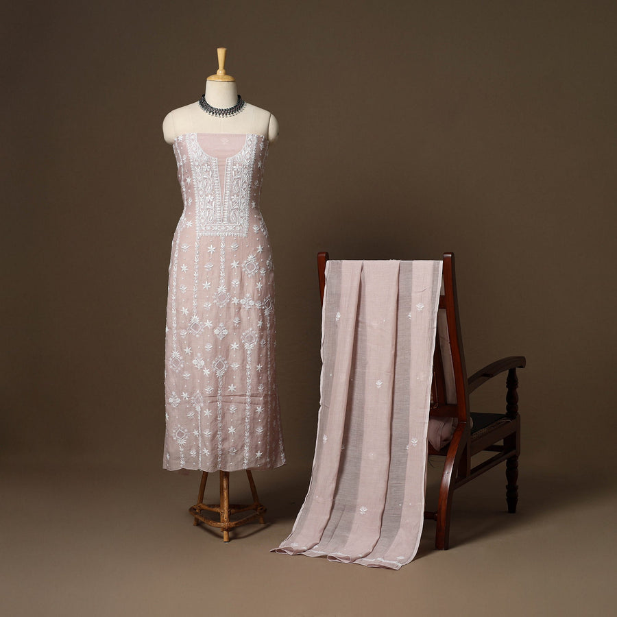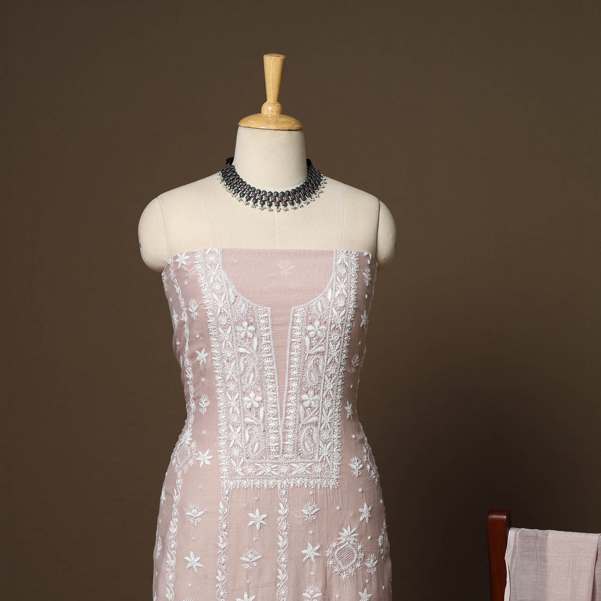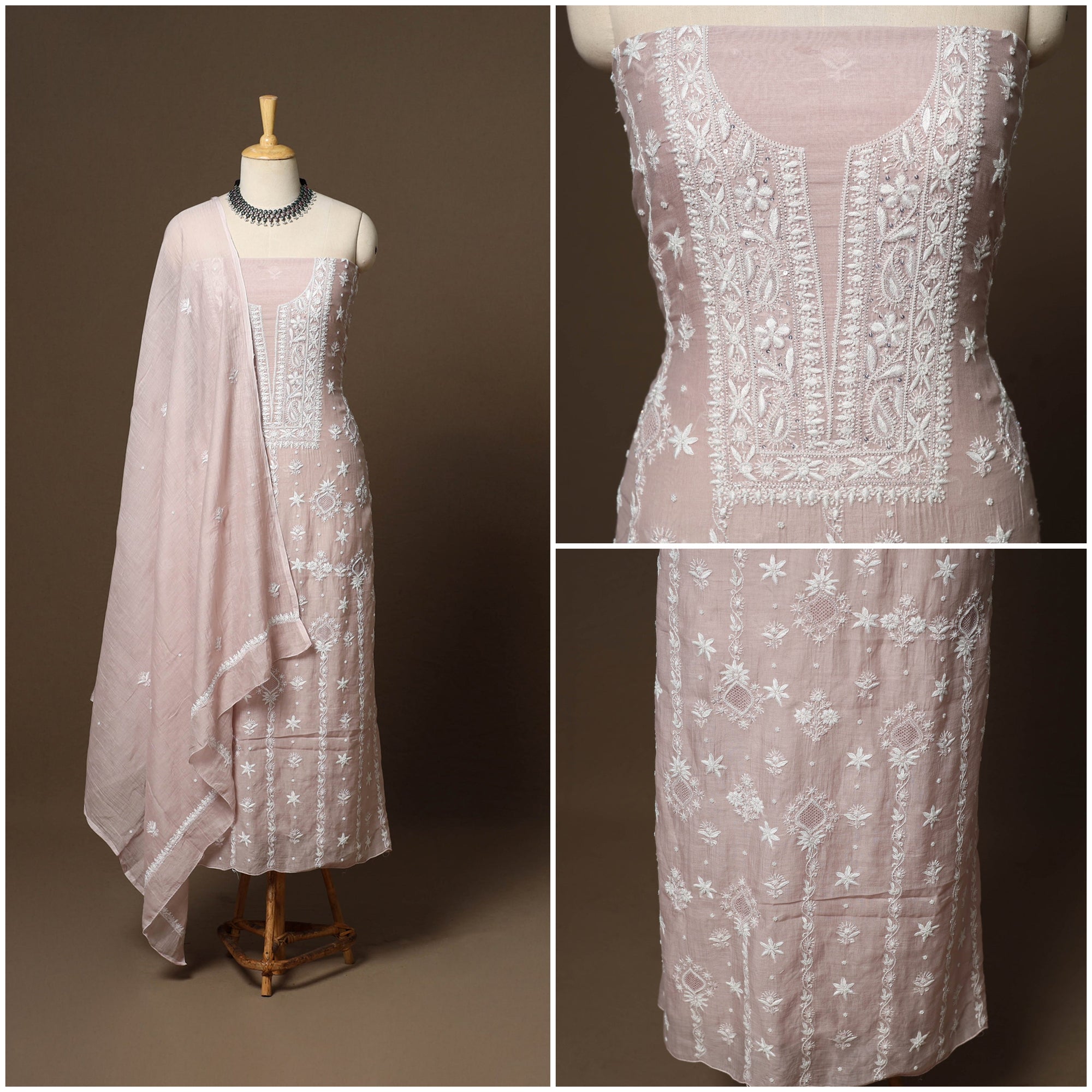 Intricately and artfully crafted, this pink heavy chikankari handloom chanderi silk x mul cotton unstitched 2pc dress material celebrates the heritage handwork of Lucknow, Uttar Pradesh. Known for its delicate thread motifs and subtle elegance, Chikankari features meticulously hand-embroidered designs made with soft pastel threads that form graceful floral and paisley patterns. Traditional stitches such as bakhiya, pechni, keel, kangan, and ghaspatti enhance its artistry. The beads, sequins and cutdana detailing add a refined touch, making it perfect for weddings, festive celebrations, cultural gatherings, and elegant evening occasions. The set includes fabric for kurta and dupatta.