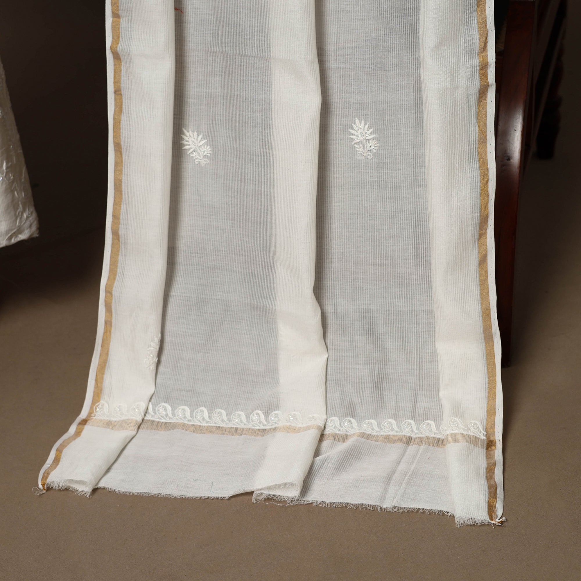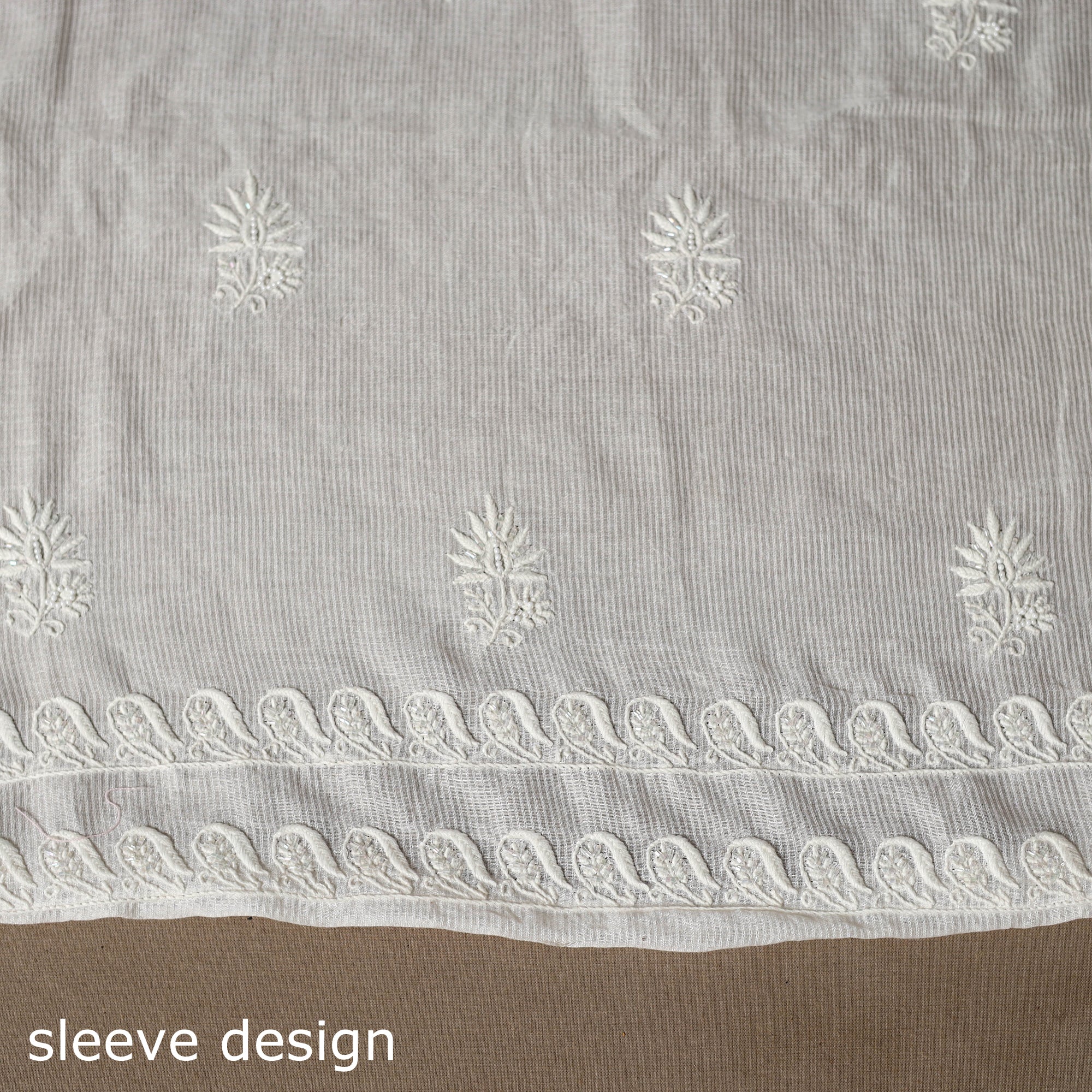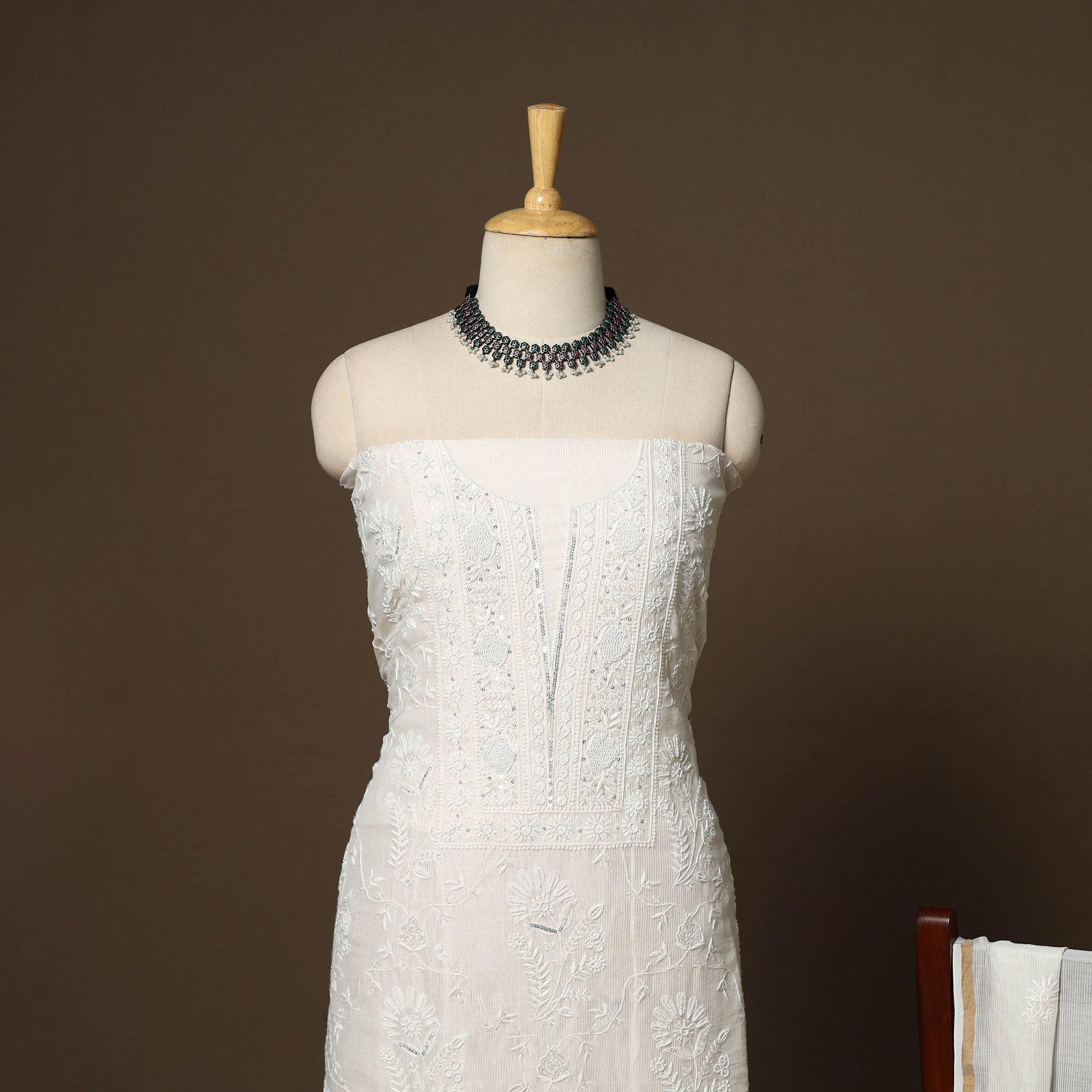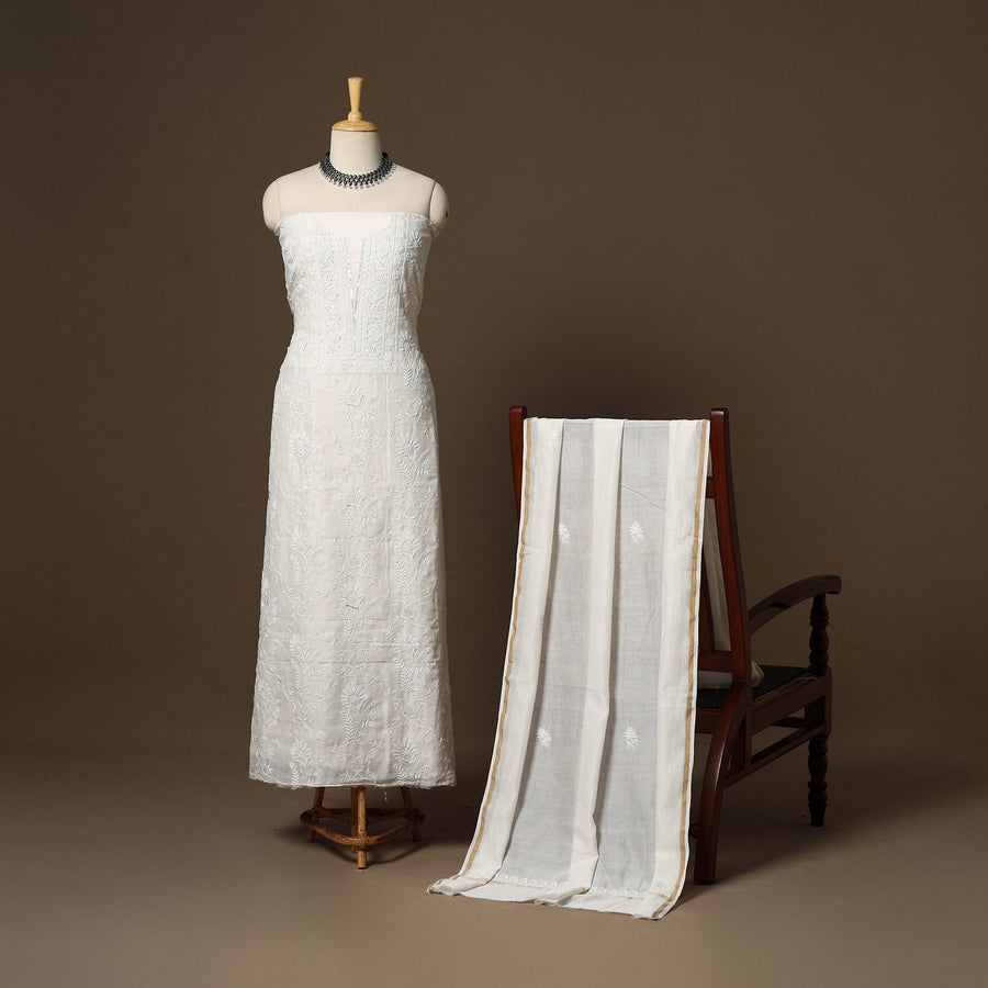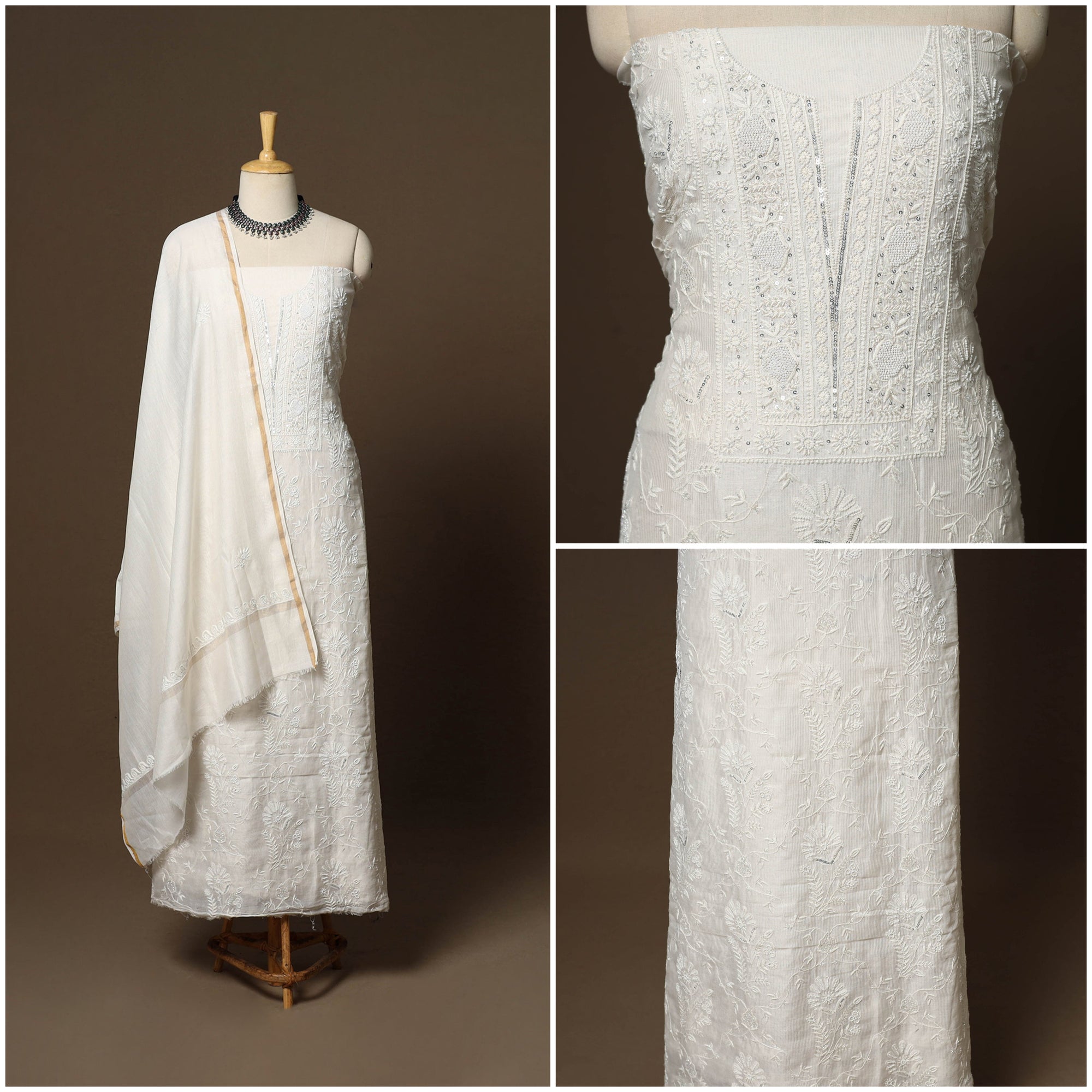 White - Lucknowi Chikankari Hand Work Pochampally Ikat Unstitched Kurta Material (2.45M) 45