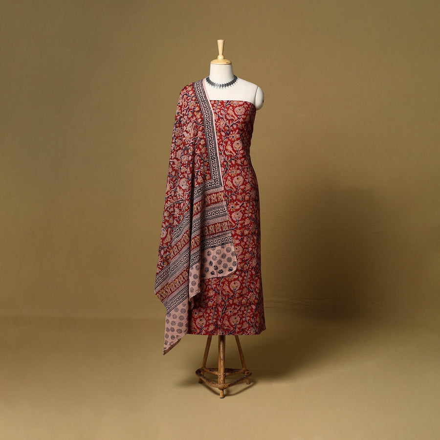 Red 2pc cotton dress material set features kalamkari block printing made with natural dyes. It includes cotton fabric for the kurta and a matching dupatta, both designed using carved wooden blocks. Comfortable and easy to stitch, this set is a good choice for everyday wear while adding a subtle touch of cultural charm to your outfit.