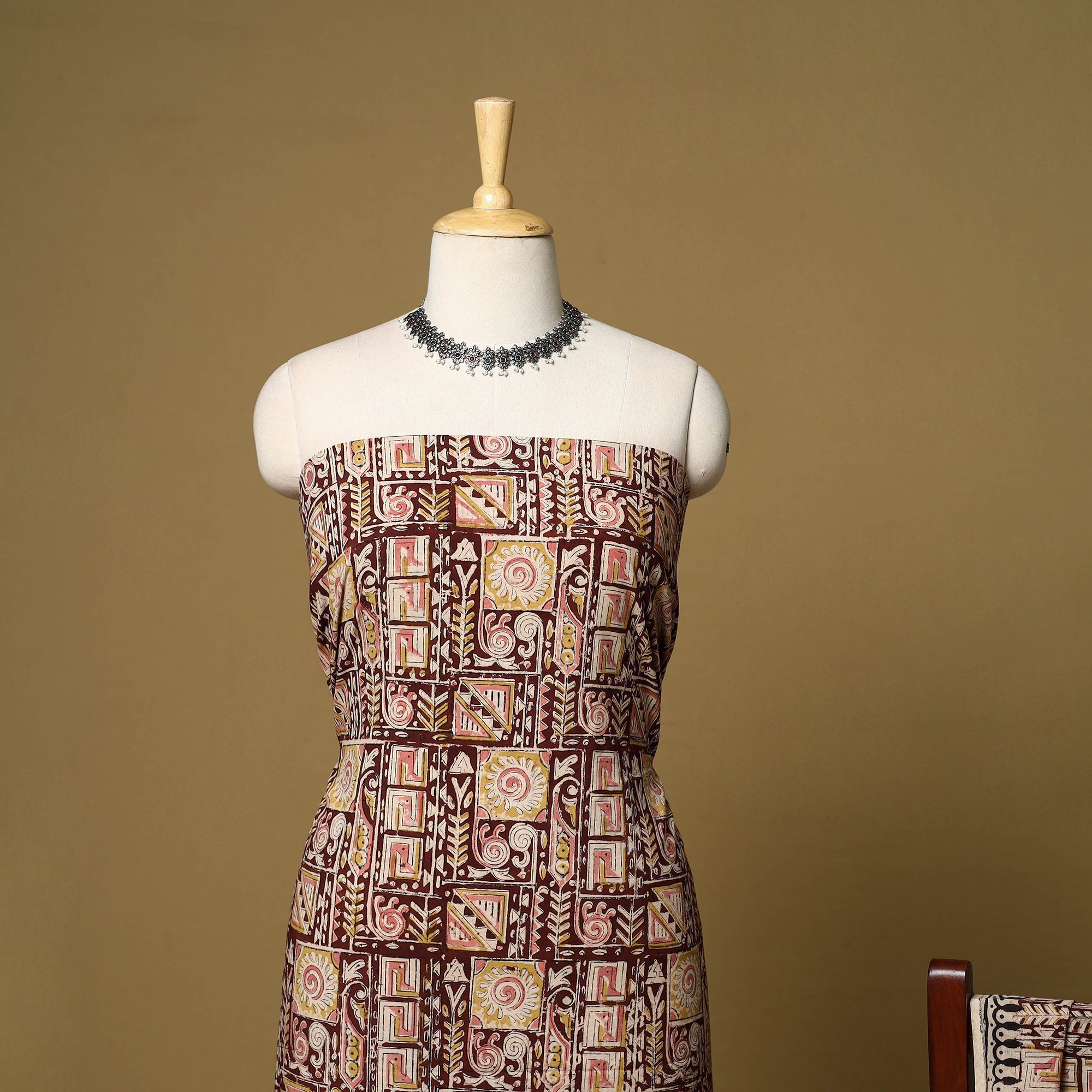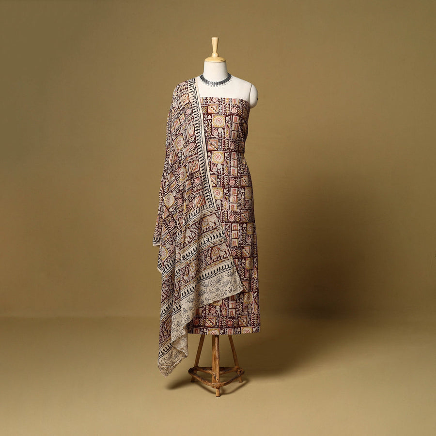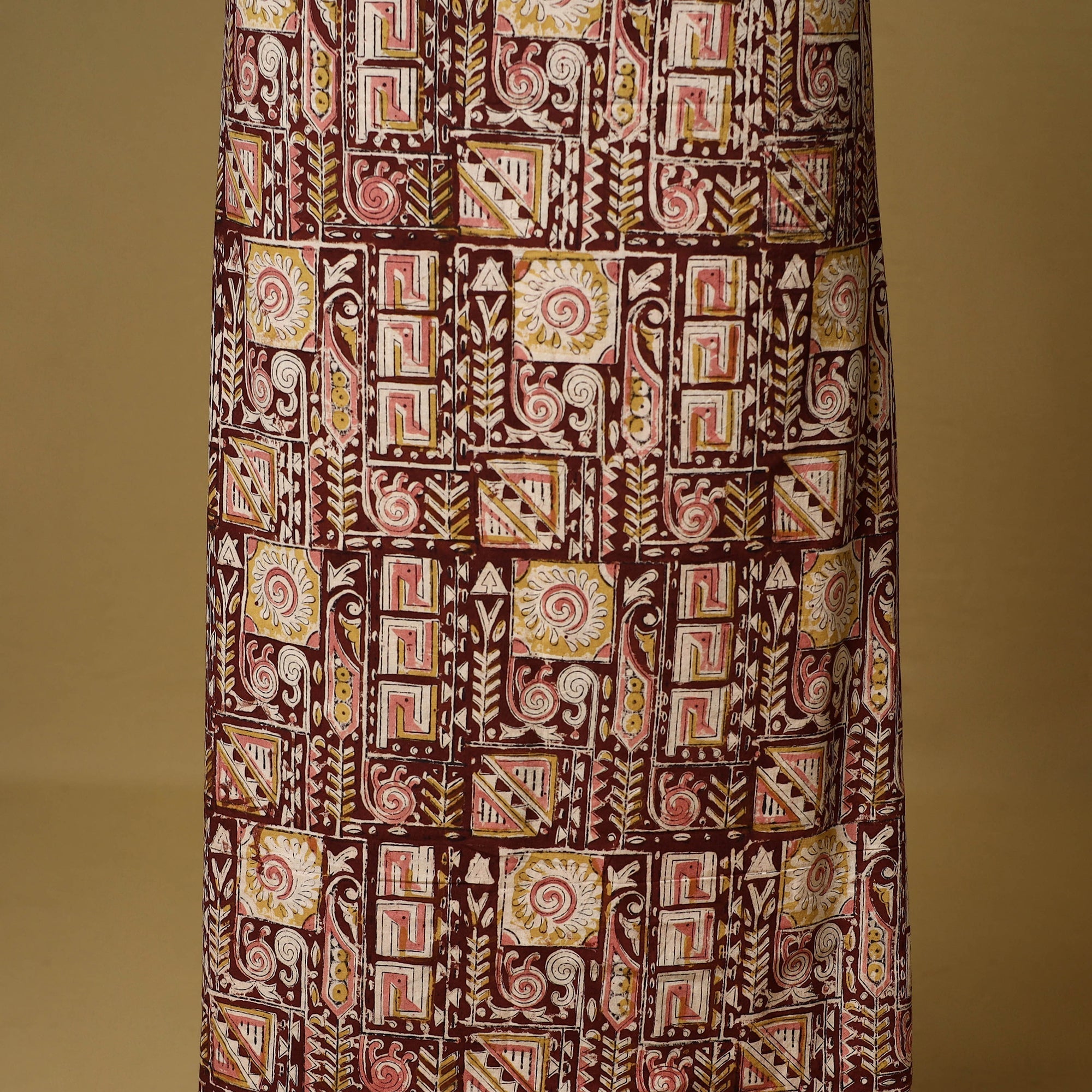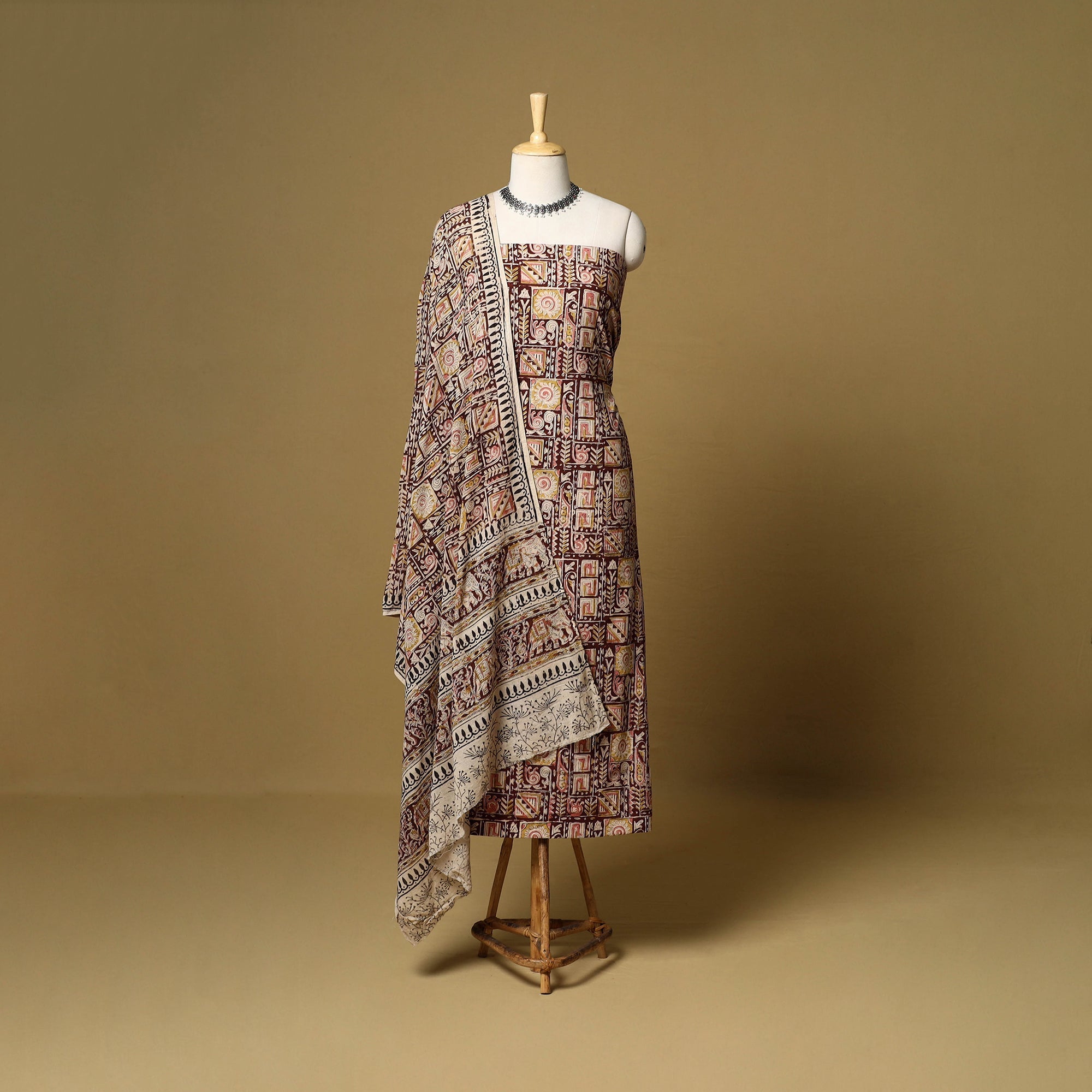 Maroon 2pc cotton dress material set features kalamkari block printing made with natural dyes. It includes cotton fabric for the kurta and a matching dupatta, both designed using carved wooden blocks. Comfortable and easy to stitch, this set is a good choice for everyday wear while adding a subtle touch of cultural charm to your outfit.