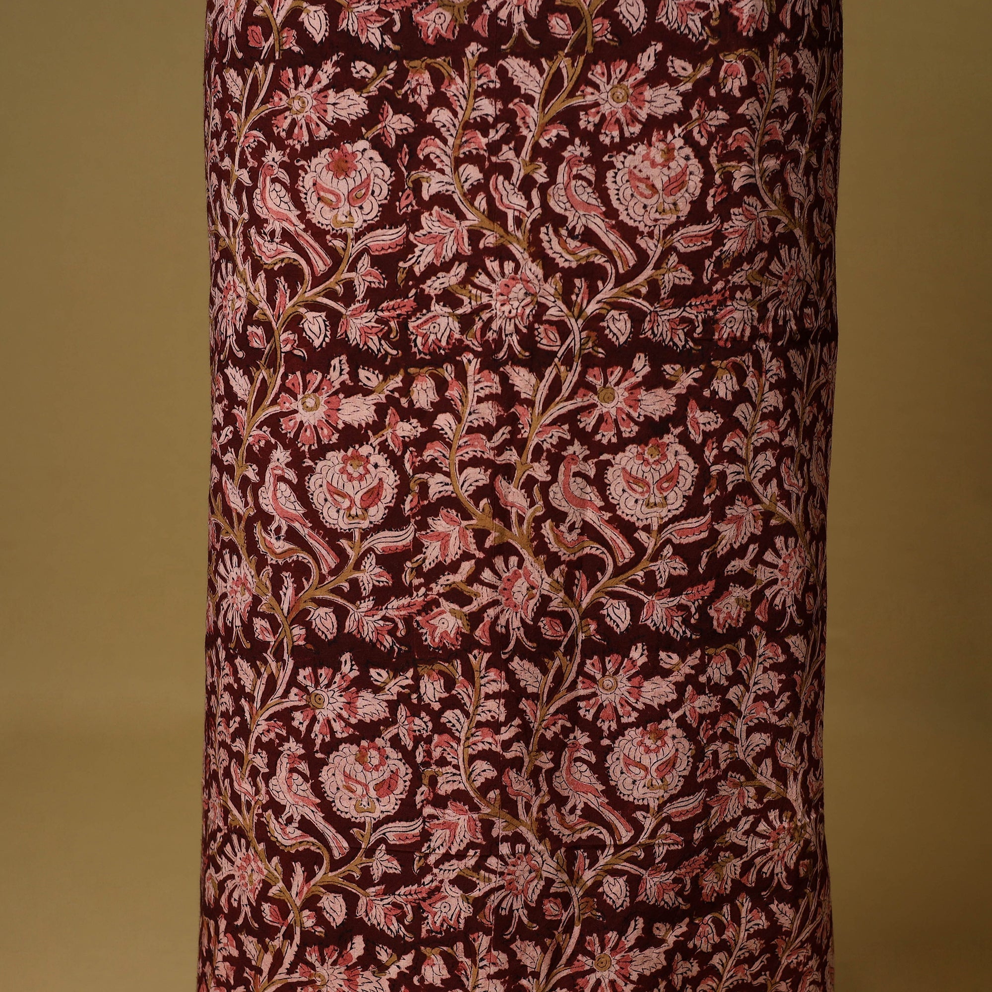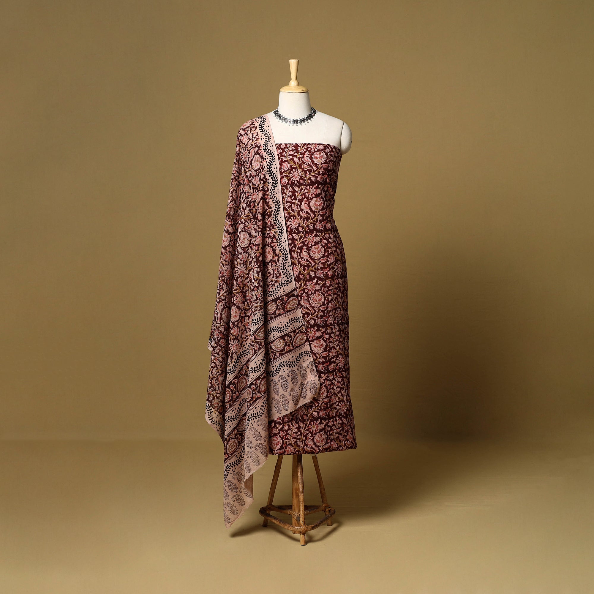 Maroon 2pc cotton dress material set features kalamkari block printing made with natural dyes. It includes cotton fabric for the kurta and a matching dupatta, both designed using carved wooden blocks. Comfortable and easy to stitch, this set is a good choice for everyday wear while adding a subtle touch of cultural charm to your outfit.