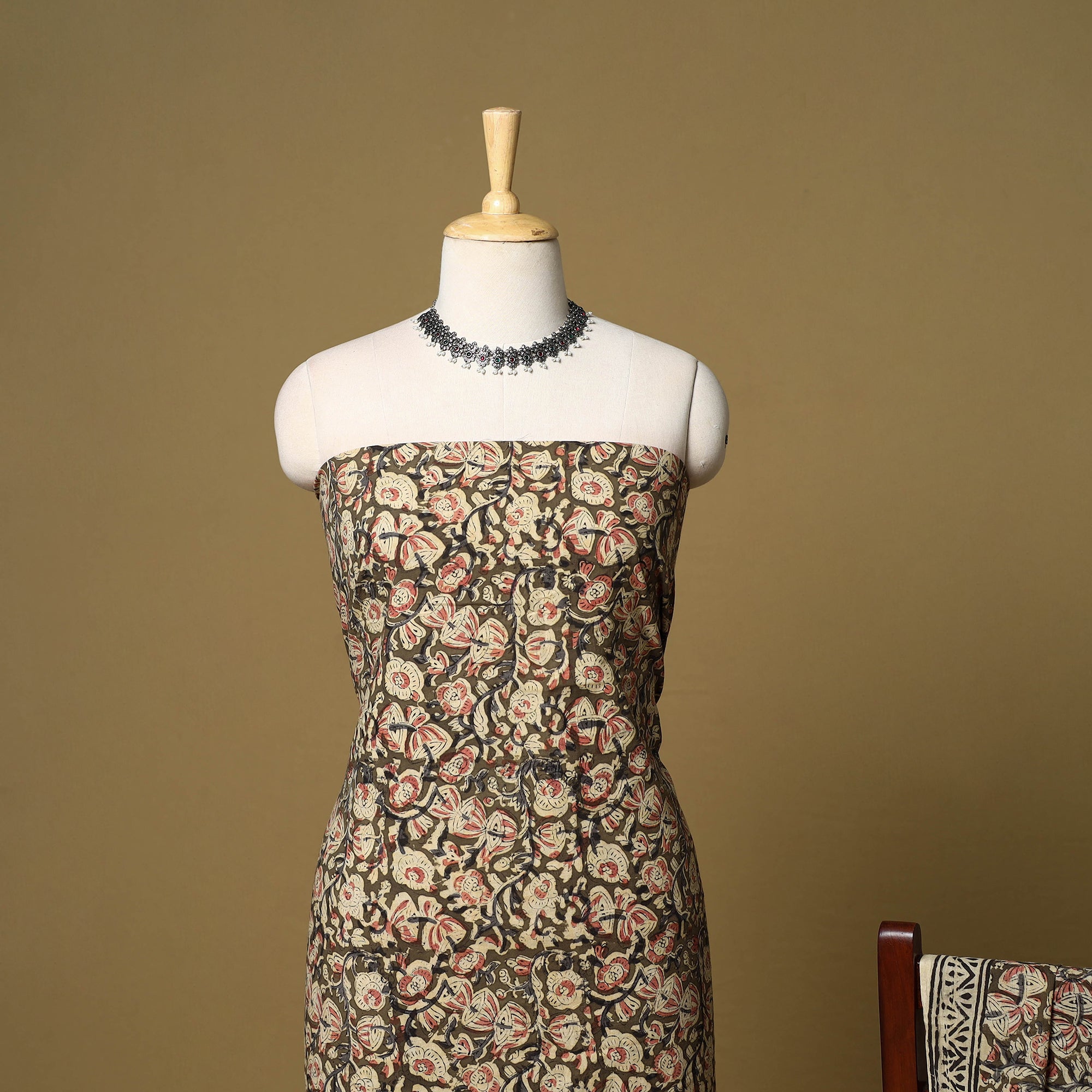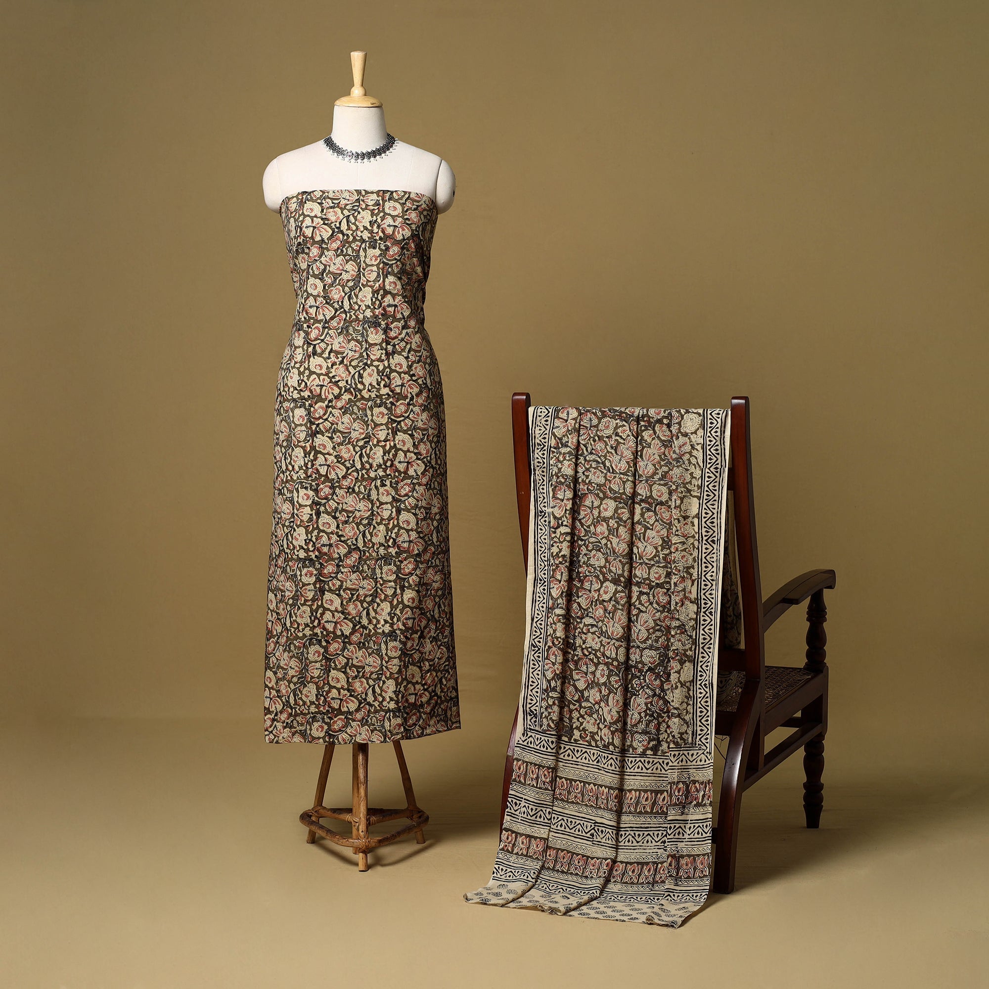 Brown 2pc cotton dress material set features kalamkari block printing made with natural dyes. It includes cotton fabric for the kurta and a matching dupatta, both designed using carved wooden blocks. Comfortable and easy to stitch, this set is a good choice for everyday wear while adding a subtle touch of cultural charm to your outfit.