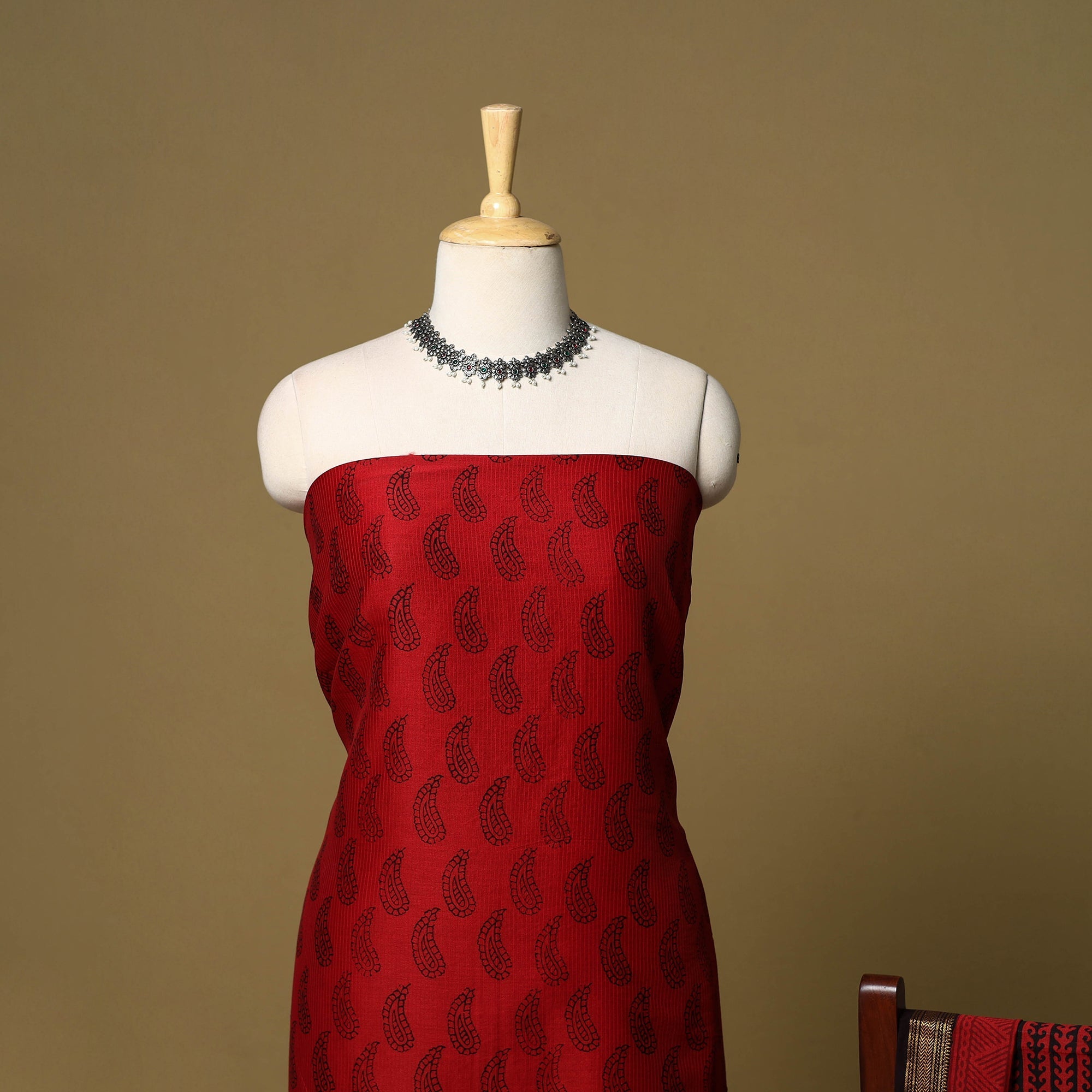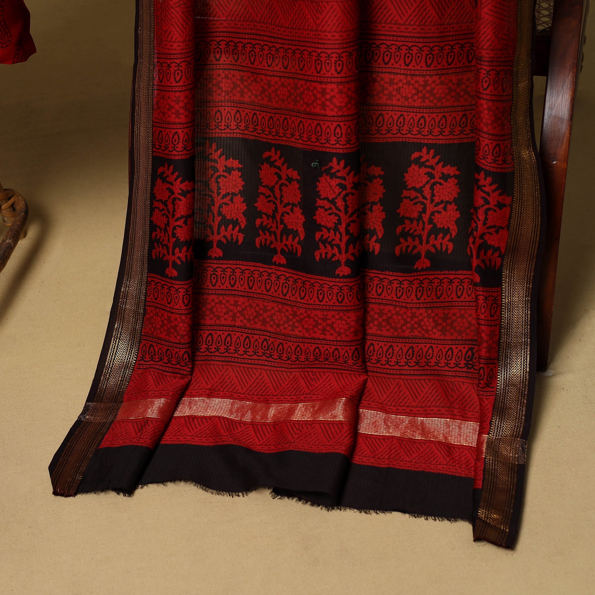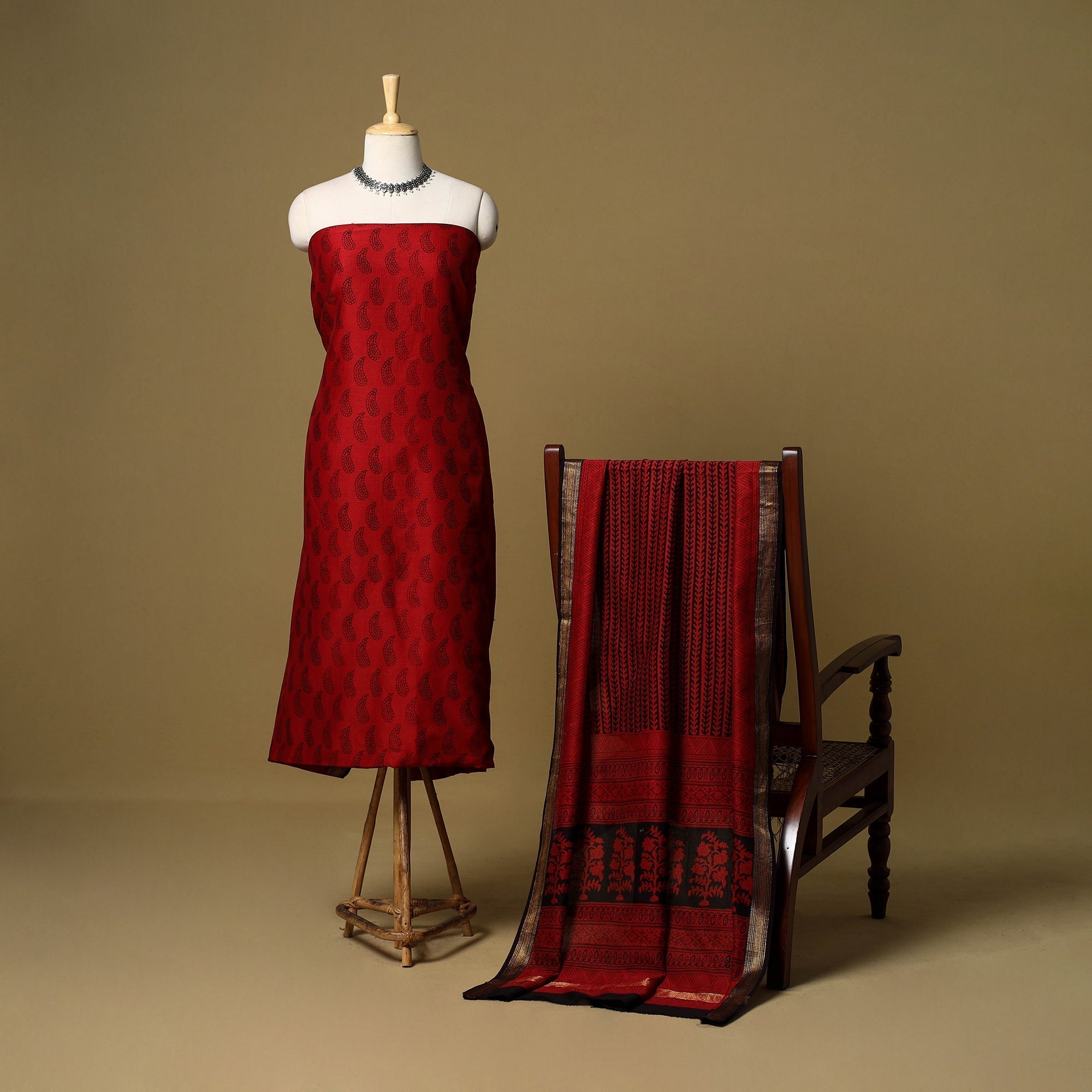 This red 2pc maheshwari silk-cotton bagh print dress material set includes a kurta and dupatta, both featuring a zari border. Made in Bagh, Madhya Pradesh, it showcases traditional block printing with natural dyes. Perfect for casual wear, festive occasions or family gatherings.