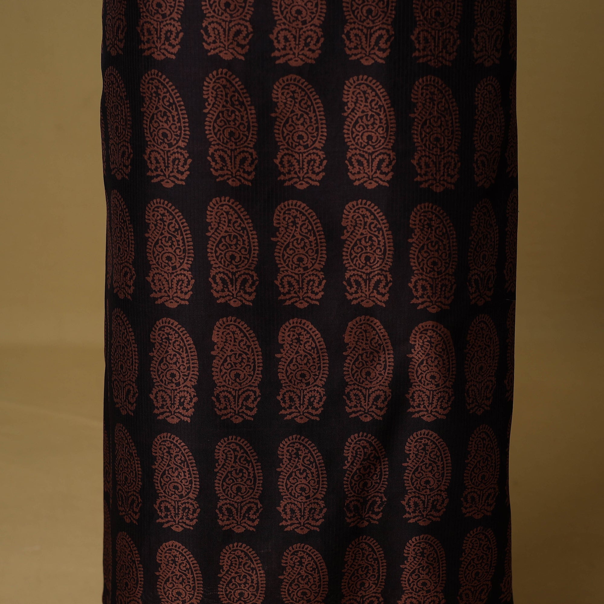 This black 2pc maheshwari silk-cotton bagh print dress material set includes a kurta and dupatta, both featuring a zari border. Made in Bagh, Madhya Pradesh, it showcases traditional block printing with natural dyes. Perfect for casual wear, festive occasions or family gatherings.