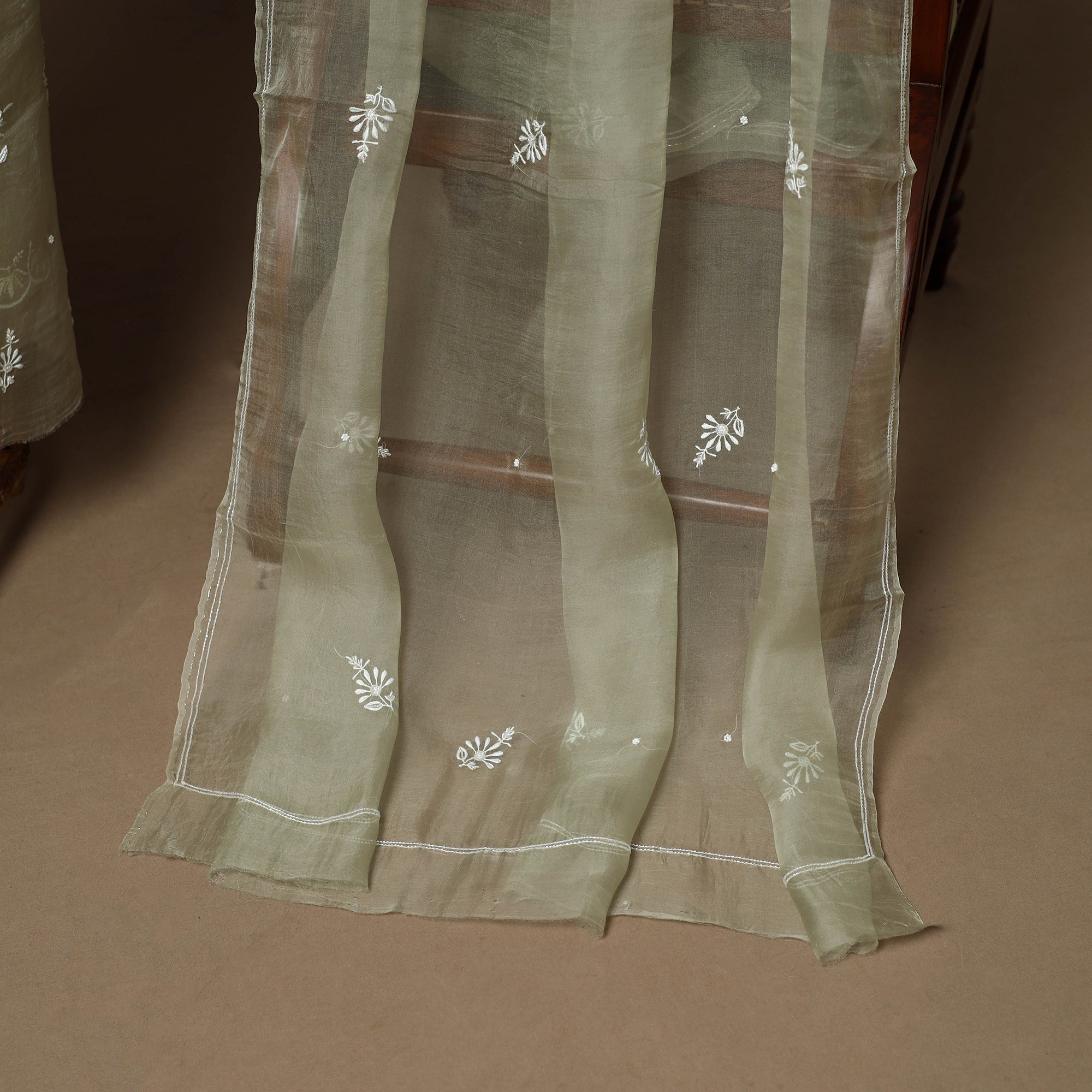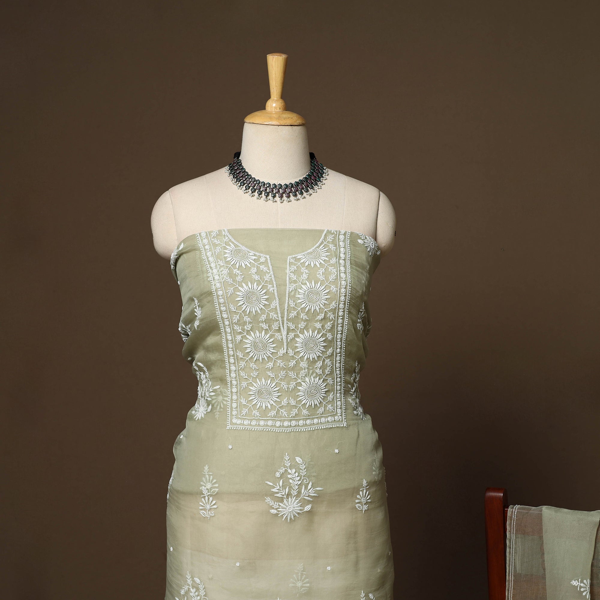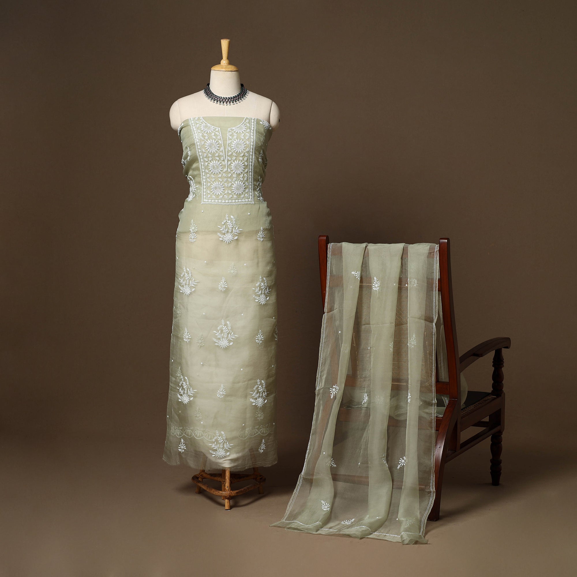 Intricately and artfully crafted, this green heavy chikankari handloom organza silk unstitched 2pc dress material celebrates the heritage handwork of Lucknow, Uttar Pradesh. Known for its delicate thread motifs and subtle elegance, Chikankari features meticulously hand-embroidered designs made with soft pastel threads that form graceful floral and paisley patterns. The set includes fabric for kurta and dupatta, The bead and sequins detailing adds a refined touch, making it perfect for weddings, festive celebrations, cultural gatherings, and elegant evening occasions.