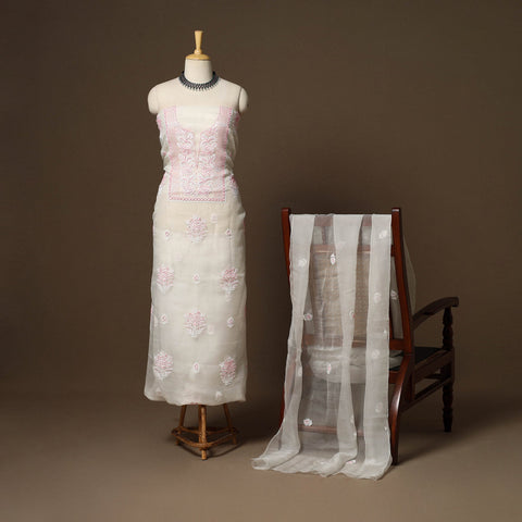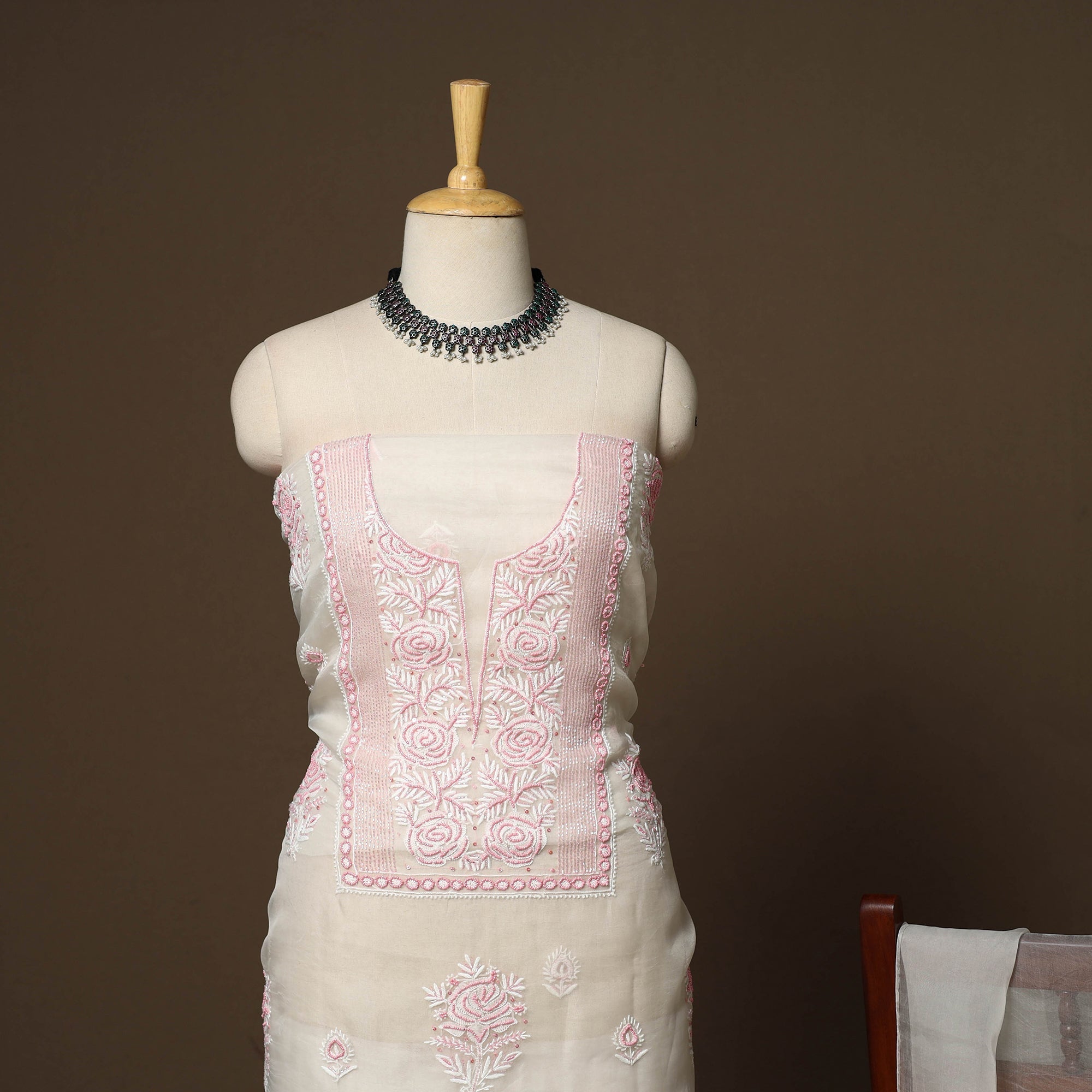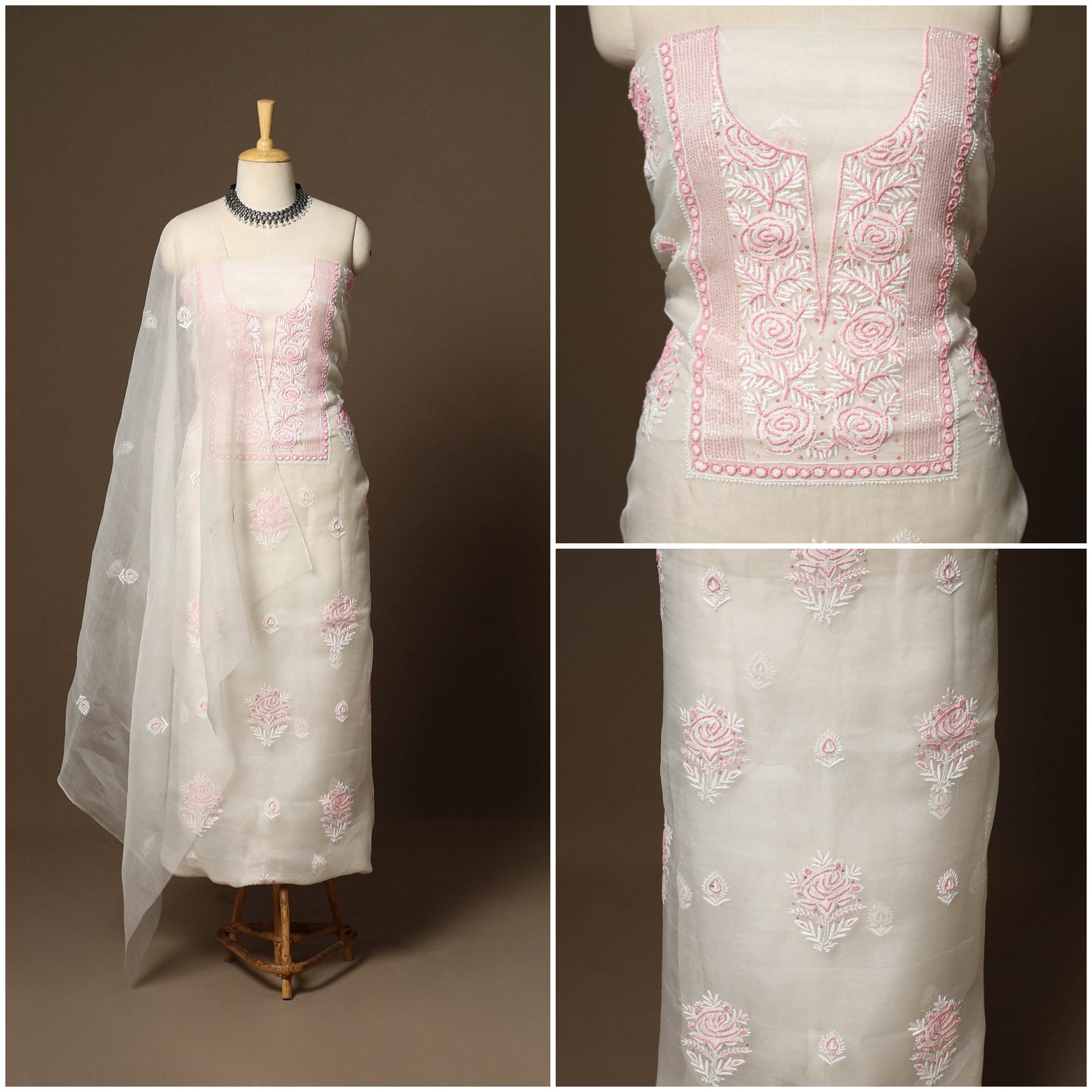 Intricately and artfully crafted, this white heavy chikankari handloom organza silk unstitched 2pc dress material celebrates the heritage handwork of Lucknow, Uttar Pradesh. Known for its delicate thread motifs and subtle elegance, Chikankari features meticulously hand-embroidered designs made with soft pastel threads that form graceful floral and paisley patterns. The set includes fabric for kurta and dupatta, The bead detailing adds a refined touch, making it perfect for weddings, festive celebrations, cultural gatherings, and elegant evening occasions.
