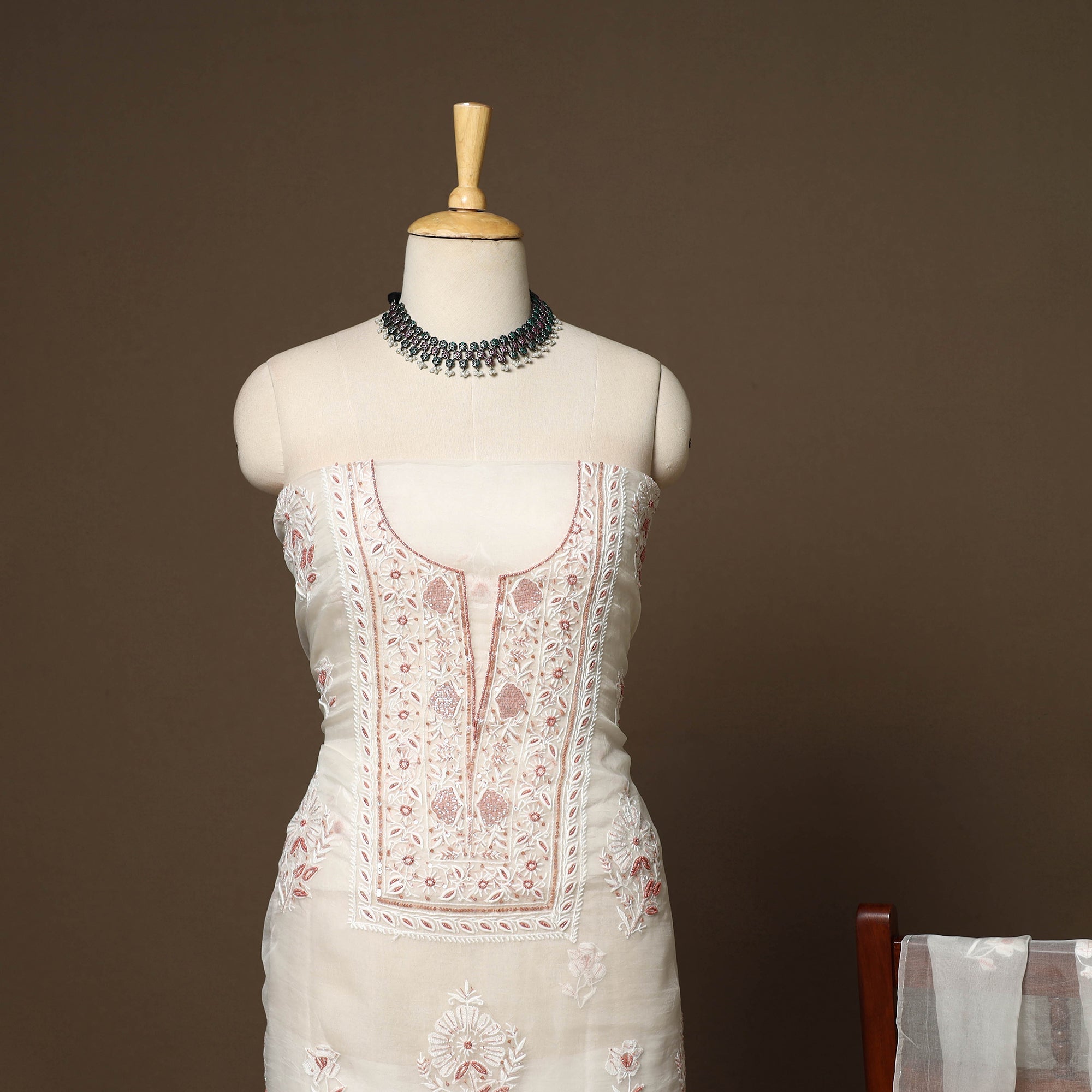 Intricately and artfully crafted, this white heavy chikankari handloom organza silk unstitched 2pc dress material celebrates the heritage handwork of Lucknow, Uttar Pradesh. Known for its delicate thread motifs and subtle elegance, Chikankari features meticulously hand-embroidered designs made with soft pastel threads that form graceful floral and paisley patterns. The set includes fabric for kurta and dupatta, The bead and sequins detailing adds a refined touch, making it perfect for weddings, festive celebrations, cultural gatherings, and elegant evening occasions.