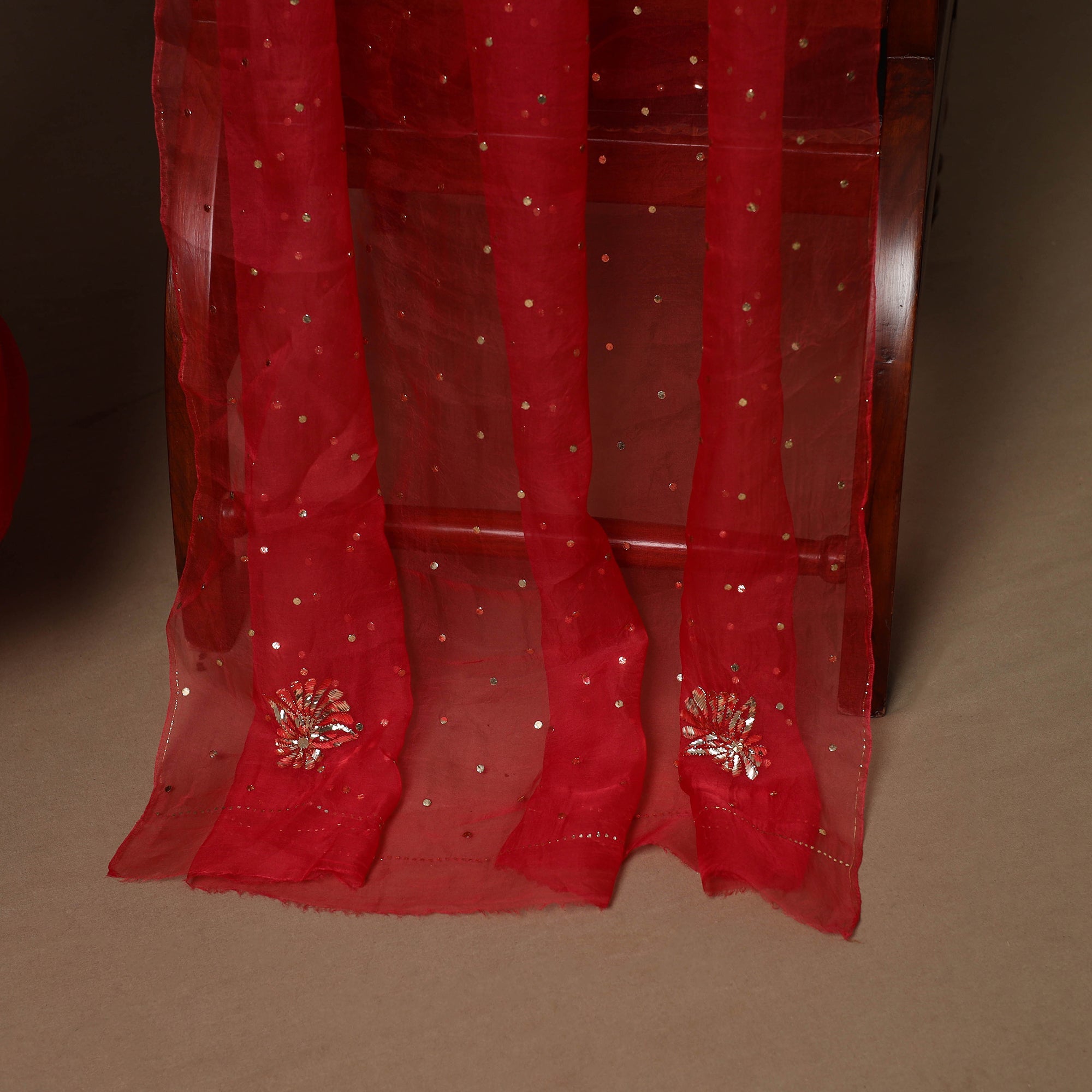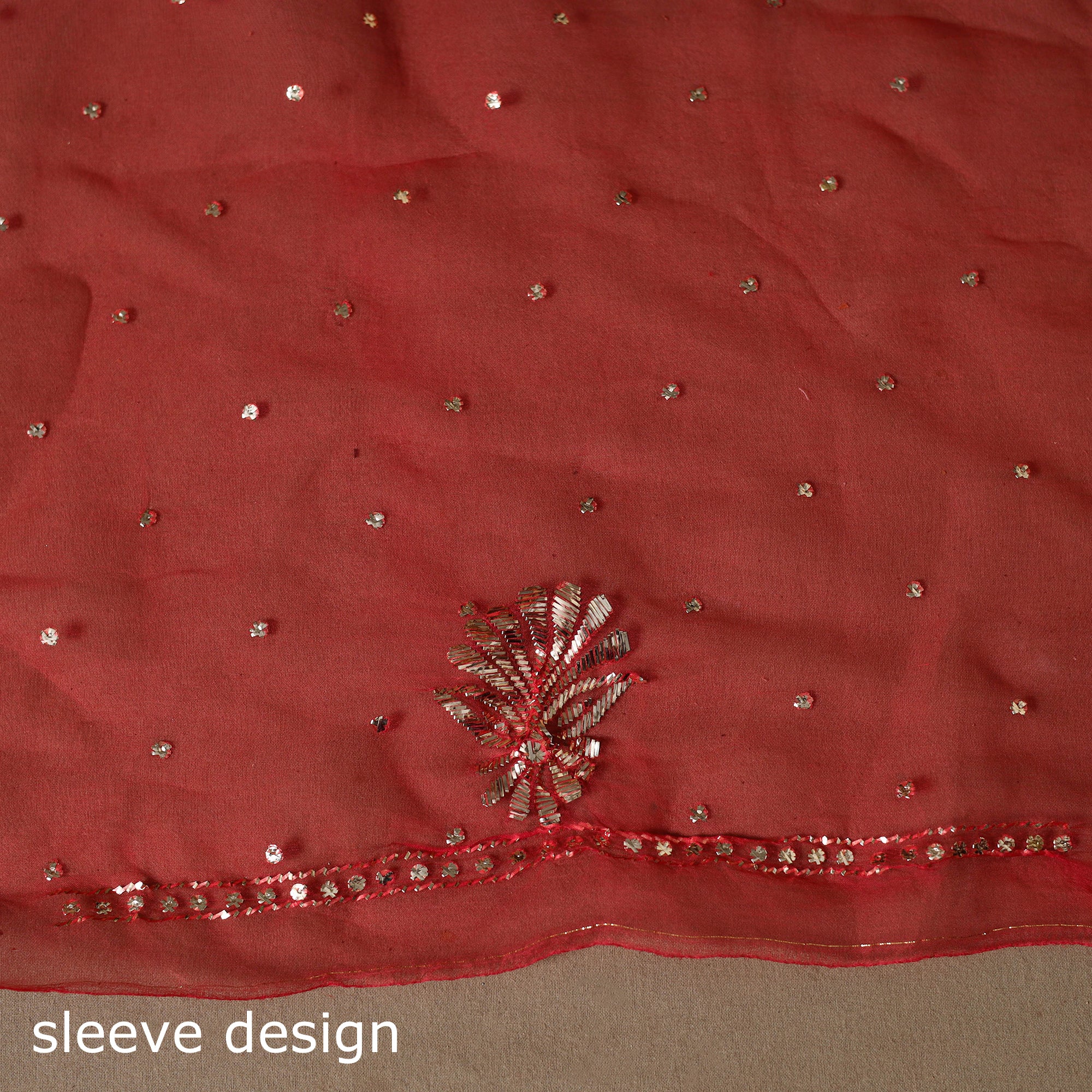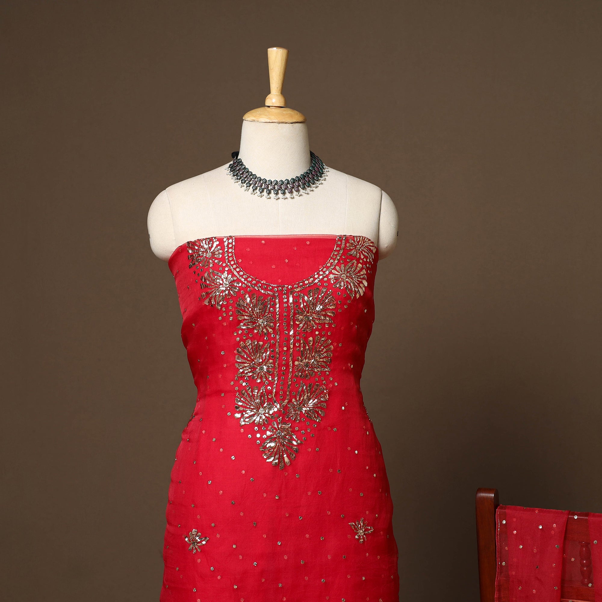 Intricately and artfully crafted, this red 2pc organza silk unstitched Mukaish handwork dress material celebrates the traditional artistry of Lucknow, Uttar Pradesh. Mukaish embroidery involves twisting fine metallic threads into the fabric to create tiny shimmering dots or delicate motifs. The set includes fabric for kurta and dupatta, making it an ideal choice for weddings, festive occasions, cultural gatherings, and elegant evening wear.